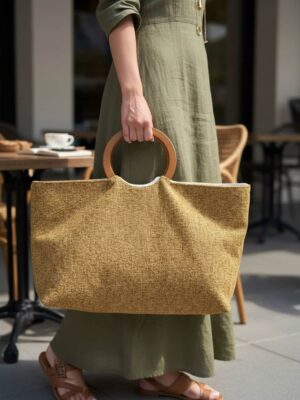 Aria Mostaza – Maxibolso de algodón y asa de madera