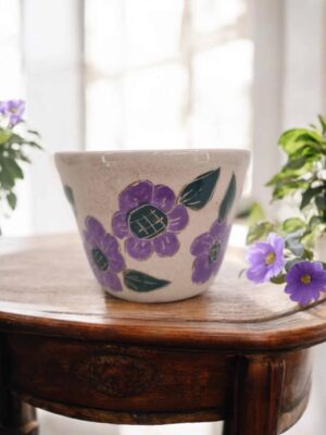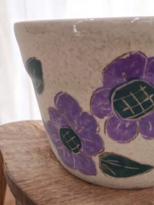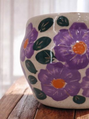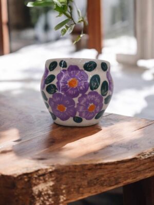 Tres Flores Morada – Macetín gordita de cerámica