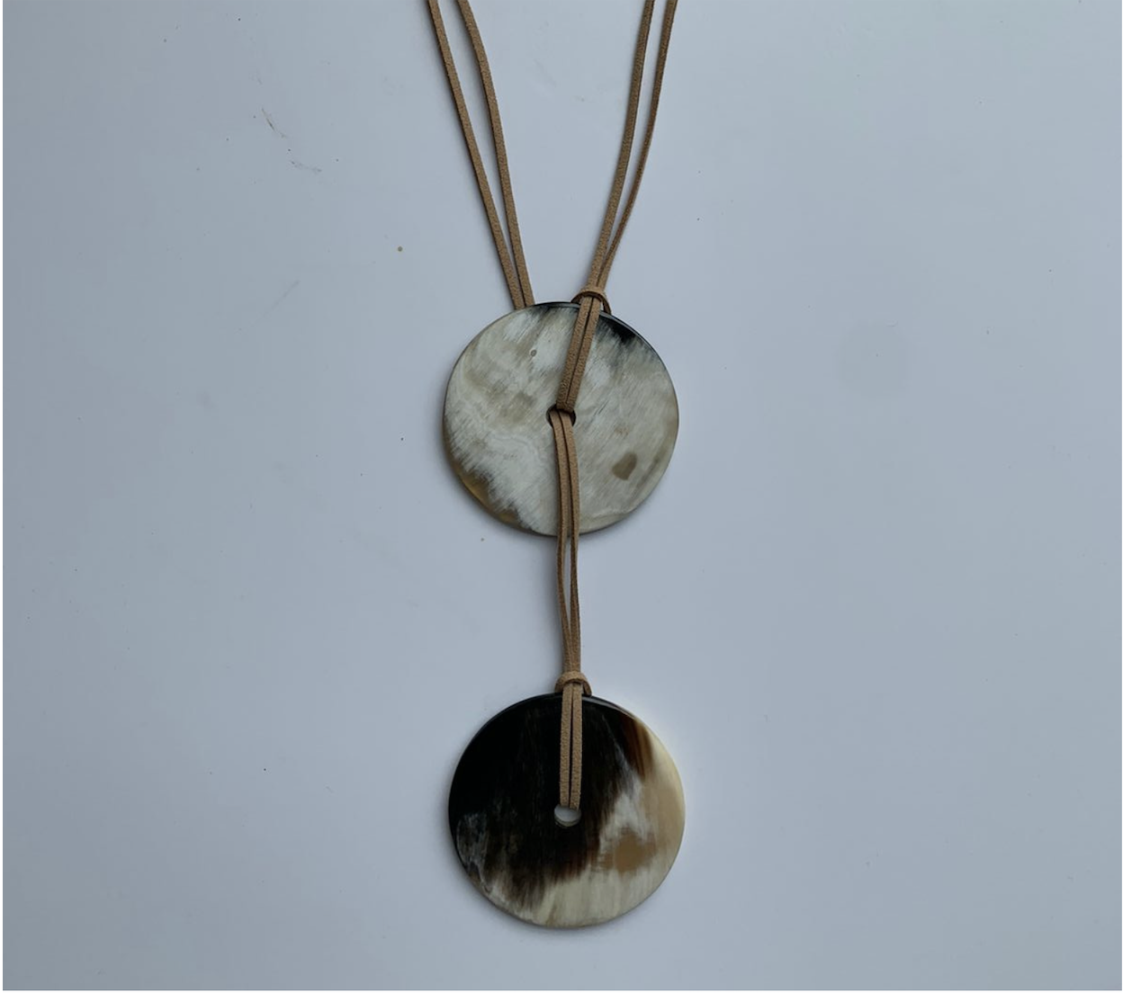Collar Largo con argollas de forma circulares de cacho de toro y tira de gamuza, hecho a mano. La belleza del material y el trabajo fino artesanal dan como resultado una pieza única.