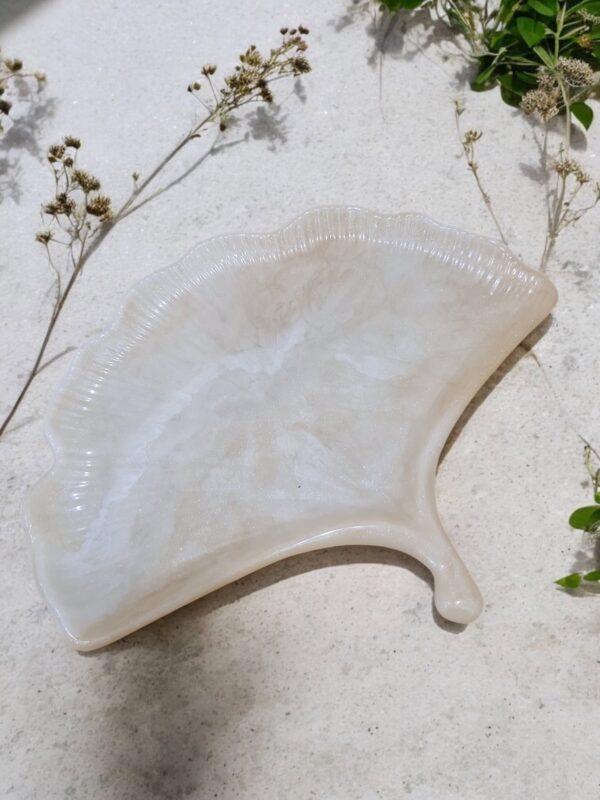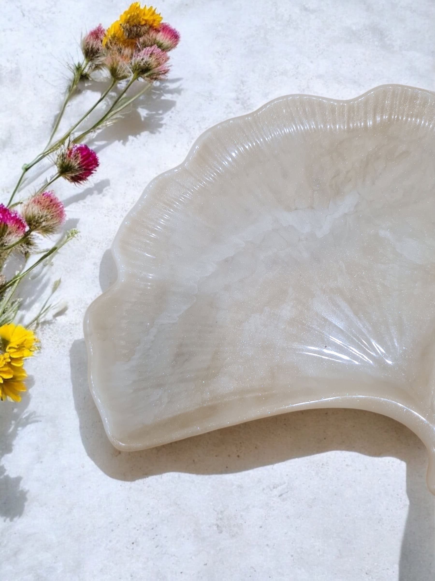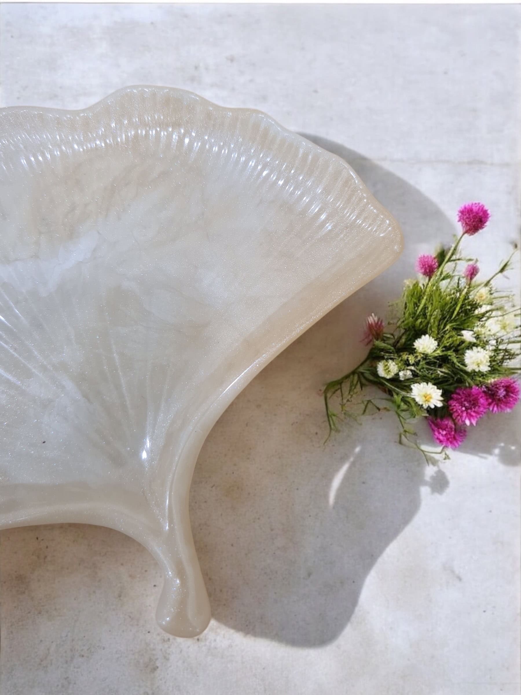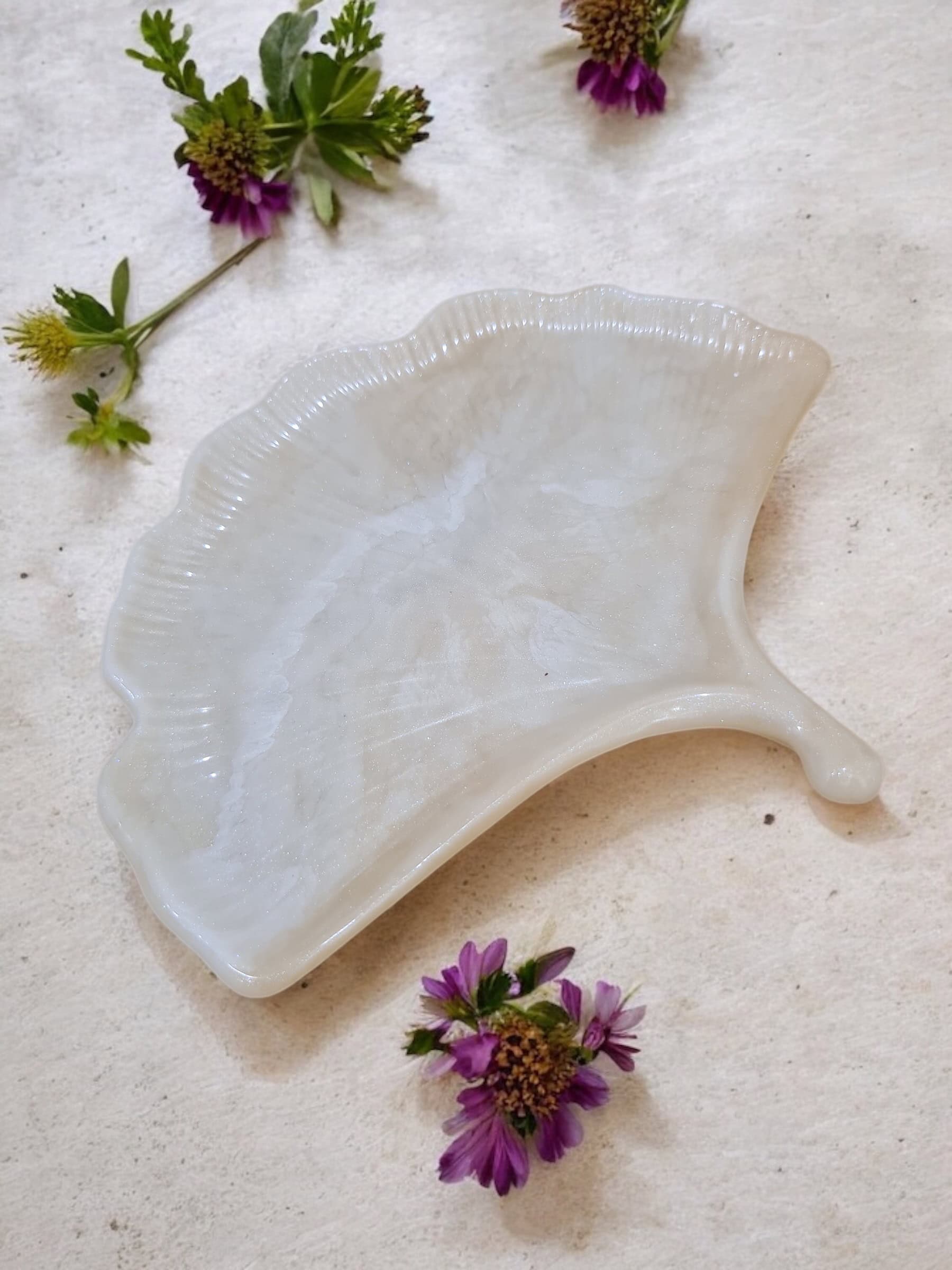 Joyero con forma de abanico elaborado a mano en resina de alta resistencia y acabado brillante. Sus delicados relieves permiten organizar y proteger anillos, aretes u otras piezas pequeñas. Ligero, duradero y fácil de limpiar; ideal para el tocador o como detalle de regalo.