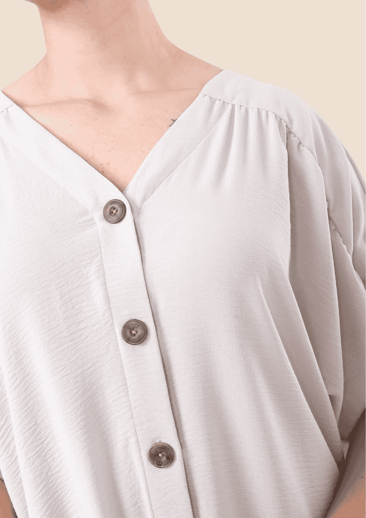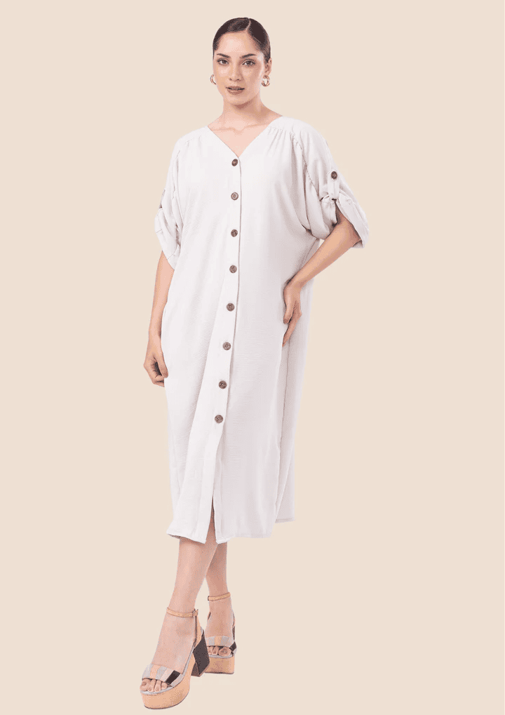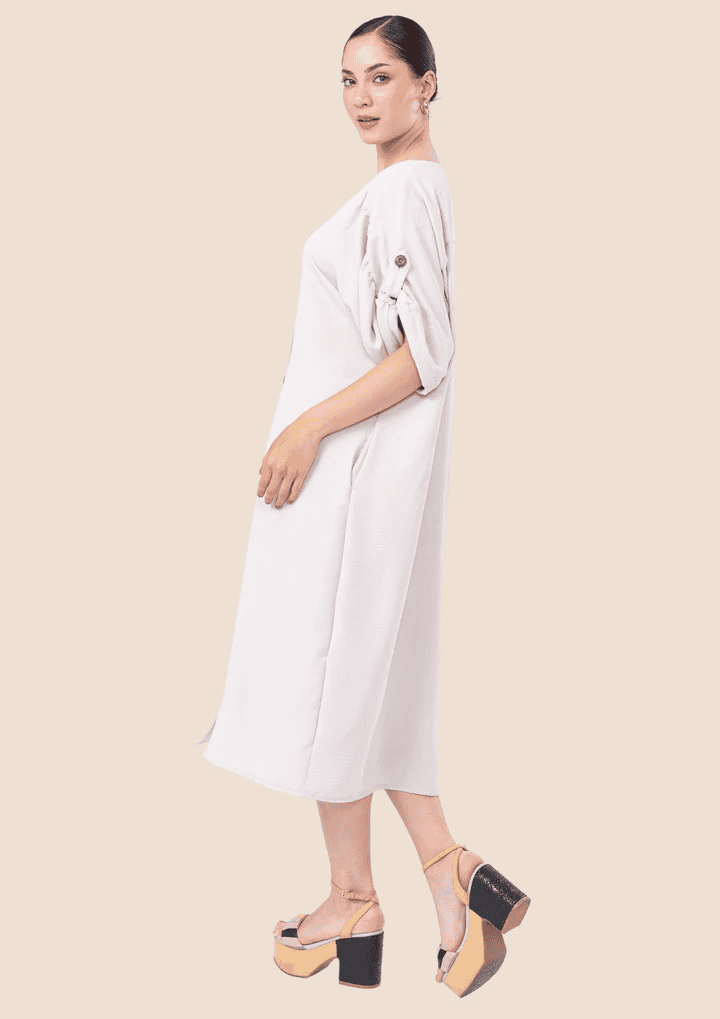 Vestido largo en viena, con cuello camisero y mangas remangables sujetas con botones de nácar. Su caída ligera aporta movimiento y frescura, convirtiéndolo en una pieza versátil y cómoda para cualquier ocasión.