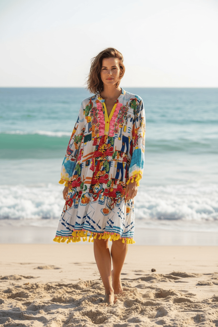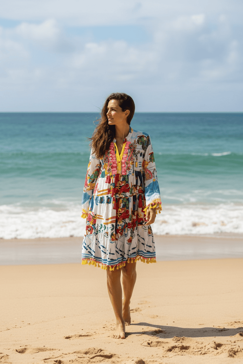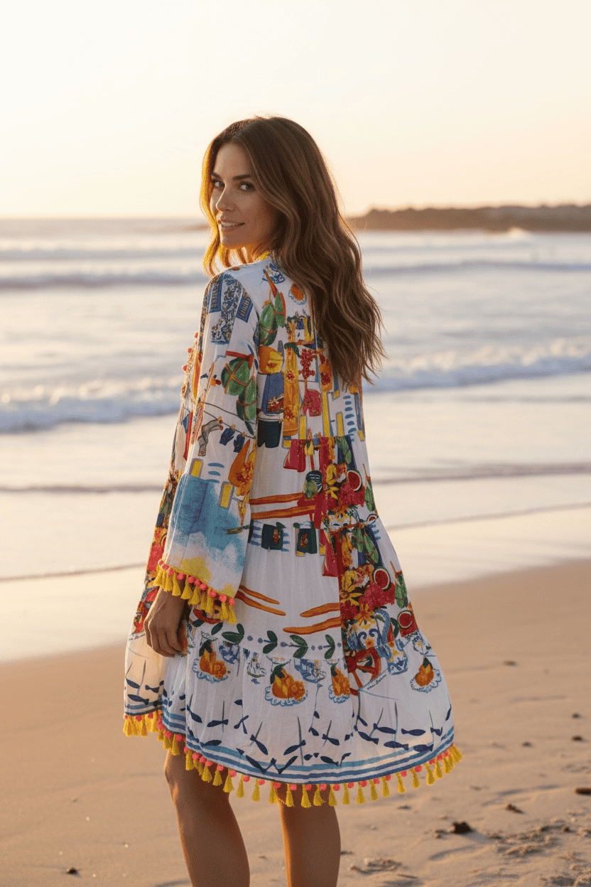 Diseño y tela italiana. Vestido corto con cuello neru y botones frontales, diseñado con mangas largas y un estampado inigualable que resalta su estilo moderno y elegante. Su silueta ligera ofrece comodidad y un toque sofisticado, ideal para lucir en cualquier ocasión.