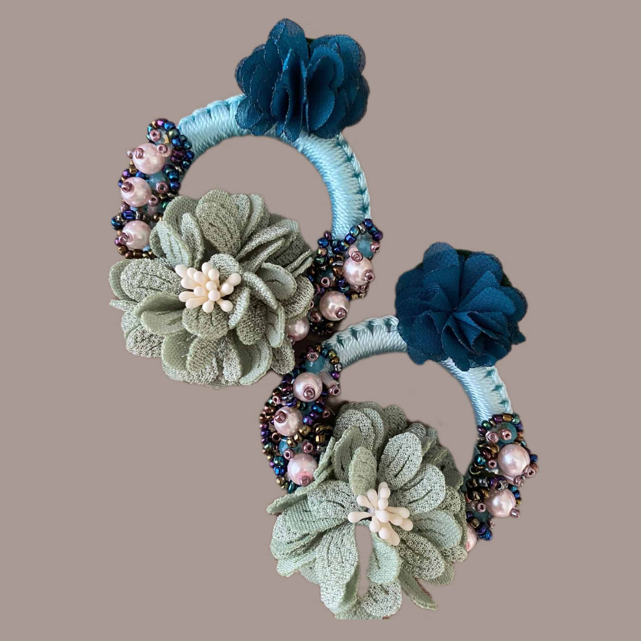 | Composición | Argollas Forradas en Hilo Macrame / Flor de Gasa / Flor de tela / Muranos / Mostacillas |