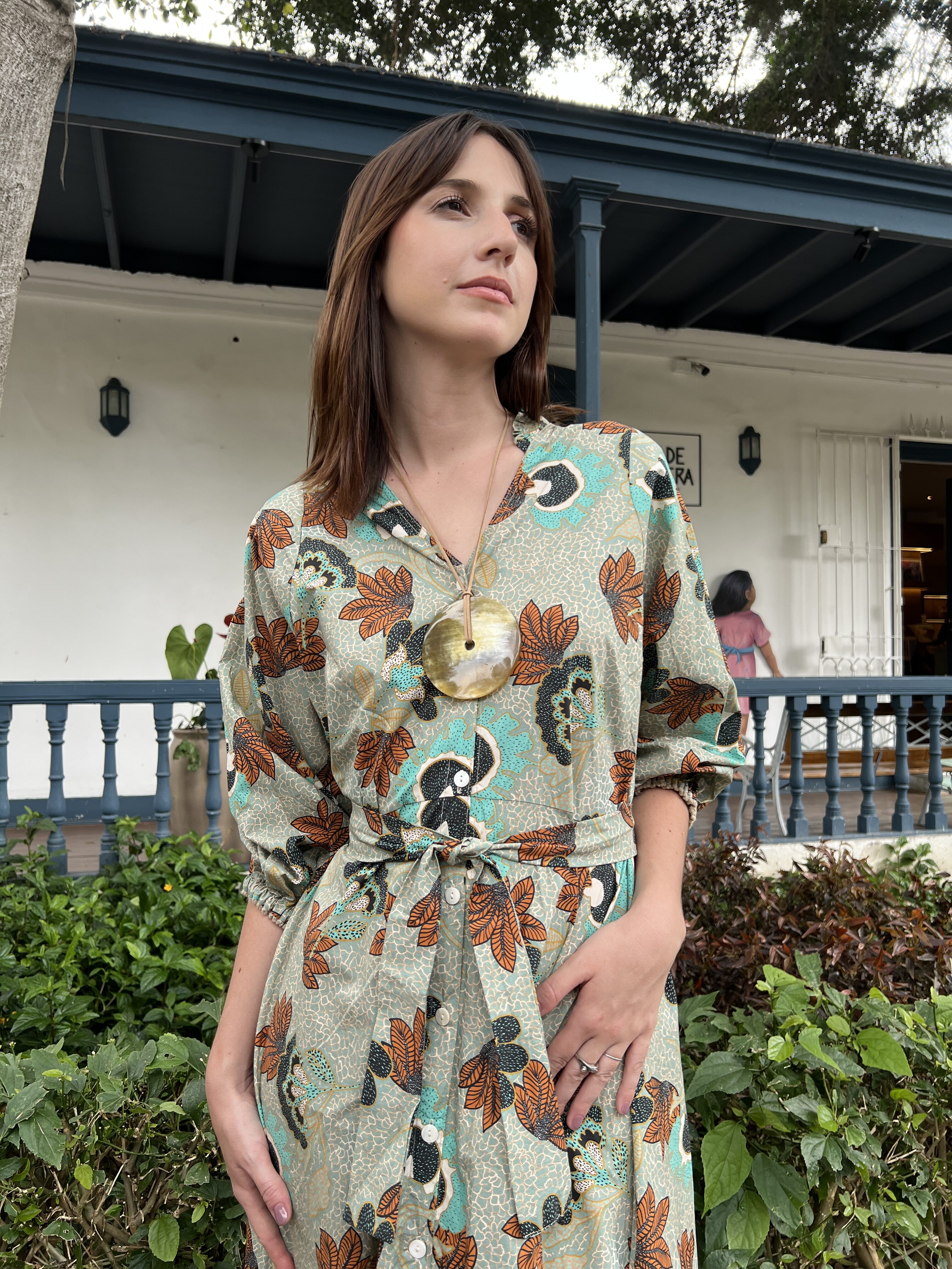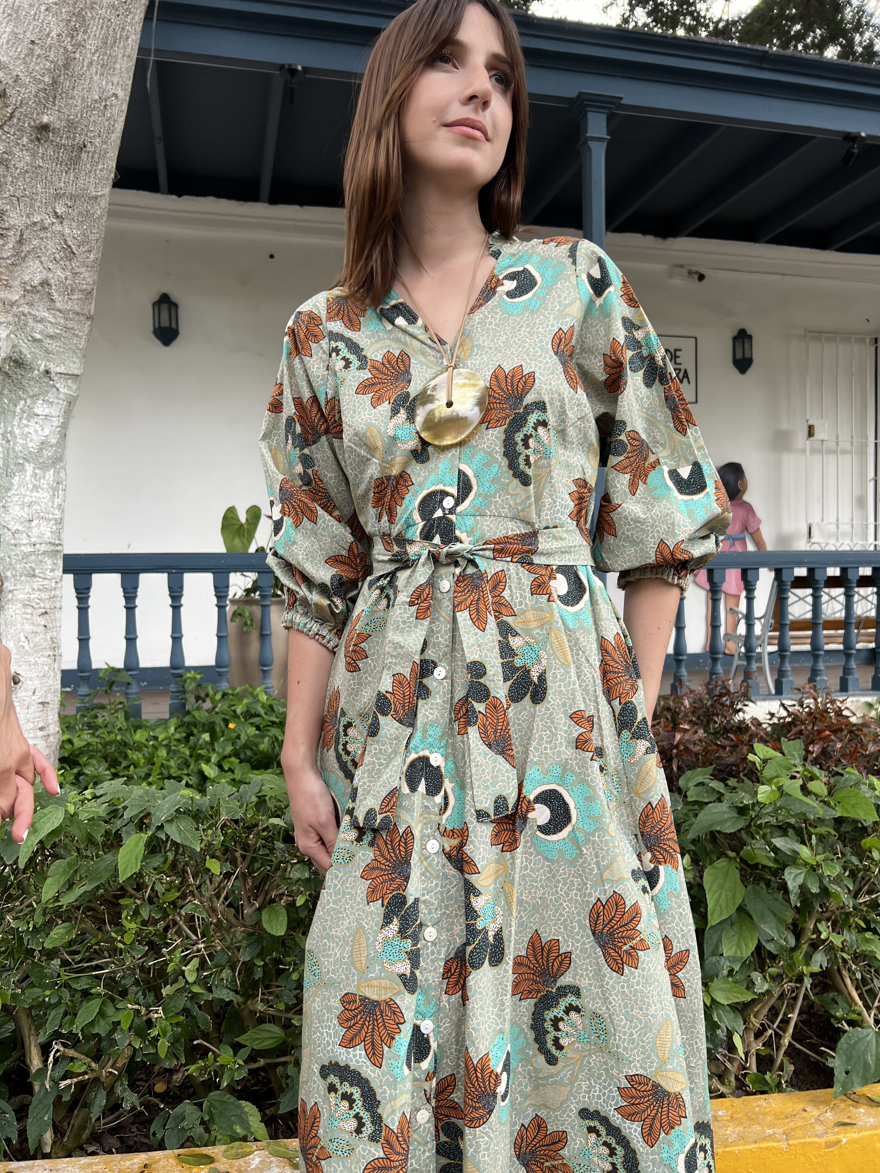 Vestido largo, tiene mangas ajustables que te permitirán sentirte cómoda y ligera. Detalle de botones de concha de nácar, perfecto para las amantes de la moda relajada y sofisticada, pues su diseño fluido es ideal para cualquier ocasión, desde una salida casual hasta un evento semi-formal.