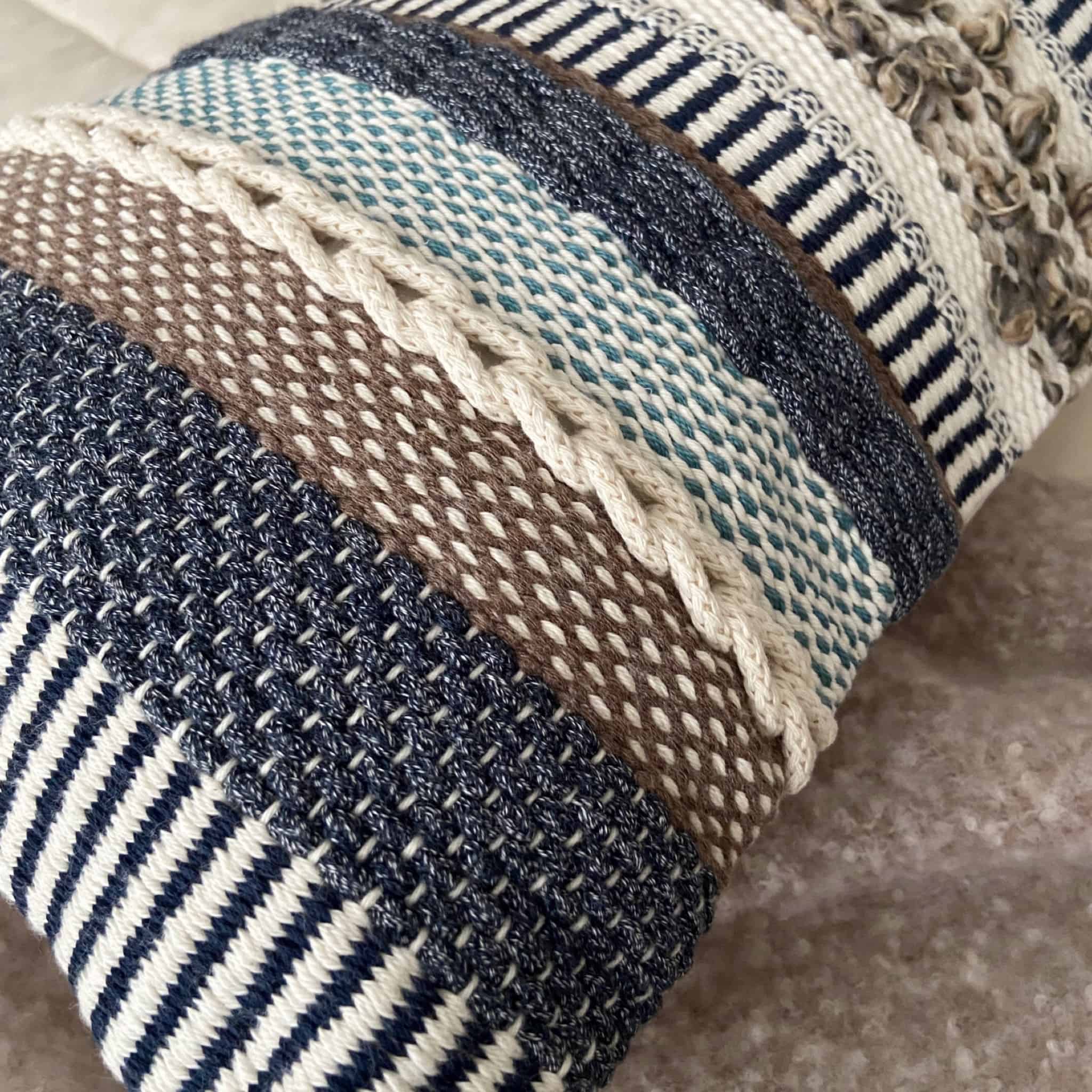 Cojín tejido a mano en telar, que combina distintos puntos y texturas. Trabajado principalmente con fibras de algodón de distintos espesores y otros materiales que permiten lograr texturas especiales.