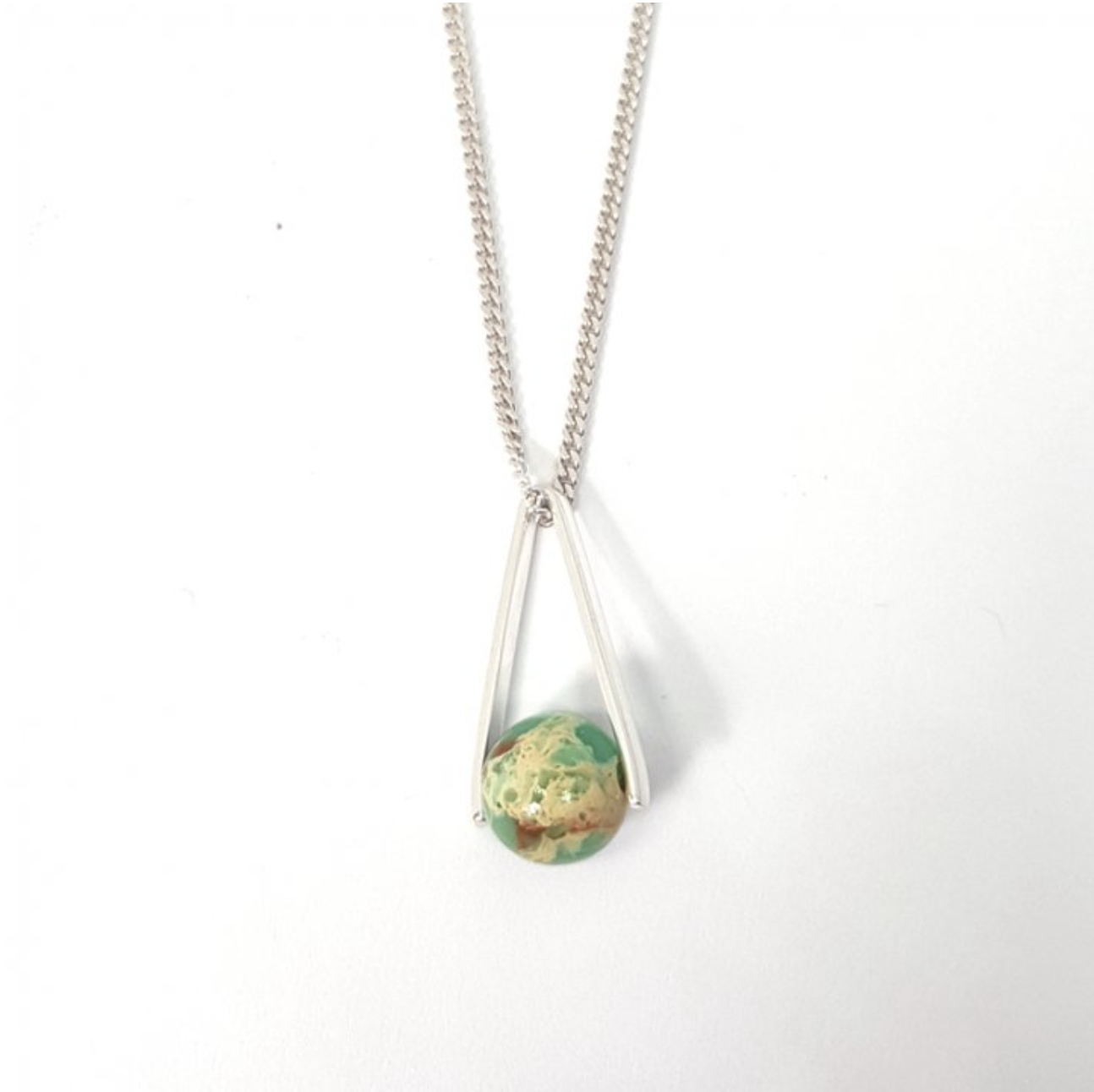 Dije de la colección cápsula ALQUIMIA. Para el elemento agua usamos la crisoprasa, una piedra que está formada por diferentes elementos como níquel, óxido de hierro y manganita. La crisoprasa es conocida porque fomenta la esperanza y estimula la creatividad. Trabajado a mano en el Perú.
