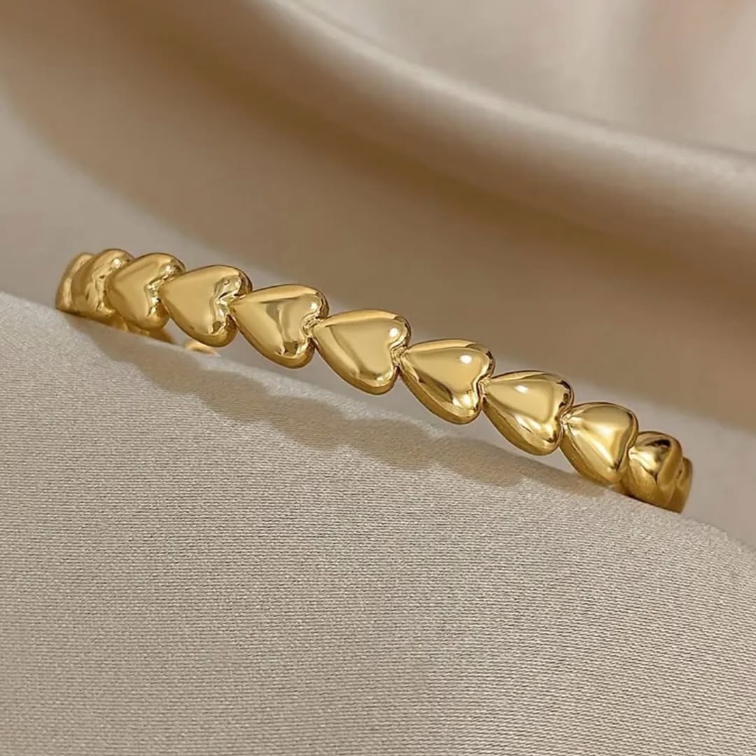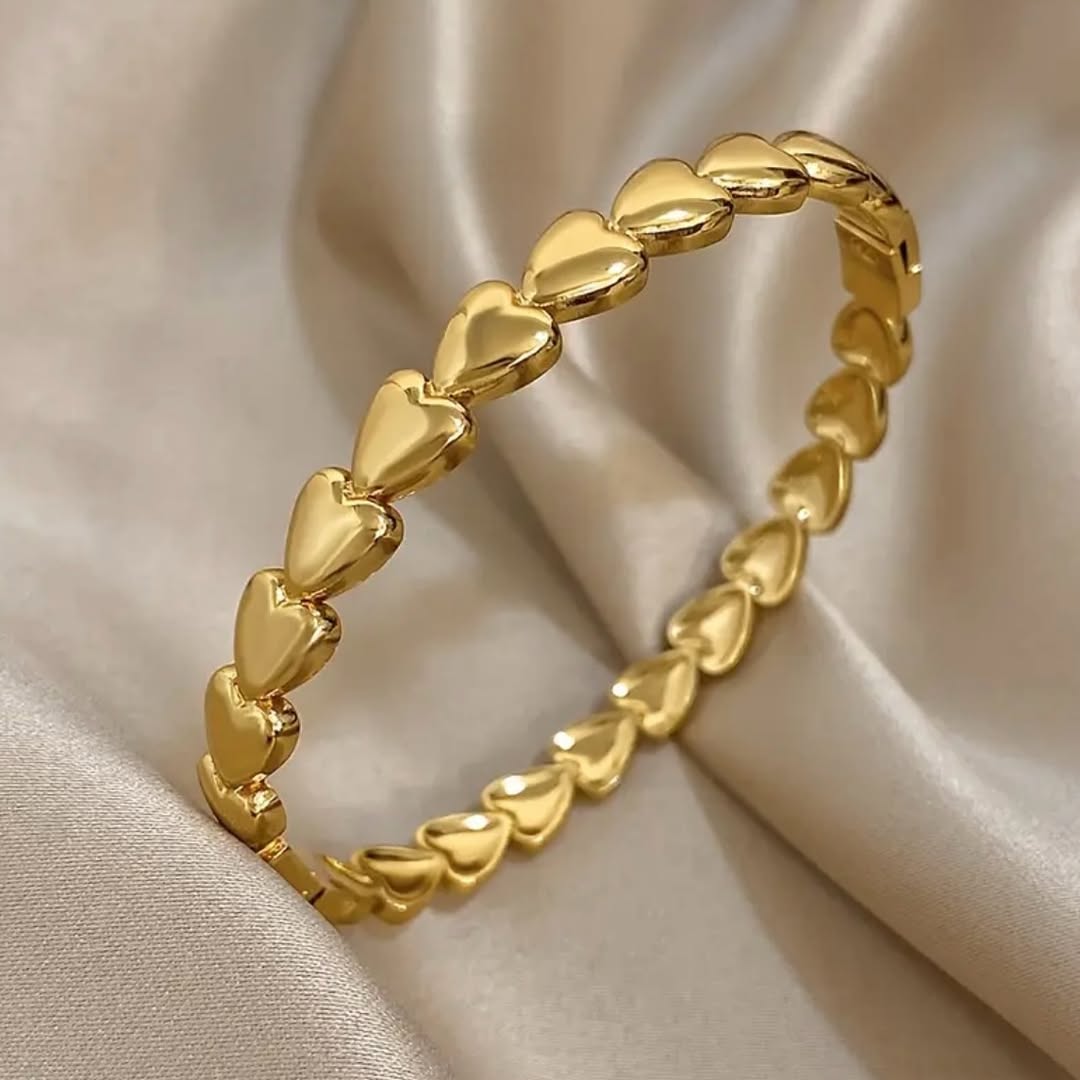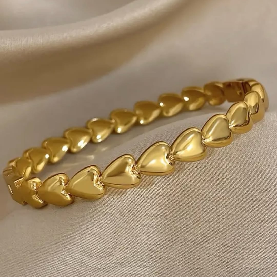 Pulsera en acero inoxidable enchapado en oro de 18k, elegante y moderna que destaca por su acabado brillante y su delicado diseño de eslabones en forma de corazones. Su estilo femenino y sofisticado la convierte en el accesorio ideal para complementar cualquier look, aportando un toque romántico y luminoso.