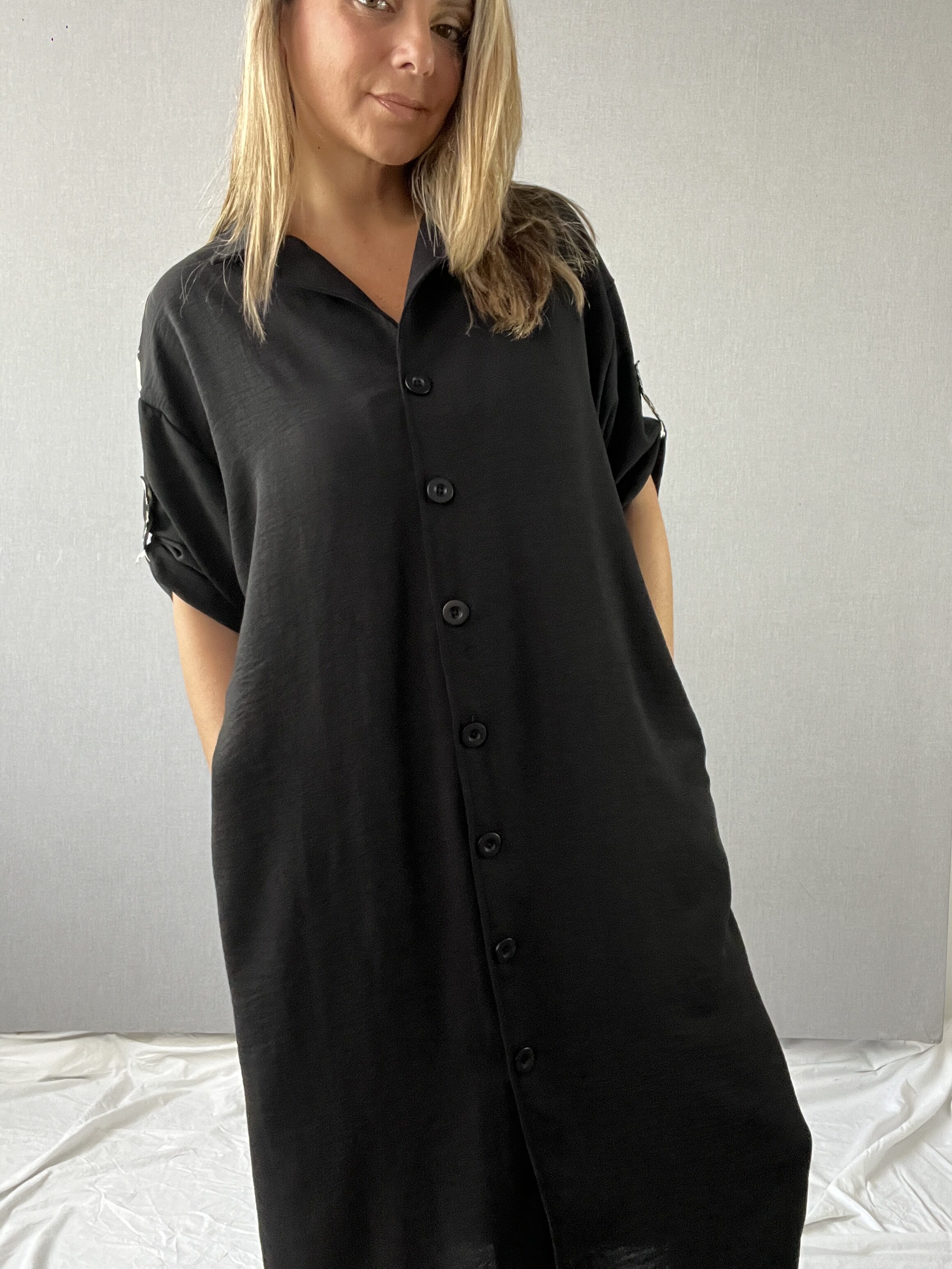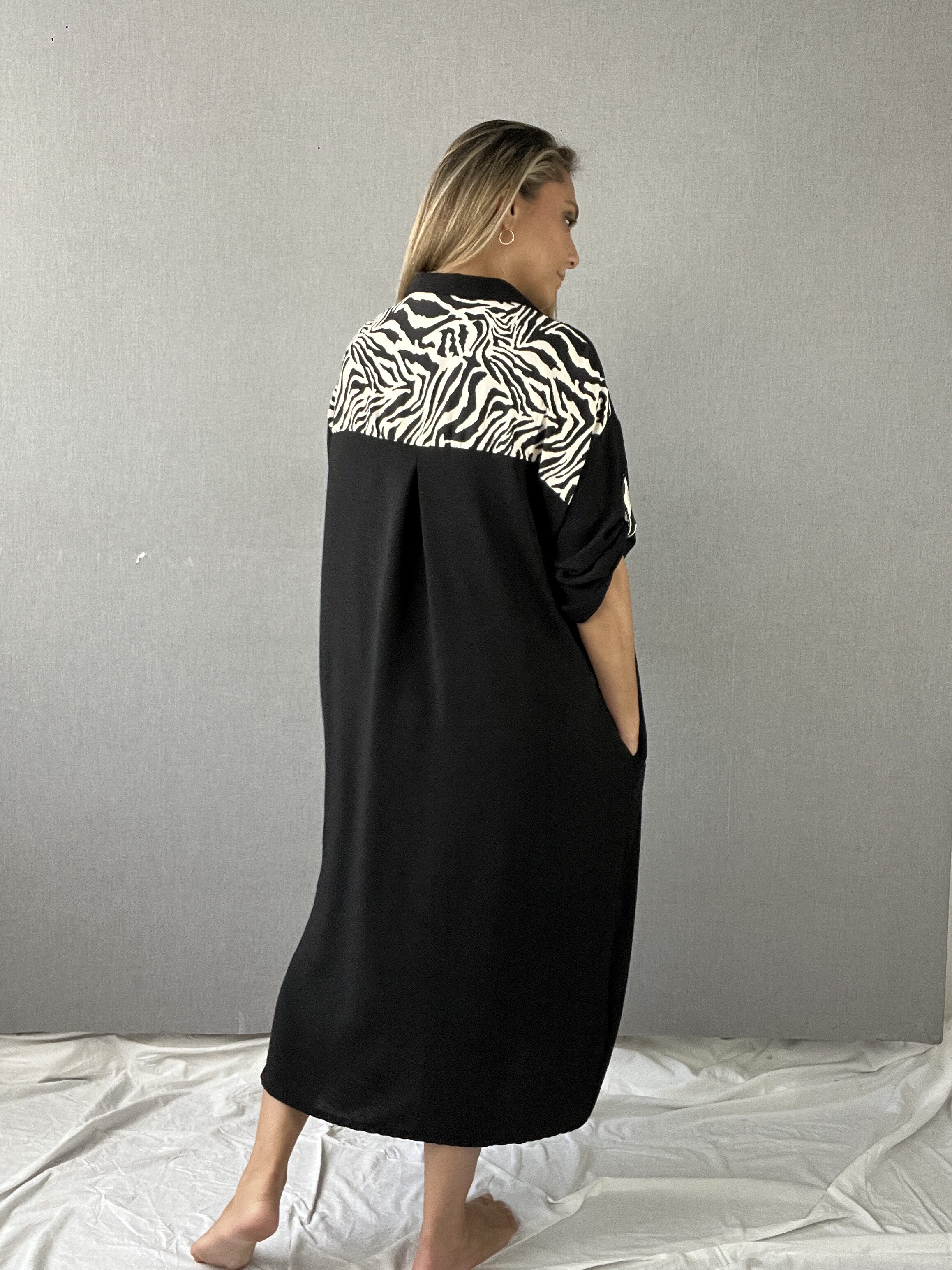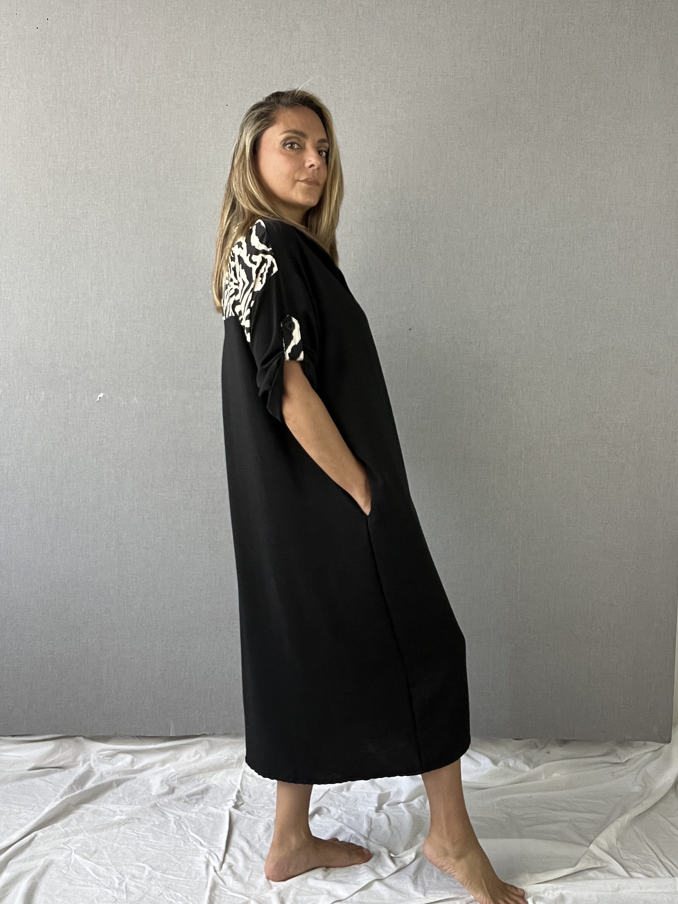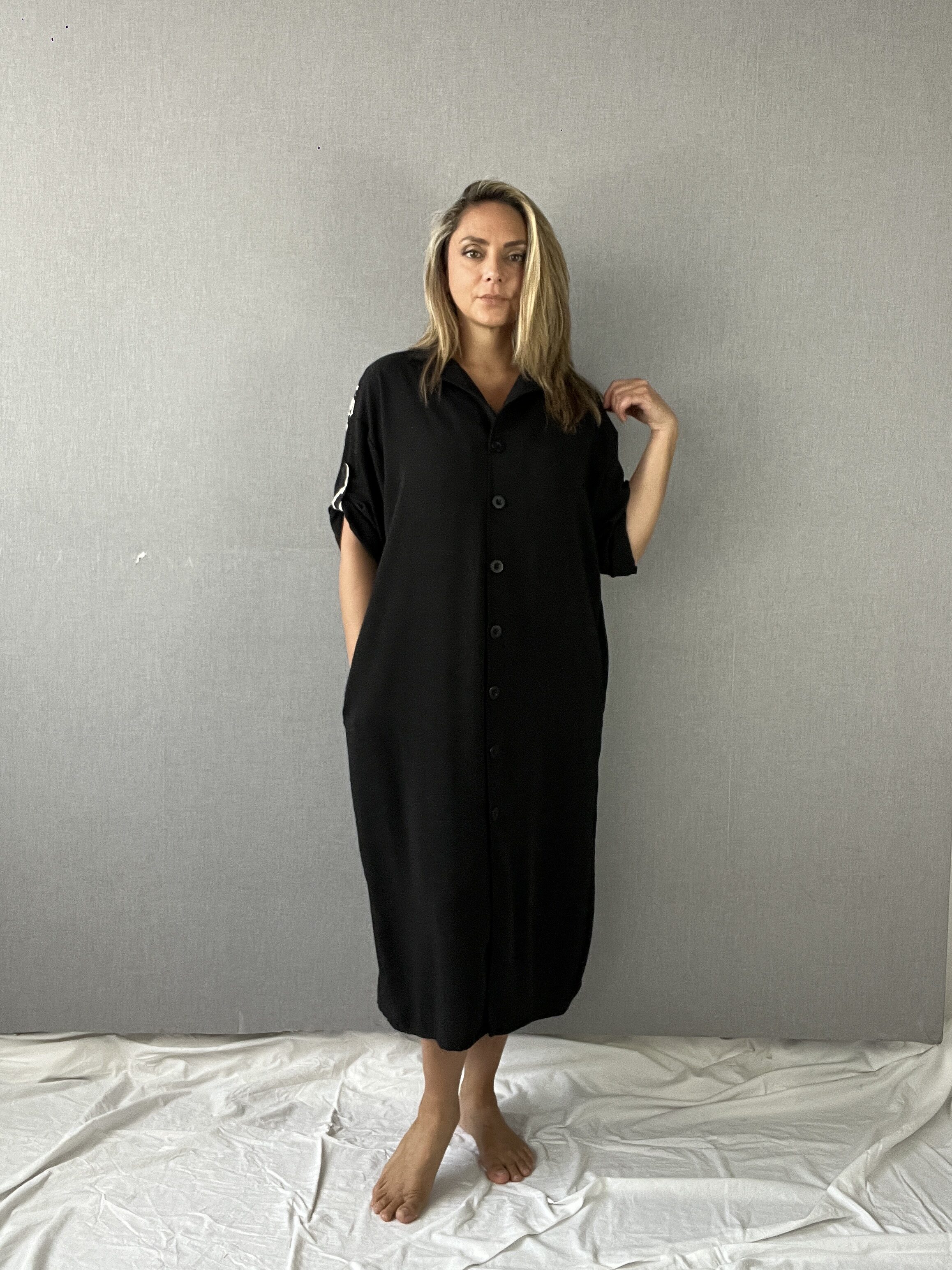 Maxivestido oversize, diseño en manga corta con detalles asimétricos, cuello camisero y canezú con detalle print súper original. Bolsillos laterales y botones frontales que le dan ese toque perfecto. Material de tela viena y aplicaciones en tela bali.