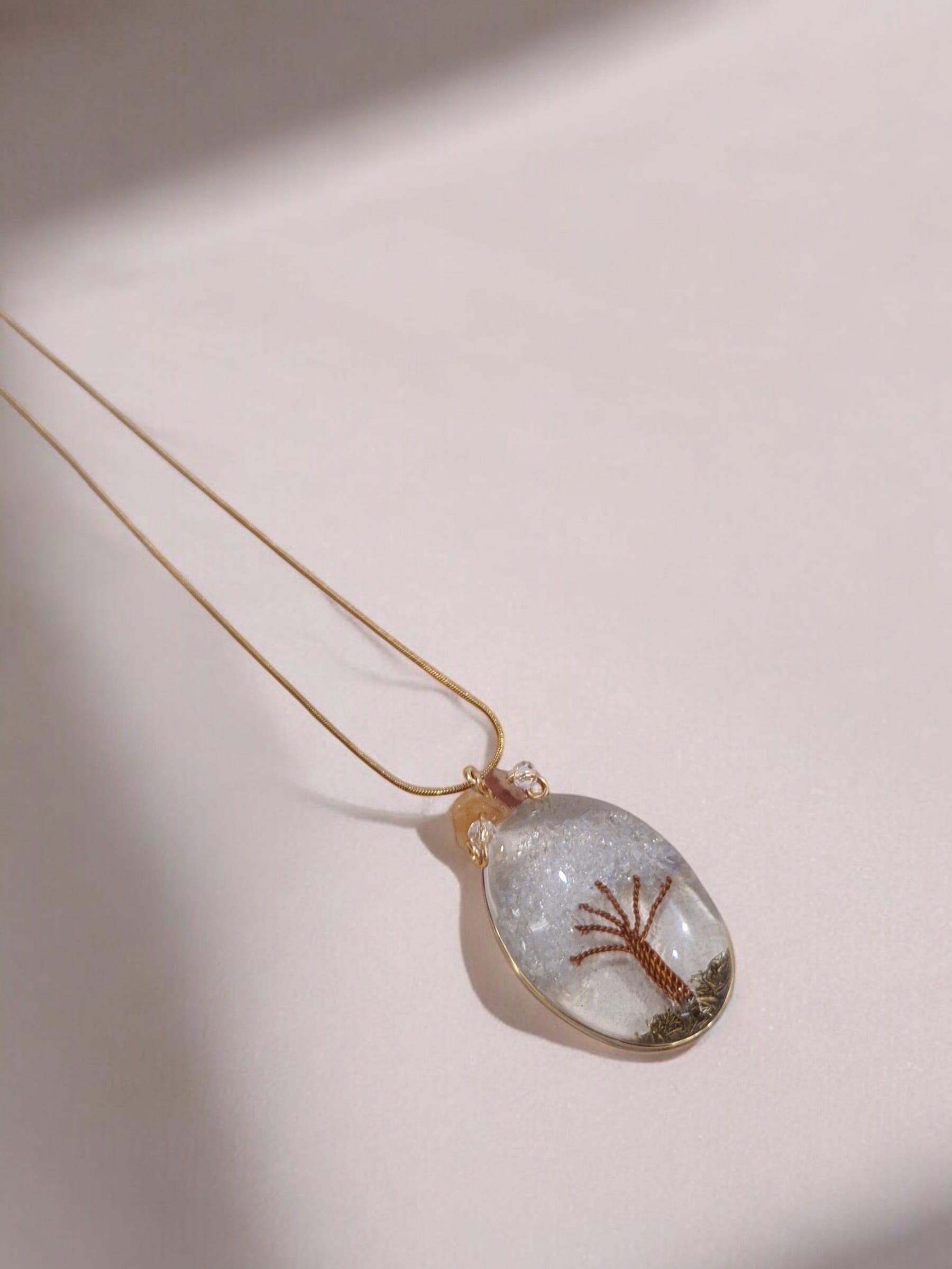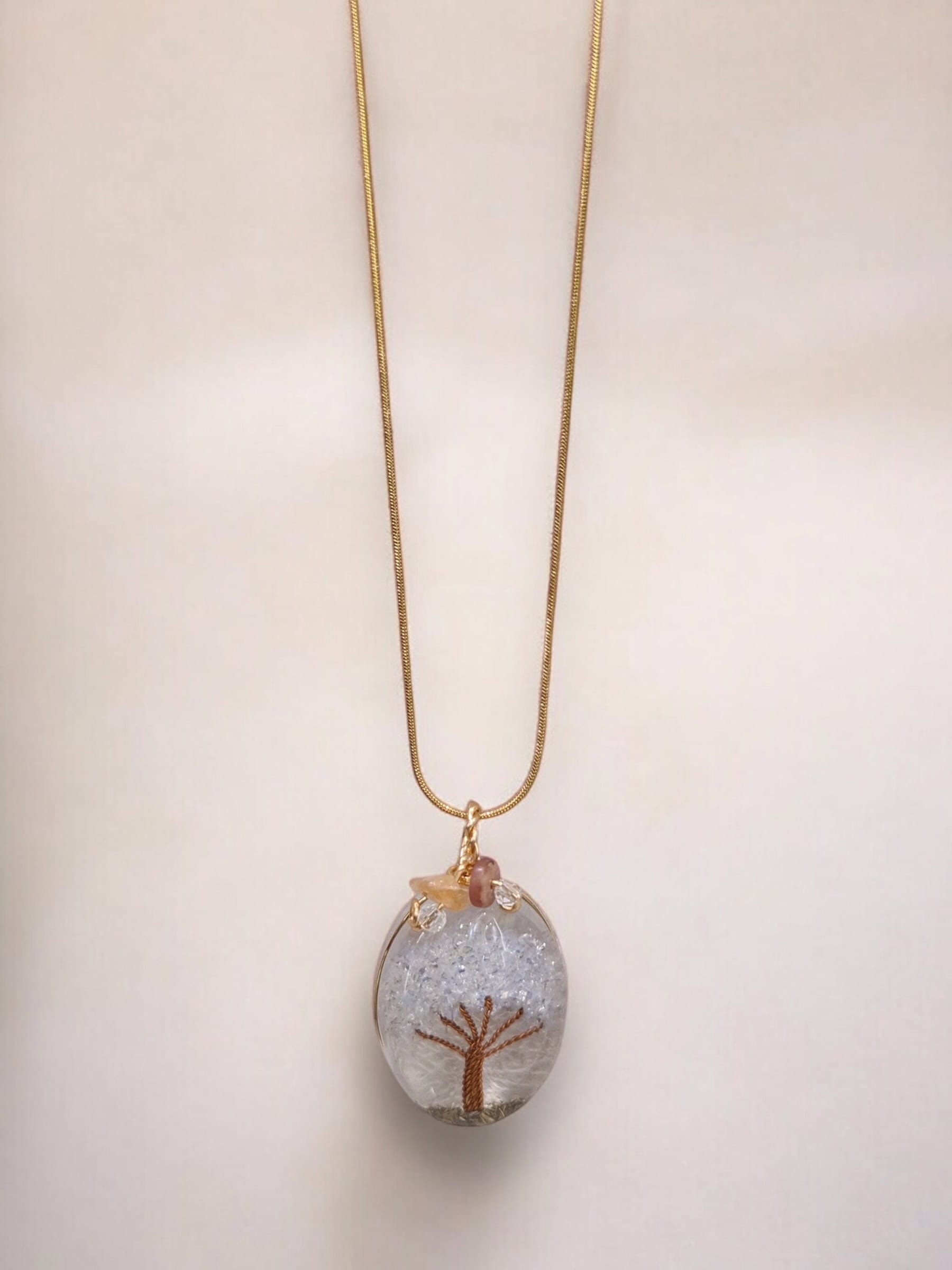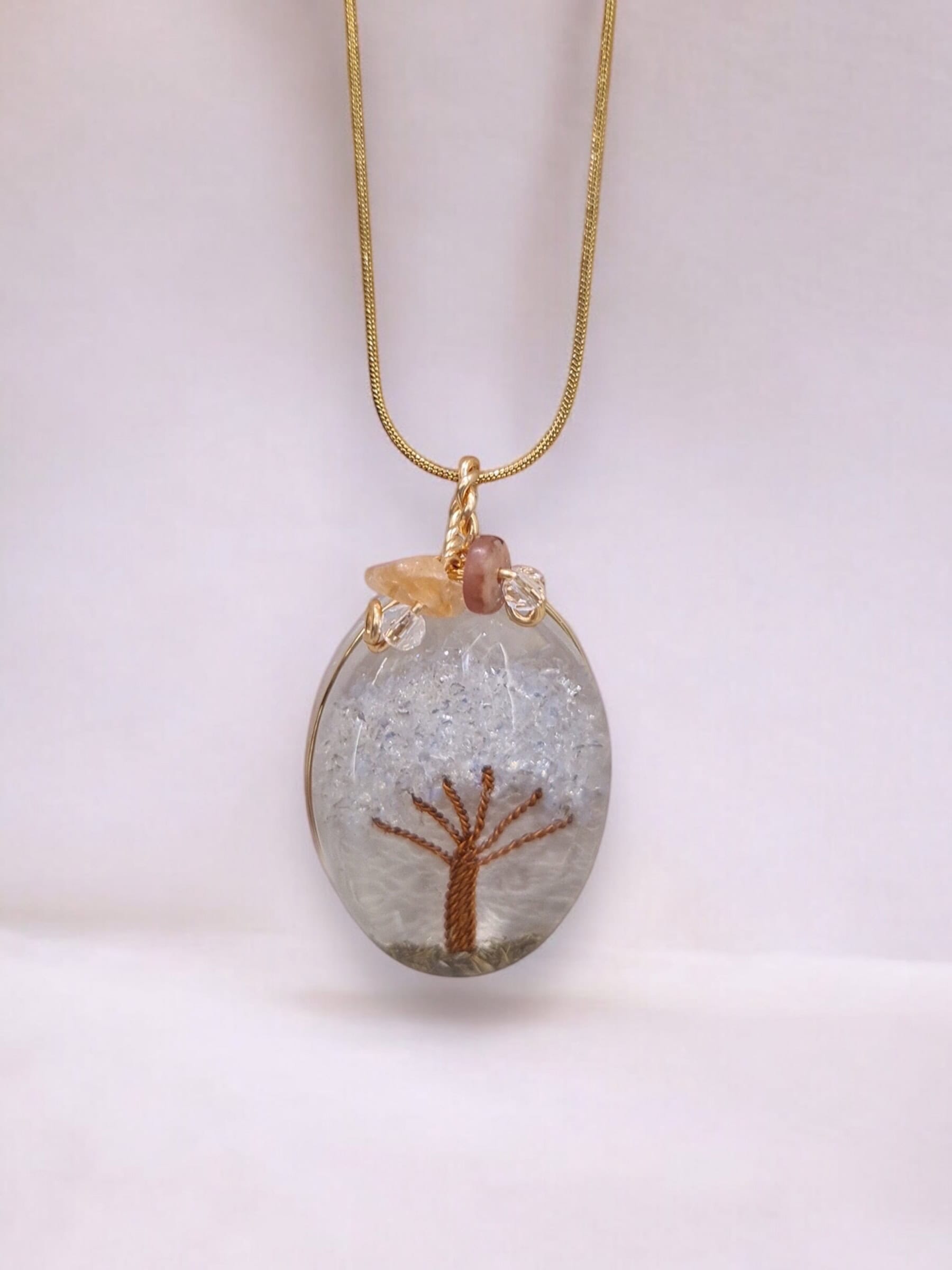 Collar de cobre bañado en oro con resina cuarzo cristal y pirita encapsulada, que resguarda una piedra de pirita natural encapsulada en resina. La pirita es reconocida por sus propiedades energéticas de abundancia, protección y fuerza interior, convirtiendo este collar en un amuleto tanto estético como espiritual.