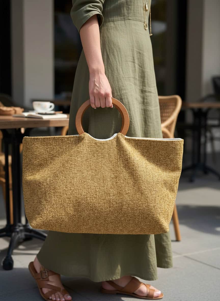 Maxibolso en algodón de textura suave, con asa circular de madera que aporta un toque sofisticado y moderno. Su diseño amplio lo hace práctico y cómodo para uso diario.
