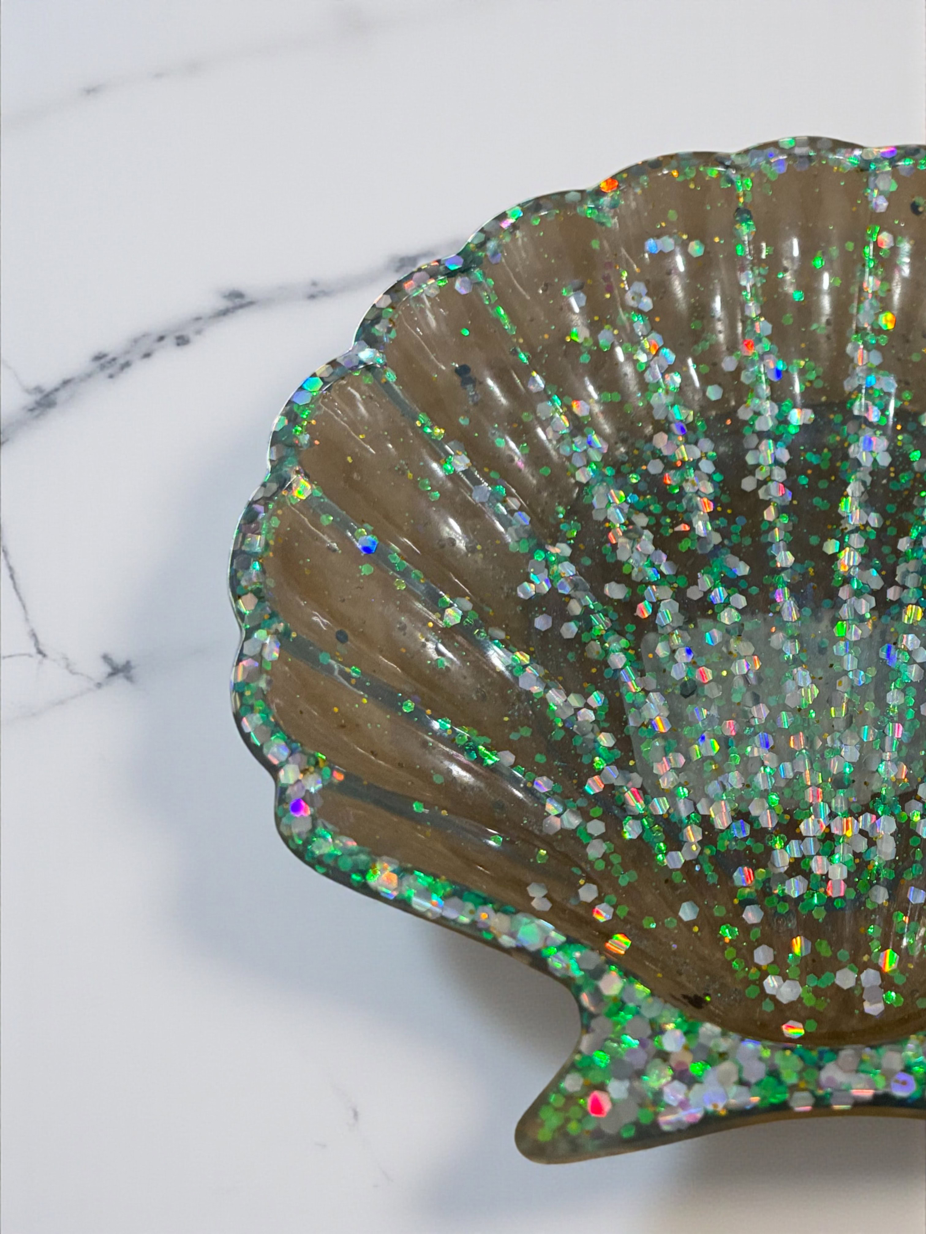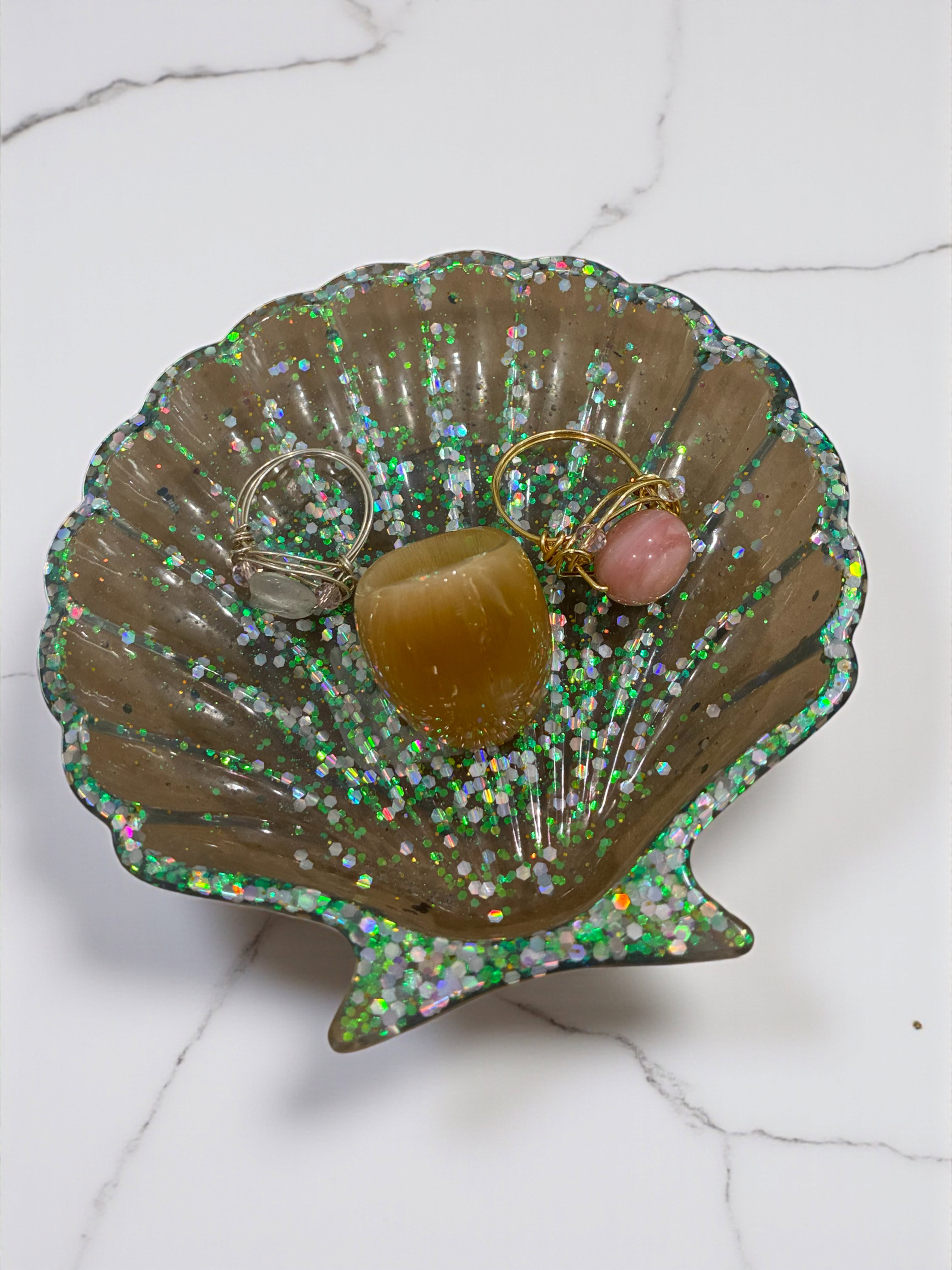 Joyero con forma de concha elaborado a mano en resina de alta resistencia y acabado brillante. Sus delicados relieves permiten organizar y proteger anillos, aretes u otras piezas pequeñas. Ligero, duradero y fácil de limpiar; ideal para el tocador o como detalle de regalo.