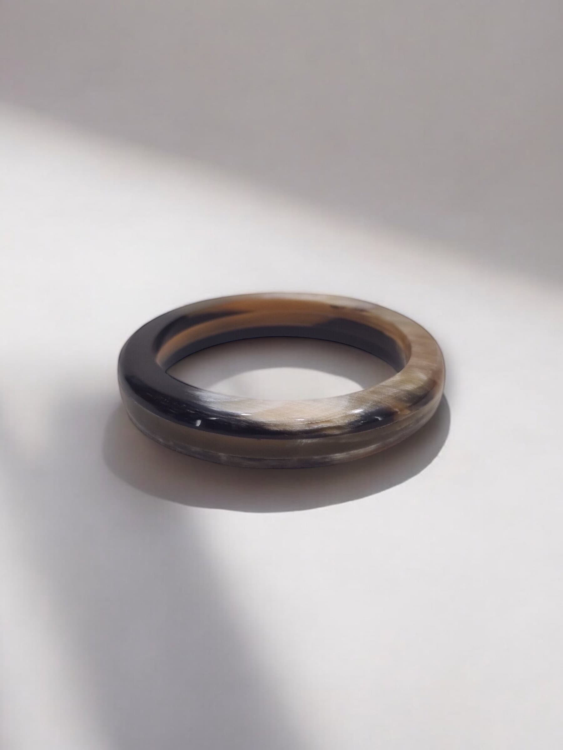 Pulsera hecho a mano en cacho de toro reciclado. La belleza del material y el trabajo fino artesanal dan como resultado una pieza única y sostenible.