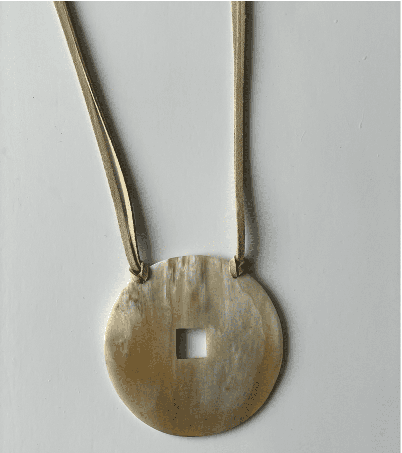 Collar largo hecho a mano en cacho de toro reciclado. La belleza del material y el trabajo fino artesanal dan como resultado una pieza única y sostenible.