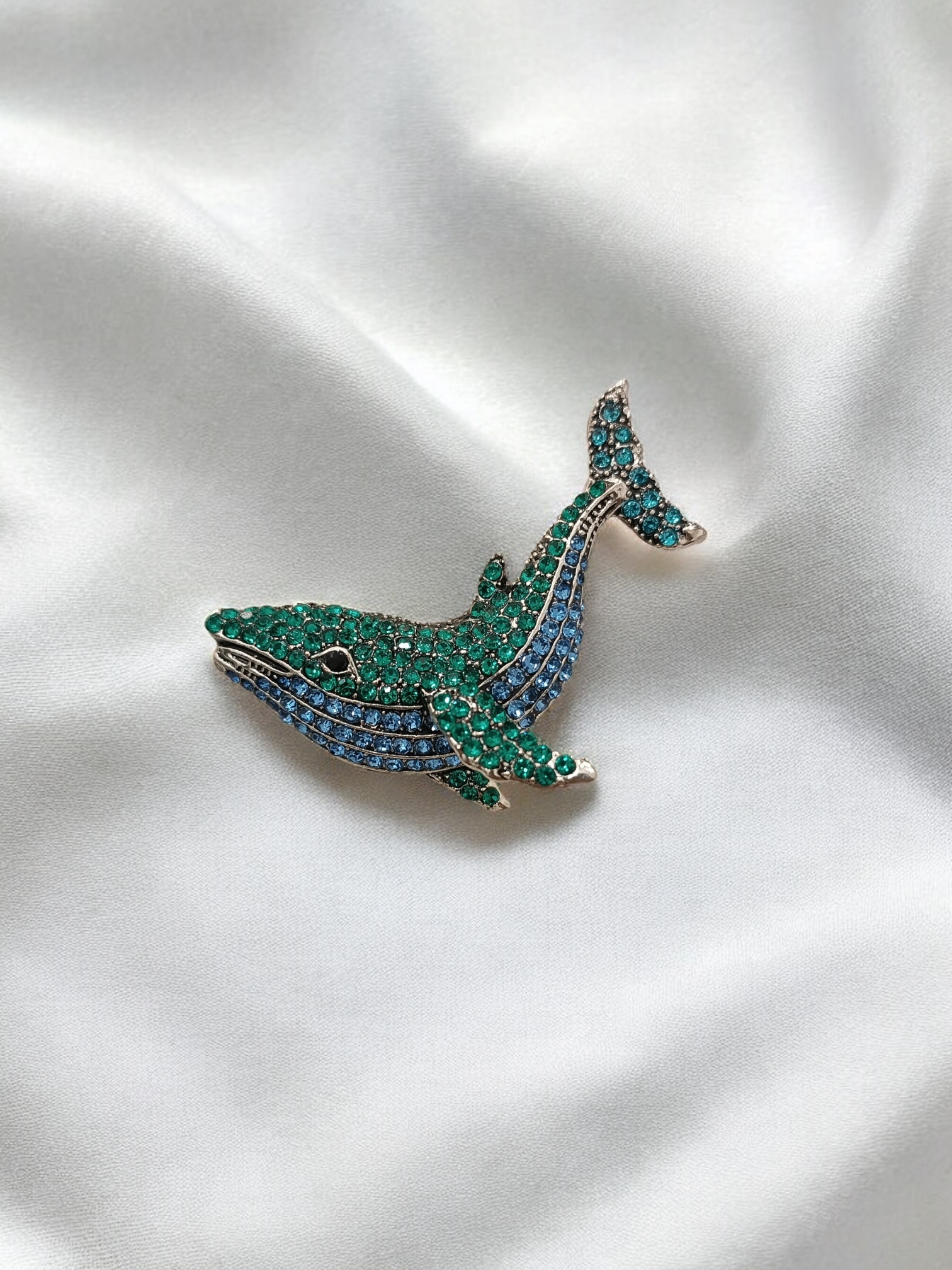 Broche con diseño de ballena, elaborado en fantasía fina y pedrería, es una excelente adición para hacer de tu look mas divertido y original.