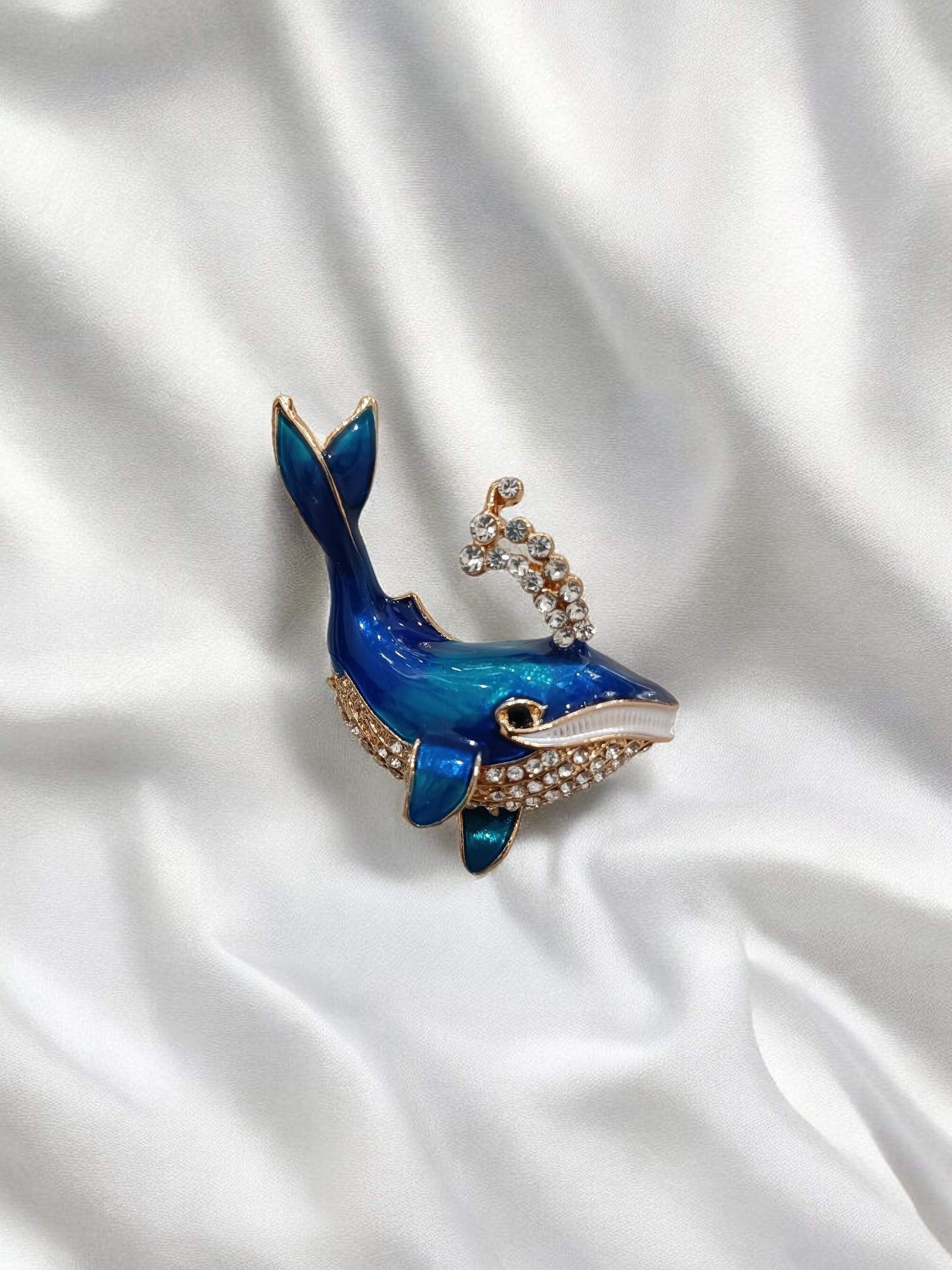 Broche con diseño de ballena, elaborado en fantasía fina y pedrería, es una excelente adición para hacer de tu look mas divertido y original.