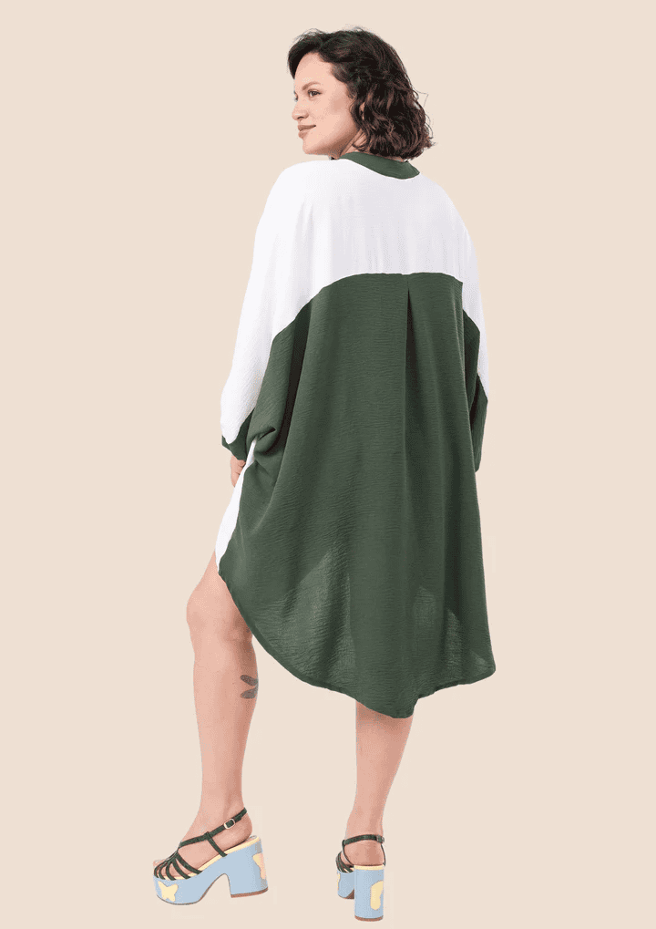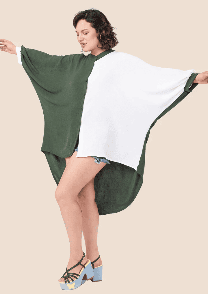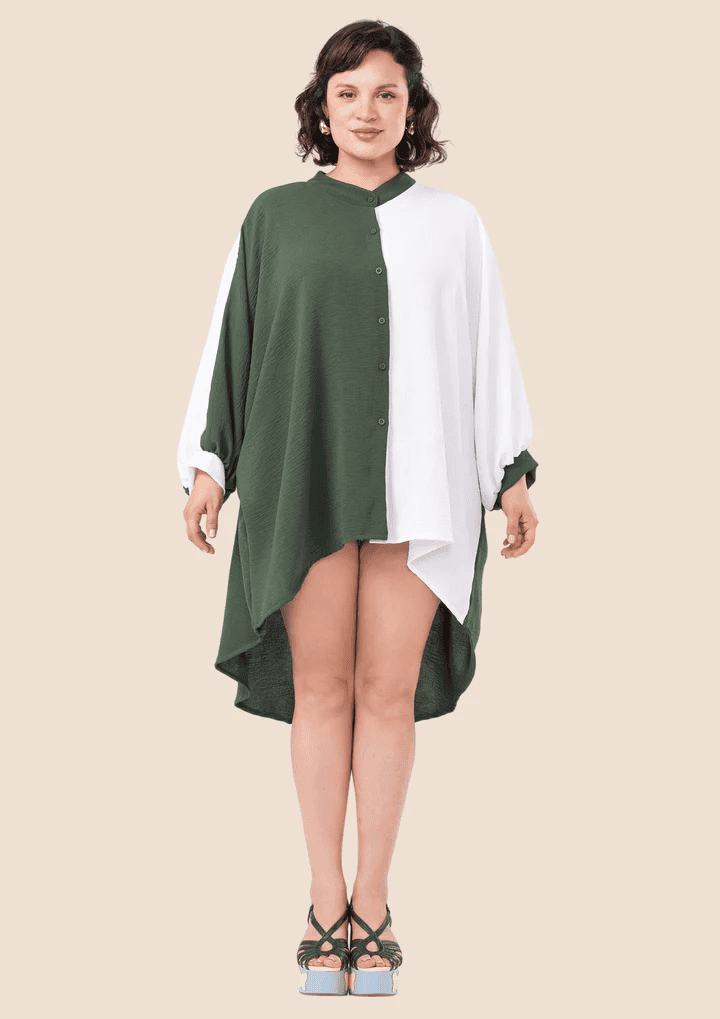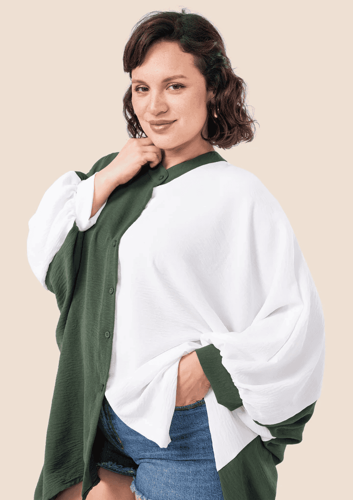Maxiblusa oversize con cuello en V y botones de nácar que aportan un toque elegante. Su diseño único combina comodidad y estilo, perfecta para crear looks modernos y sofisticados.