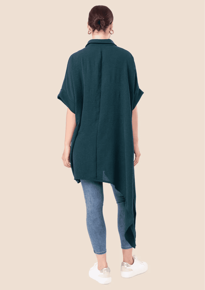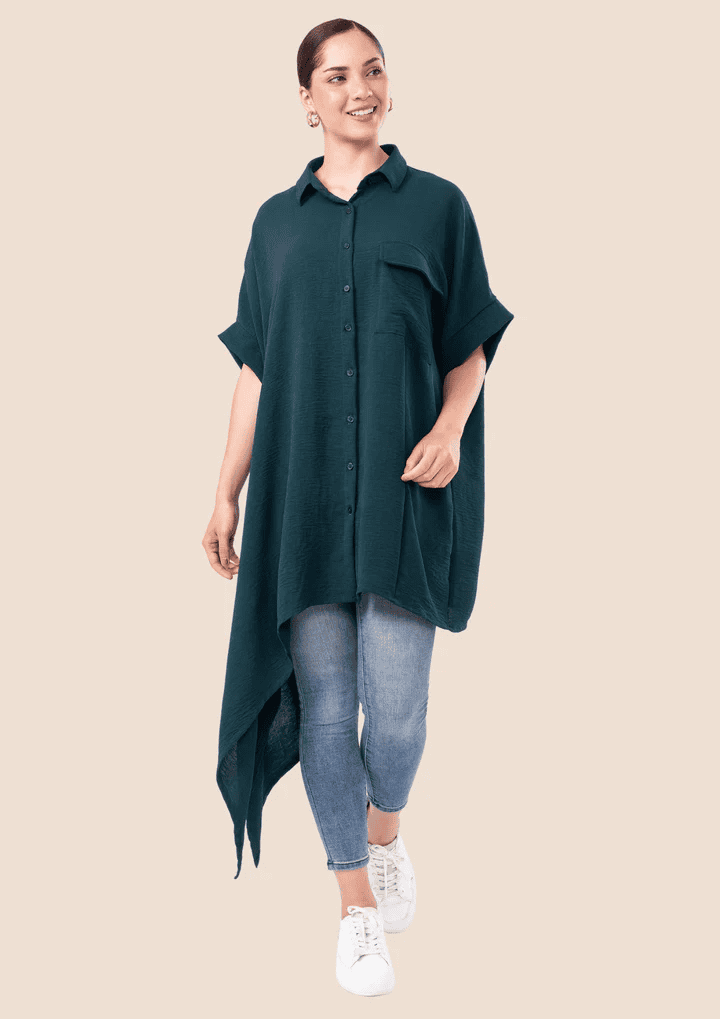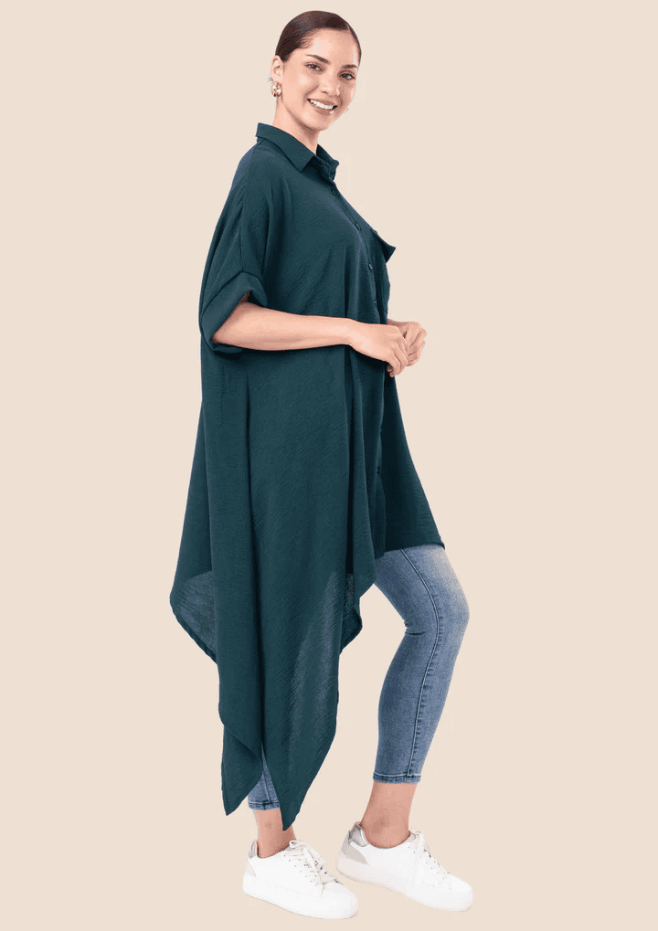 Maxiblusa oversize de estilo camisero, con botones de nácar que aportan un toque elegante. Cuenta con bolsillo funcional en el delantero. Una prenda moderna y cómoda, ideal para crear looks relajados con estilo.