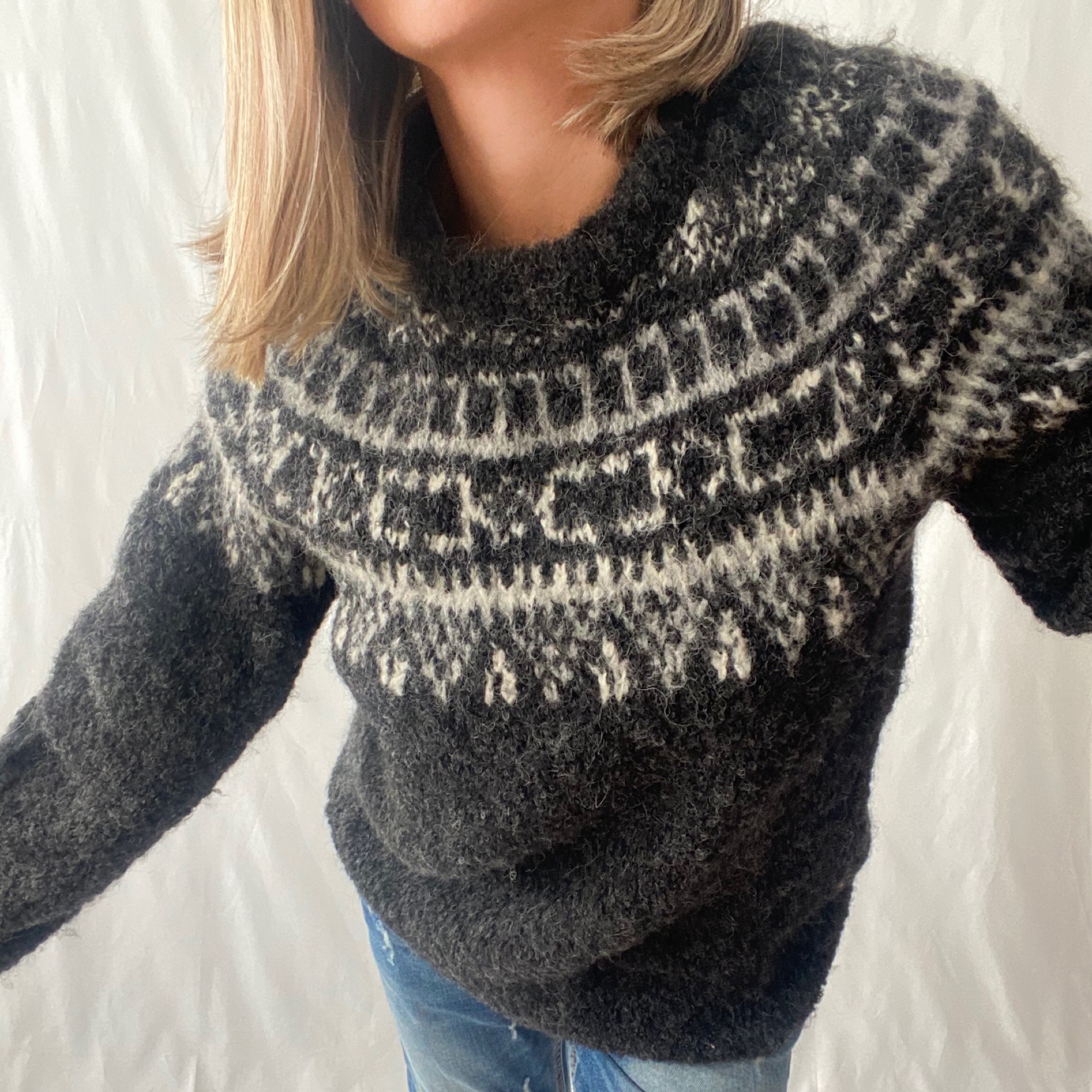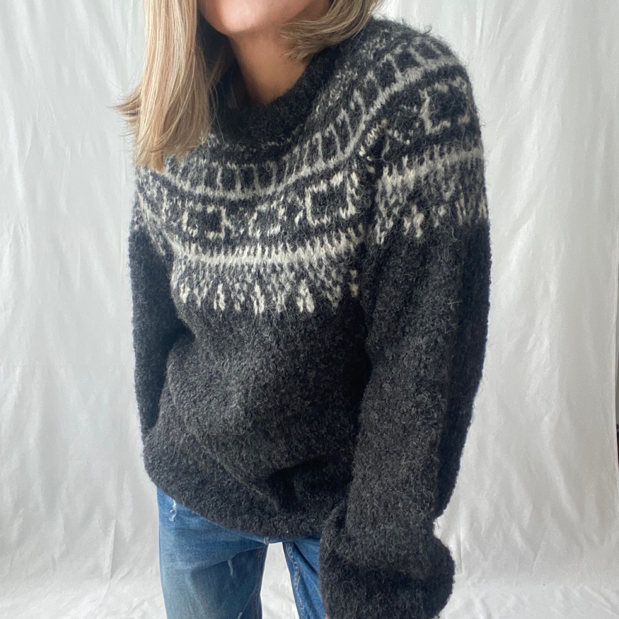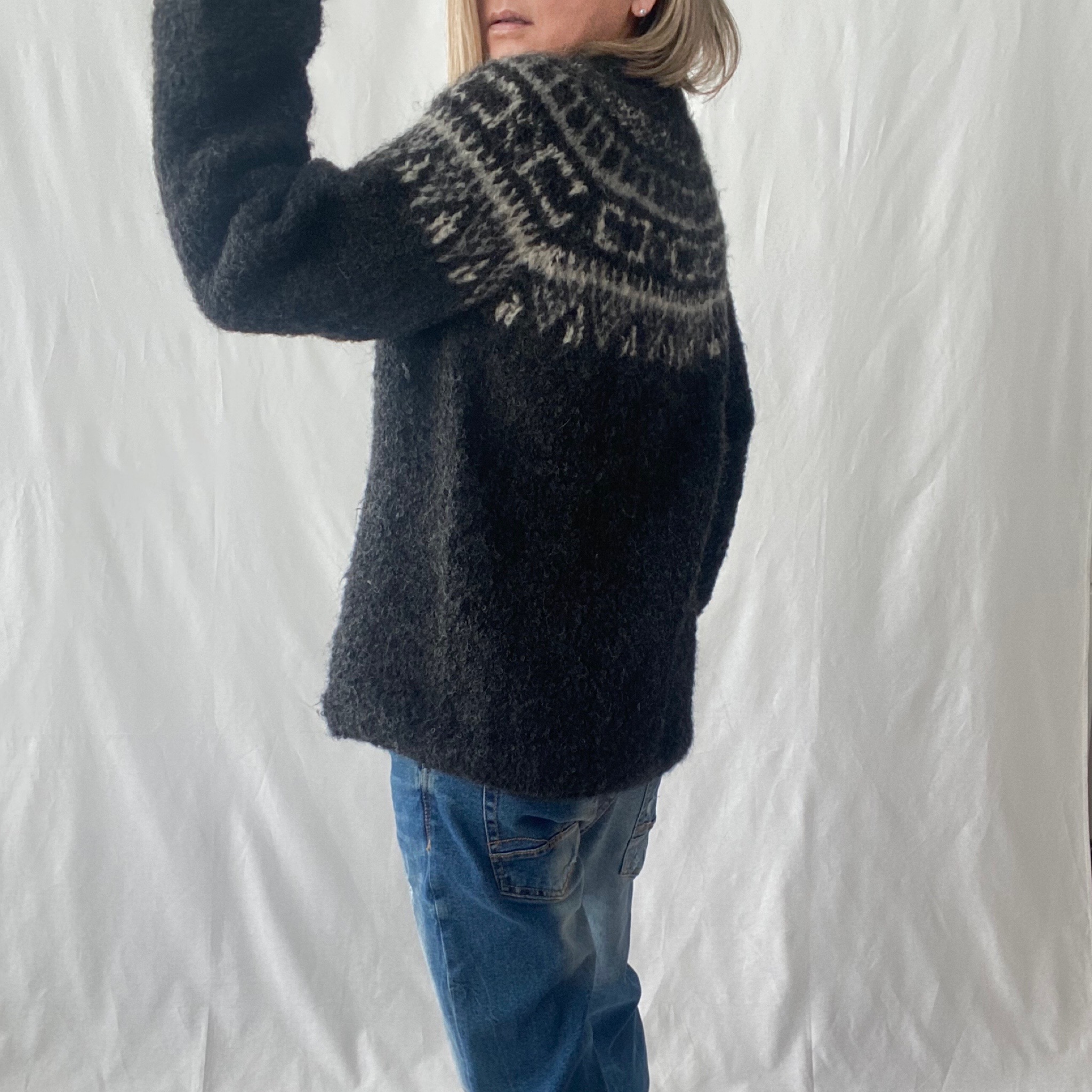 Sweater de alpaca tejido a mano por artesanos ayacuchanos. Diseño clásico y contemporáneo al mismo tiempo. Nos remite a los andes y al olor de las montañas.