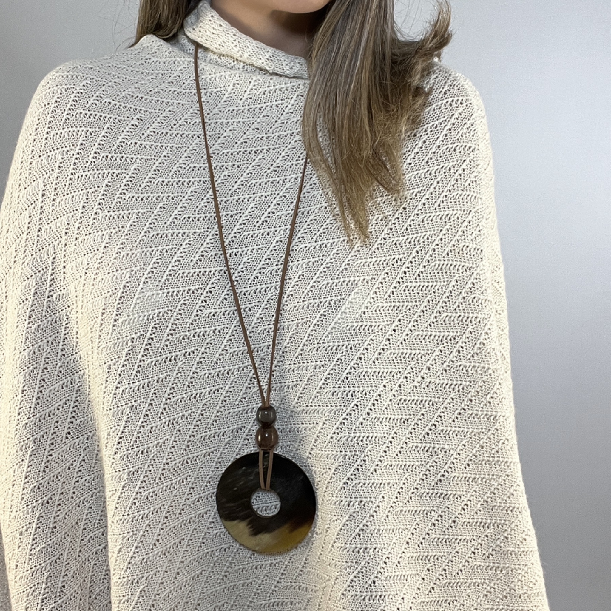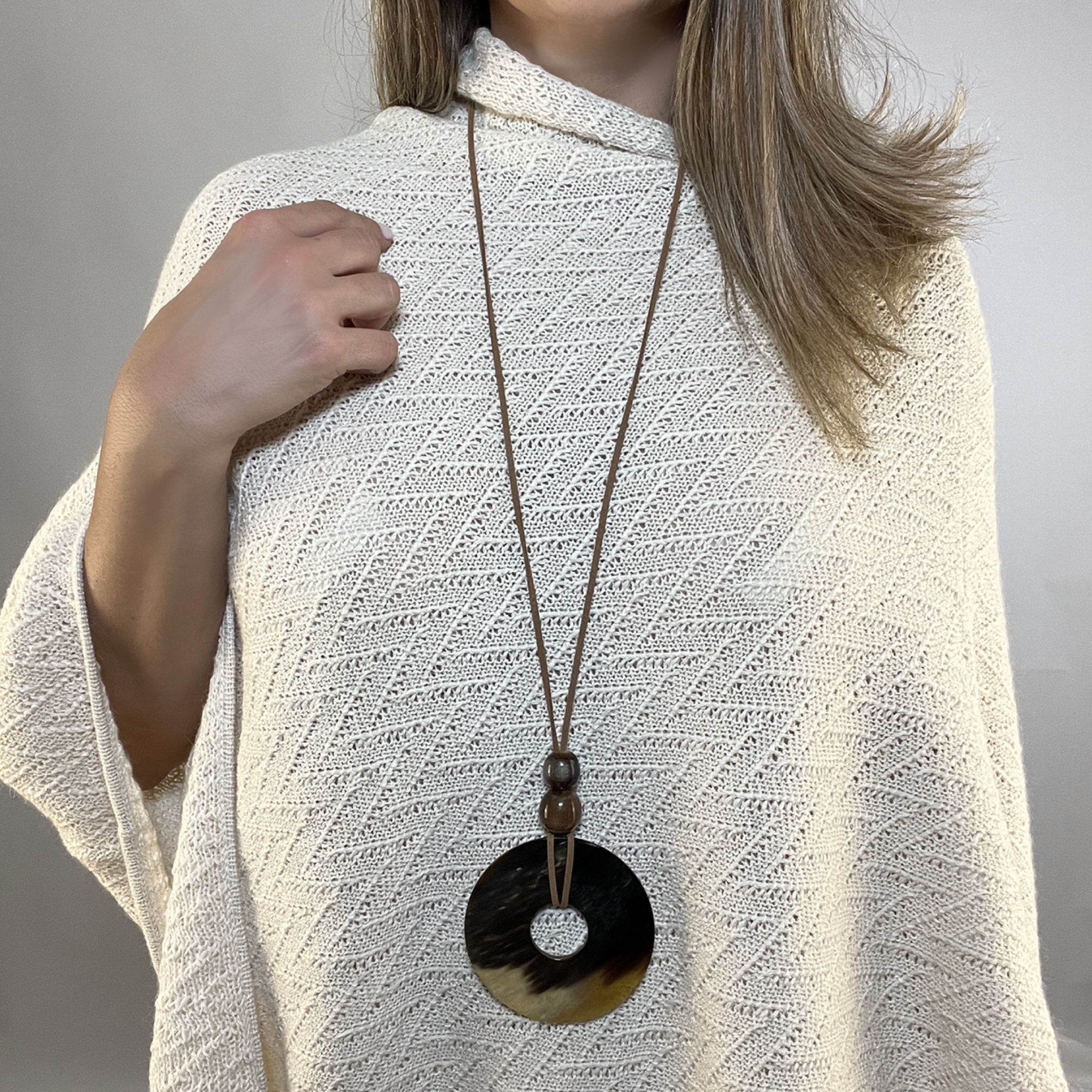 Collar largo hecho a mano en cacho de toro reciclado. La belleza del material y el trabajo fino artesanal dan como resultado una pieza única y sostenible.