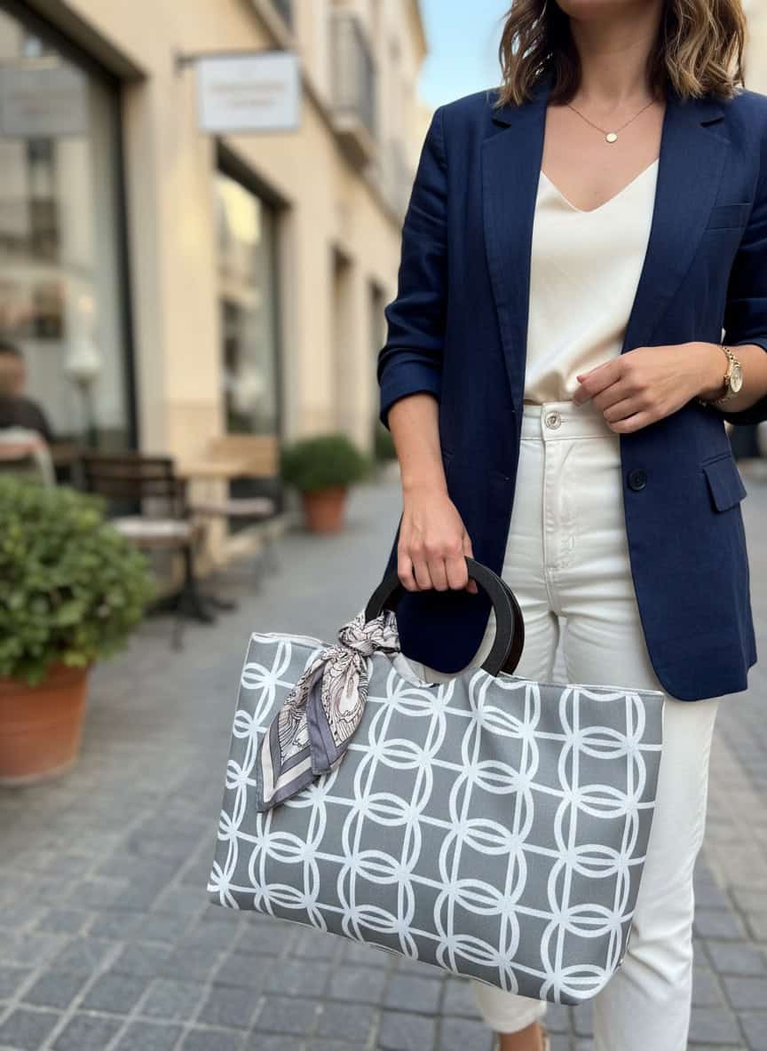 Maxibolso en algodón de textura suave, con asa circular de madera que aporta un toque sofisticado y moderno. Su diseño amplio lo hace práctico y cómodo para uso diario.