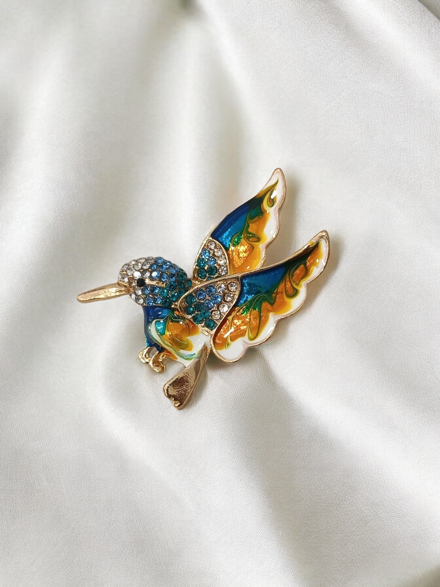 Broche con diseño de colibrí, elaborado en fantasía fina y pedrería, es una excelente adición para hacer de tu look mas divertido y original.