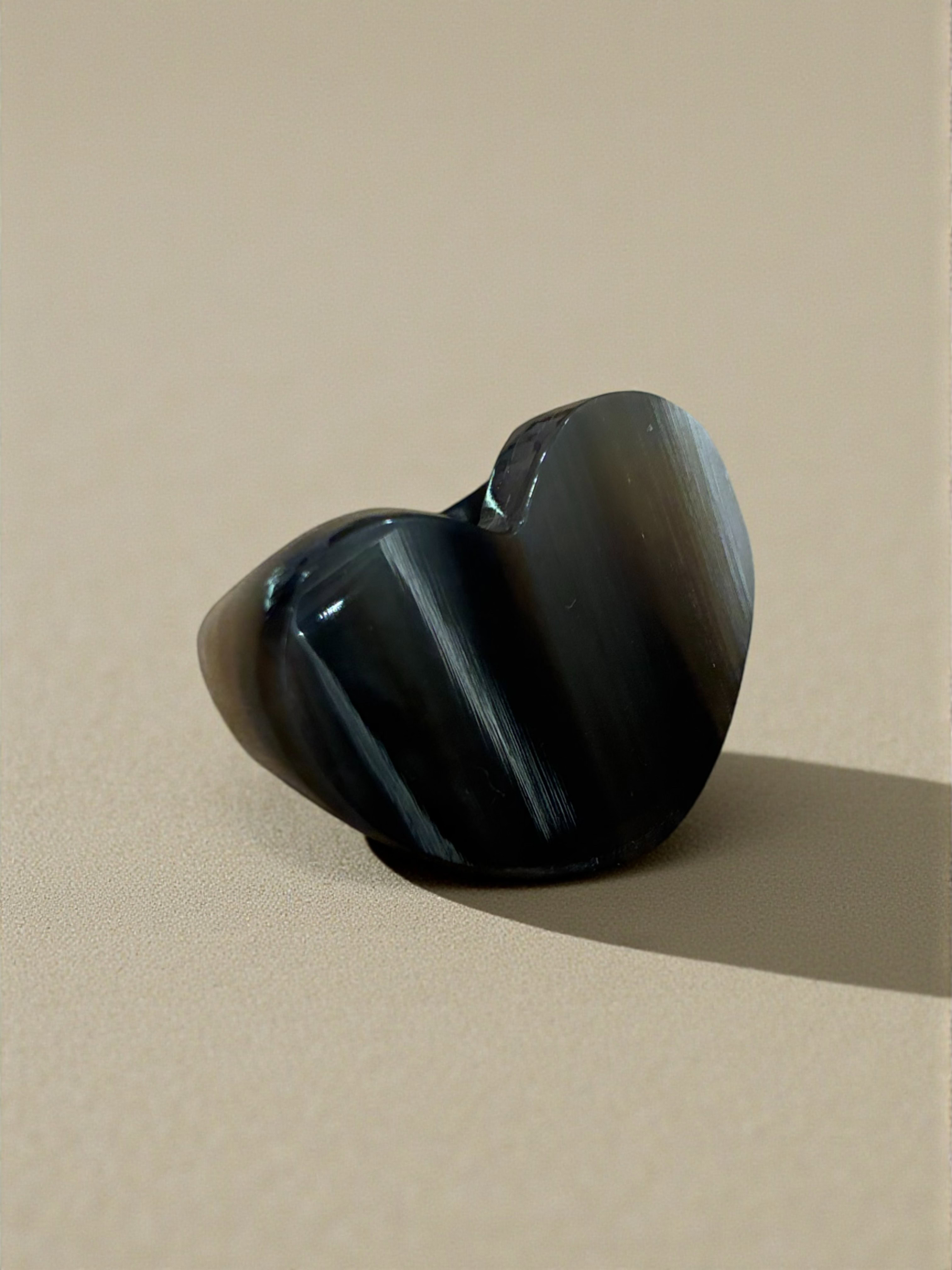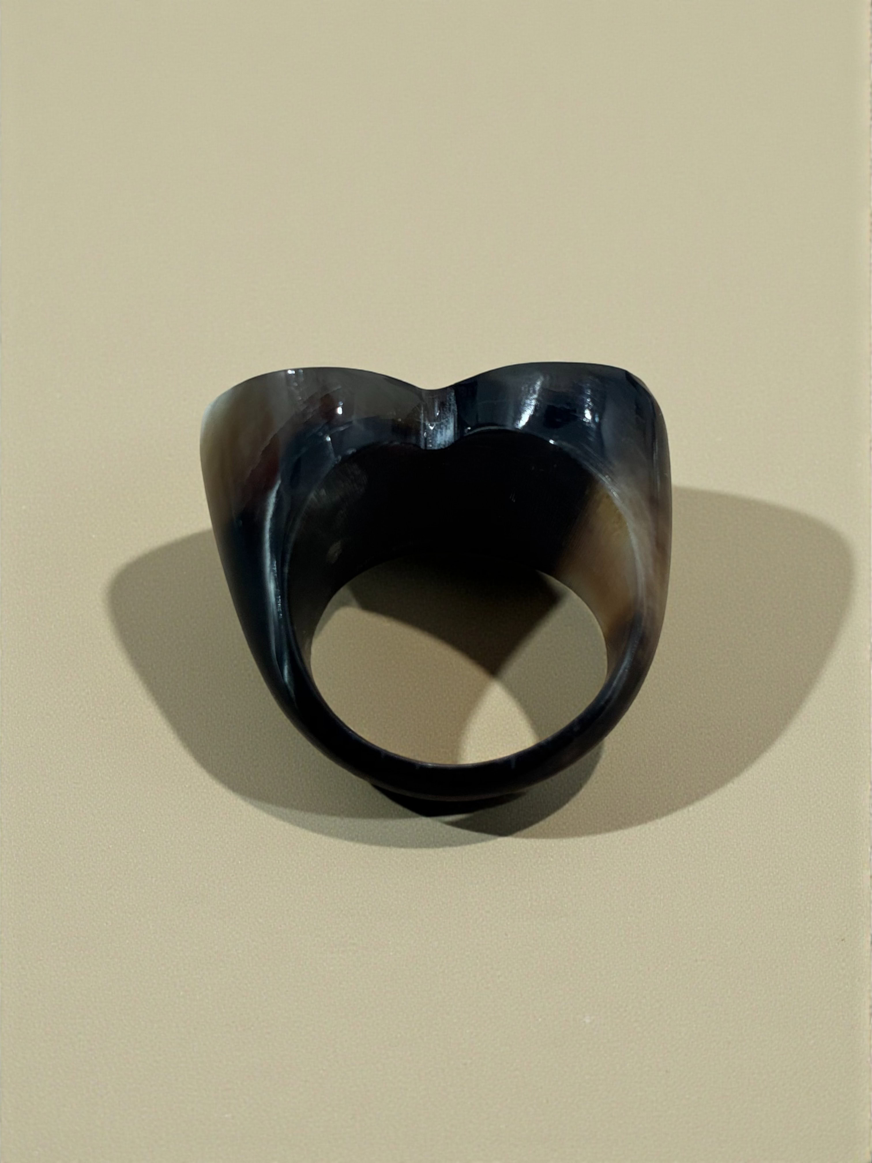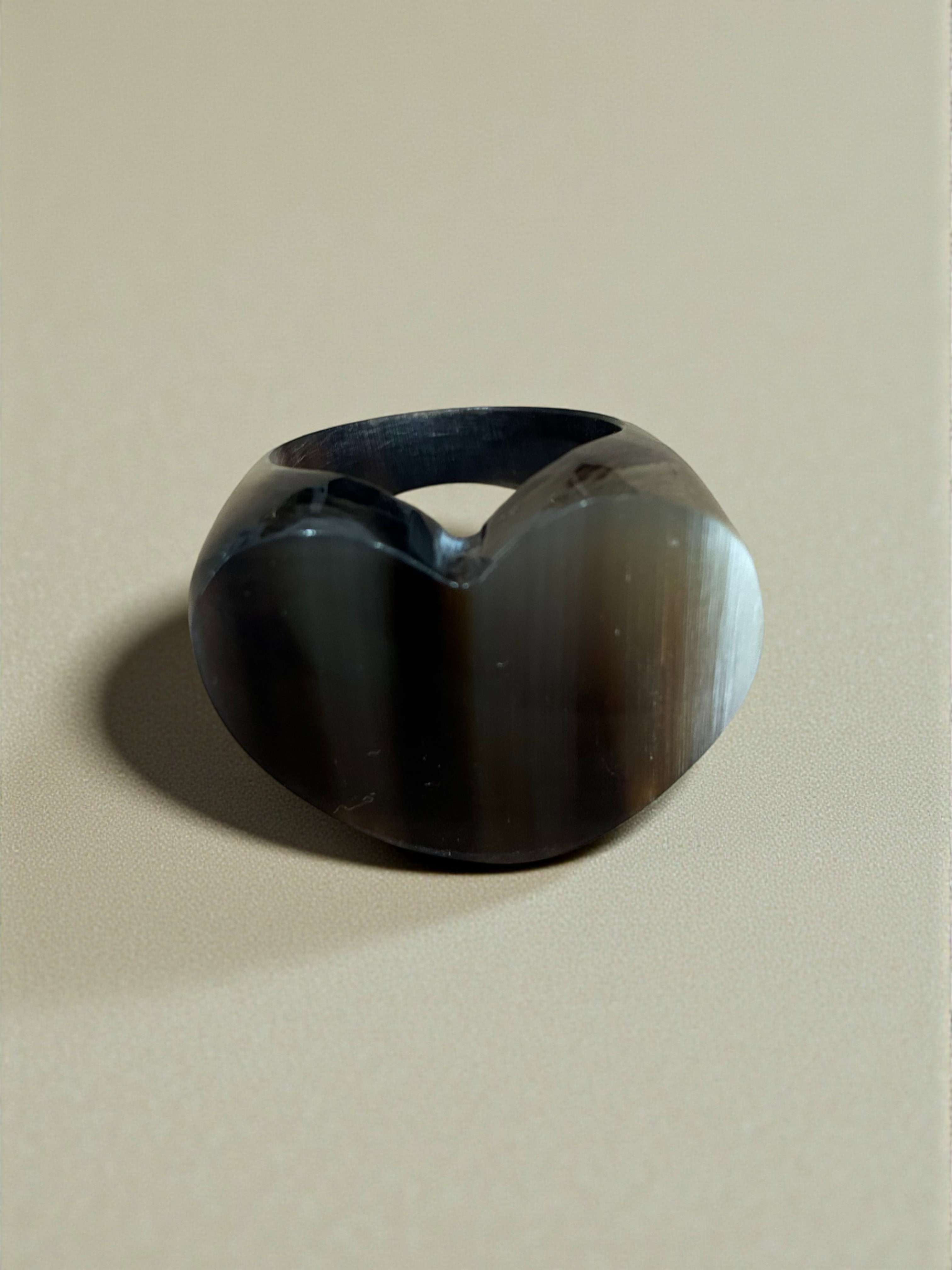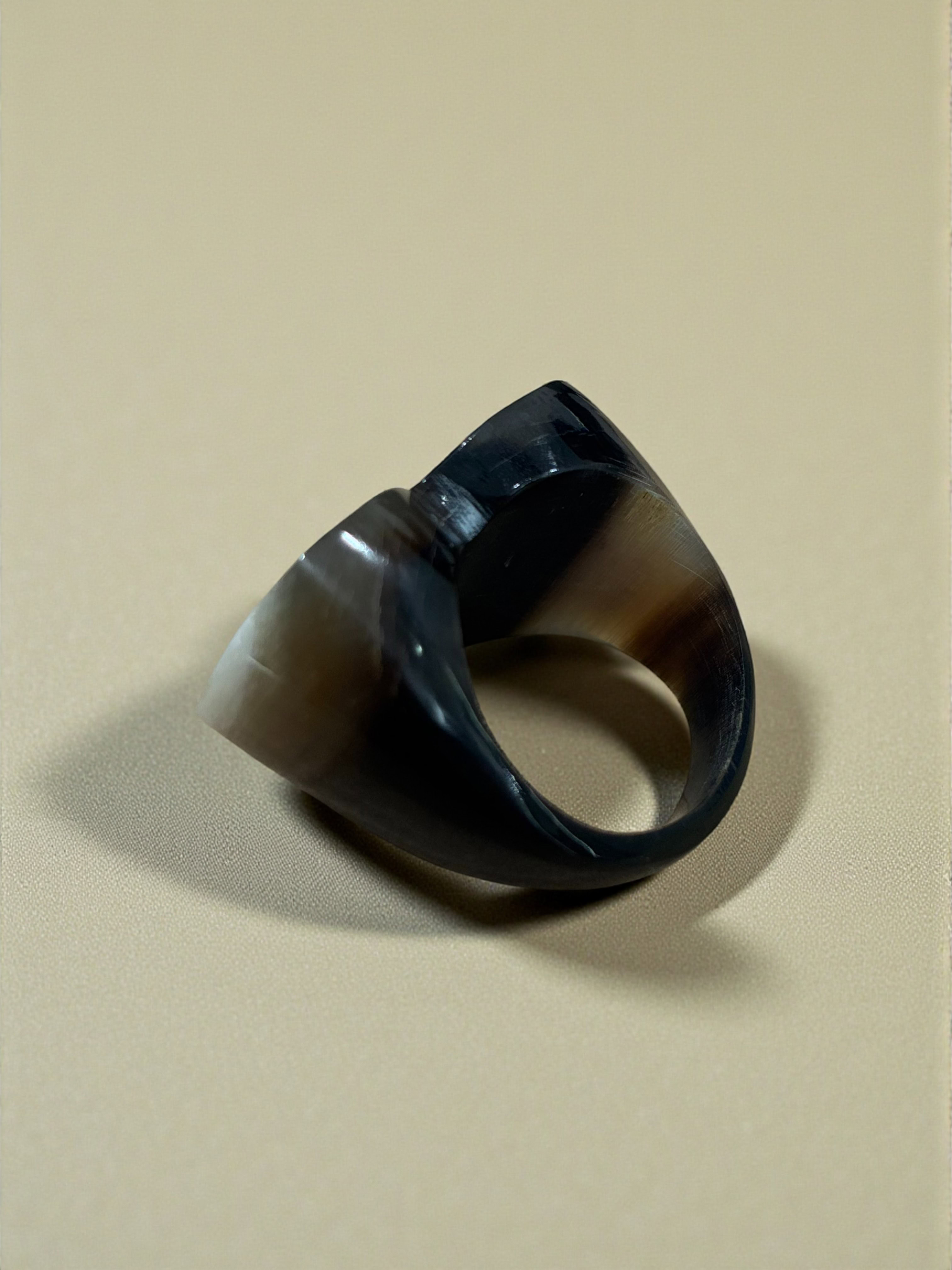 Anillo hecho a mano en cacho de toro reciclado. La belleza del material y el trabajo fino artesanal dan como resultado una pieza única y sostenible.