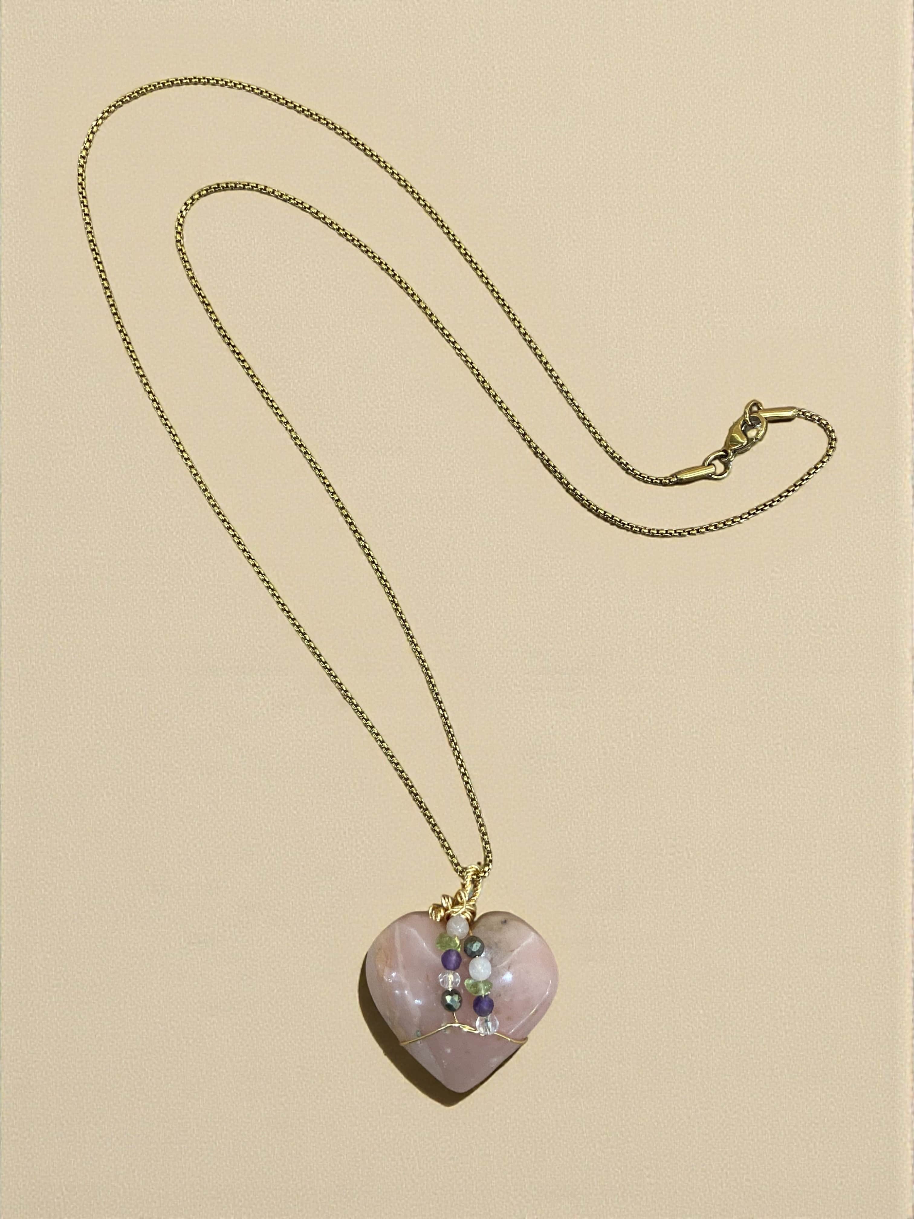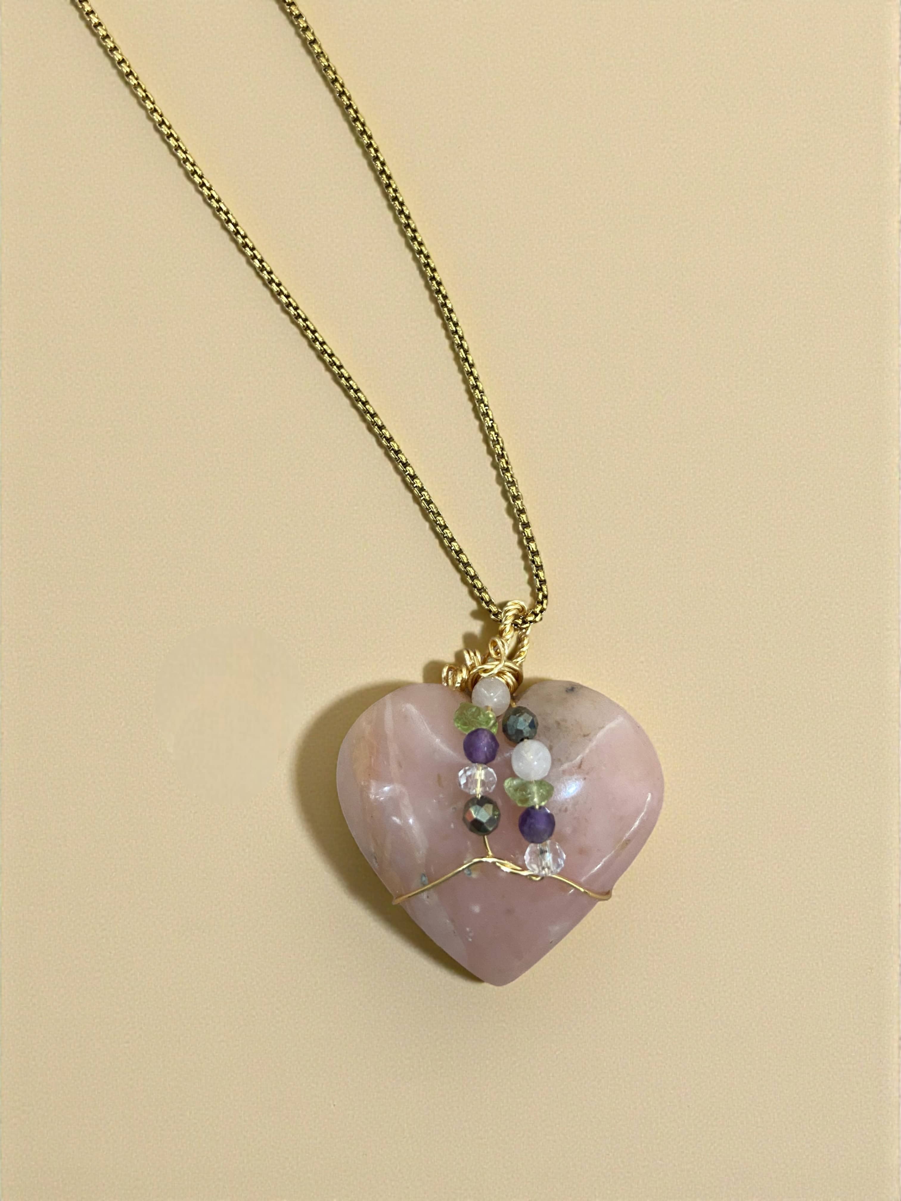 Collar entorchado en cobre con ópalo rosa, amatista, pirita y cuarzo cristal. El Ópalo rosa aporta suavidad emocional, la Amatista claridad, la Pirita protección y el Cuarzo cristal equilibrio y energía.