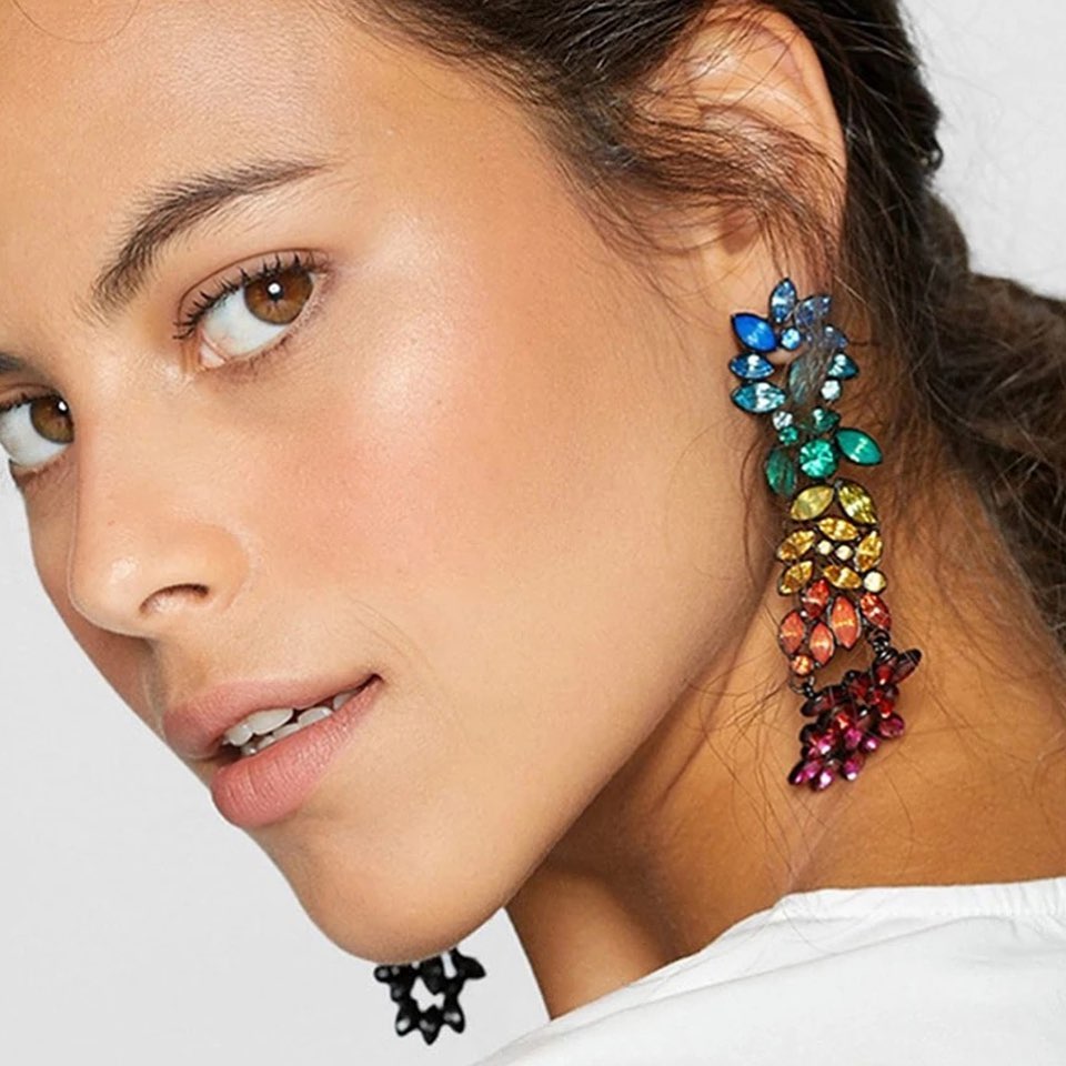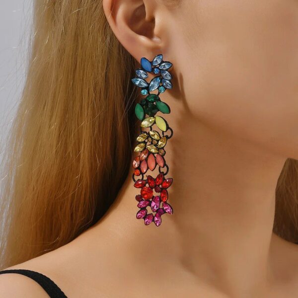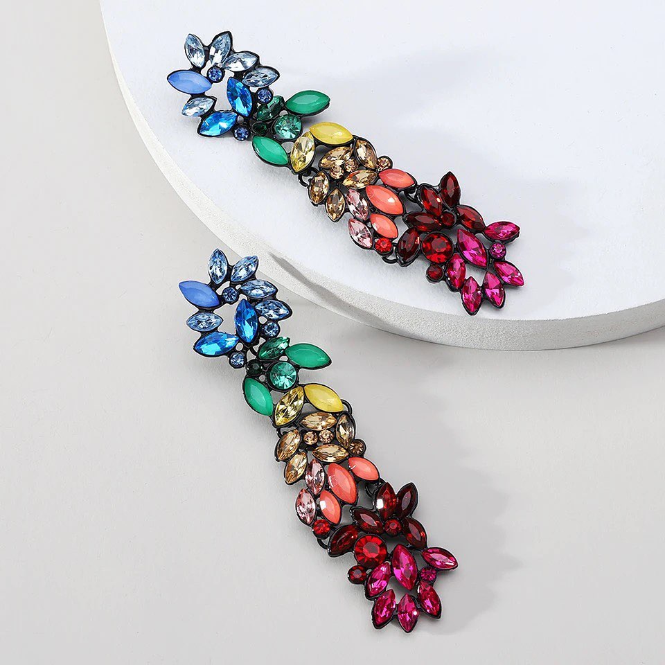 Aretes largos en cristal con diseño de flores, una pieza sofisticada que destaca por su brillo y delicadeza, perfecta para ocasiones especiales.