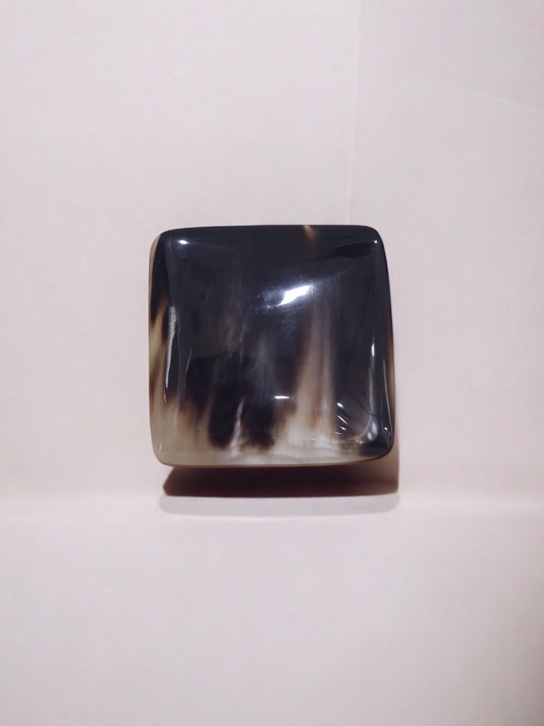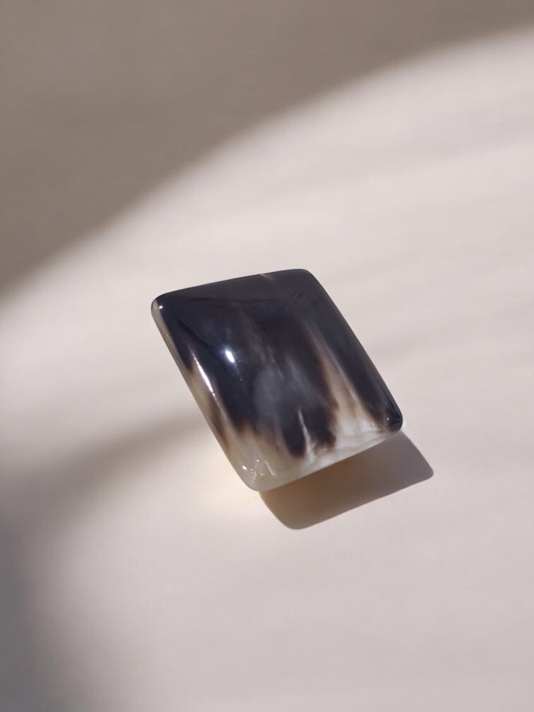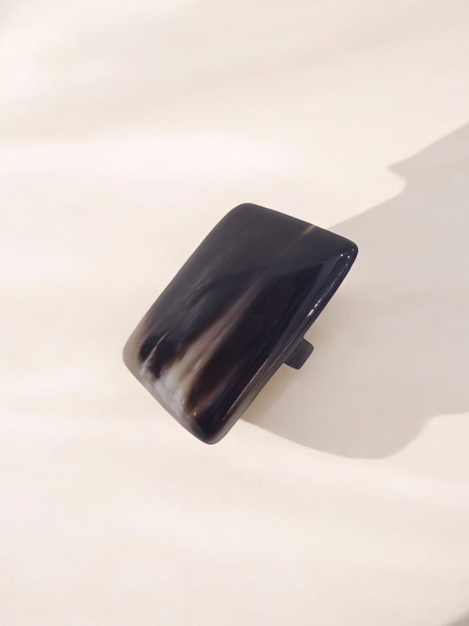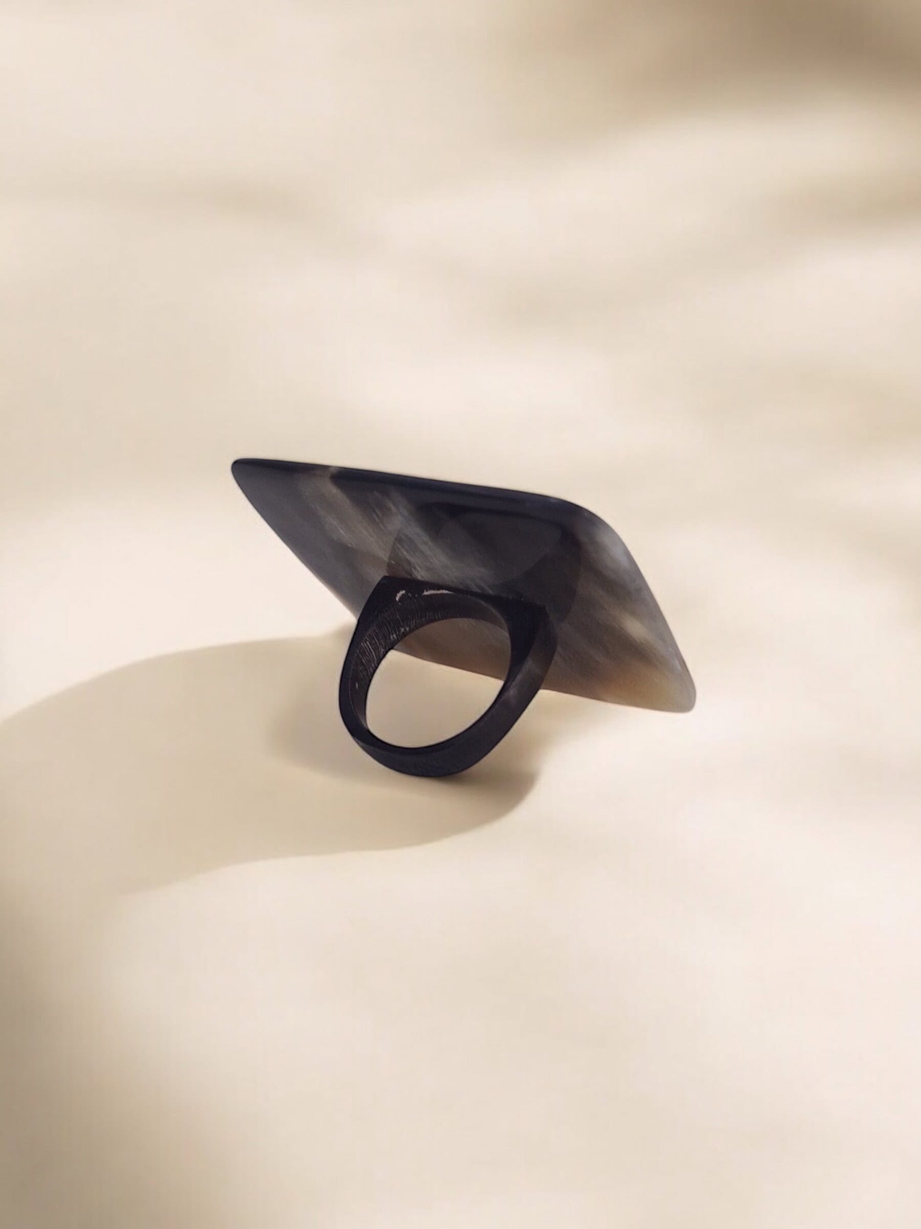 Anillo hecho a mano en cacho de toro reciclado. La belleza del material y el trabajo fino artesanal dan como resultado una pieza única y sostenible.