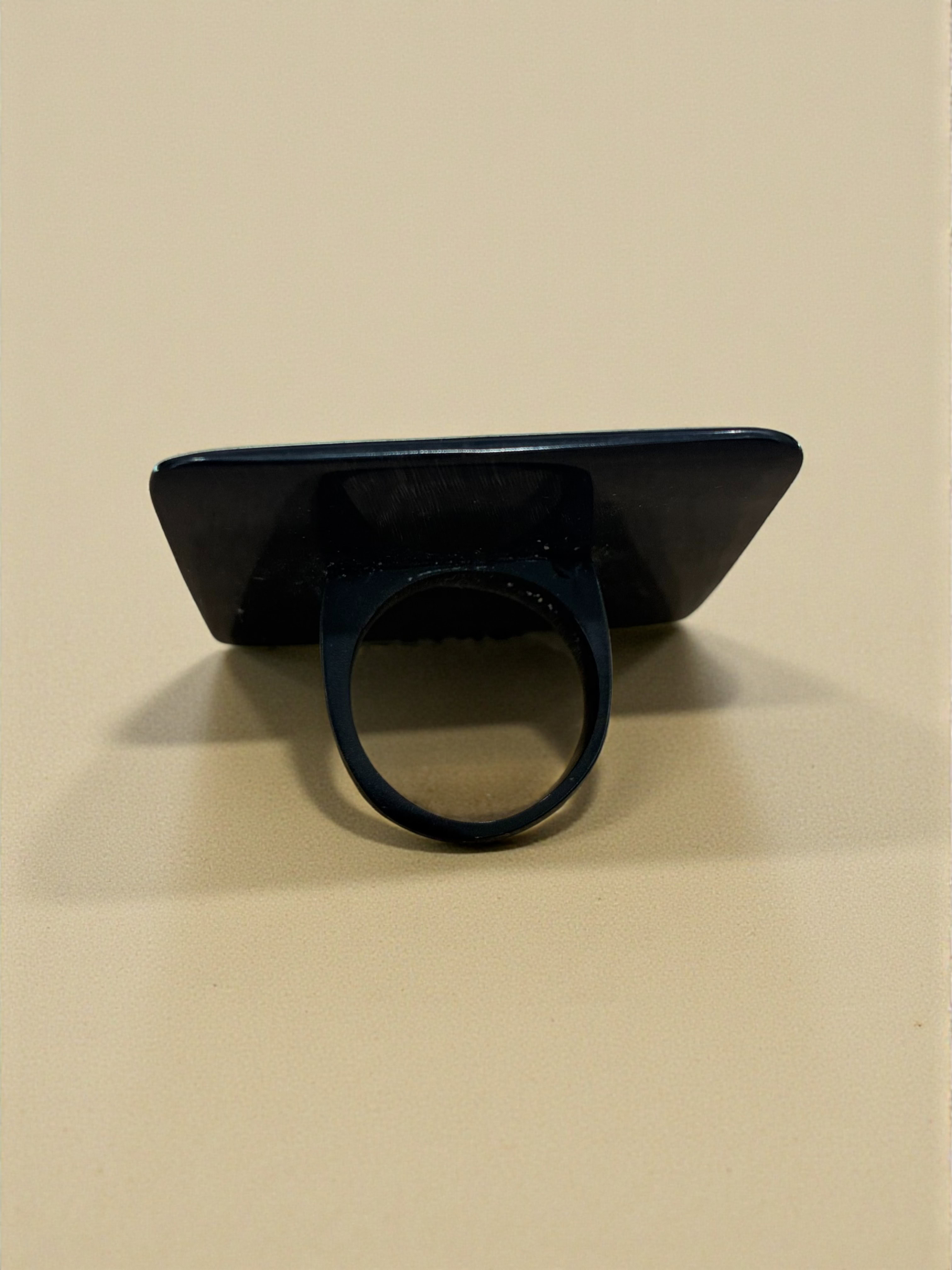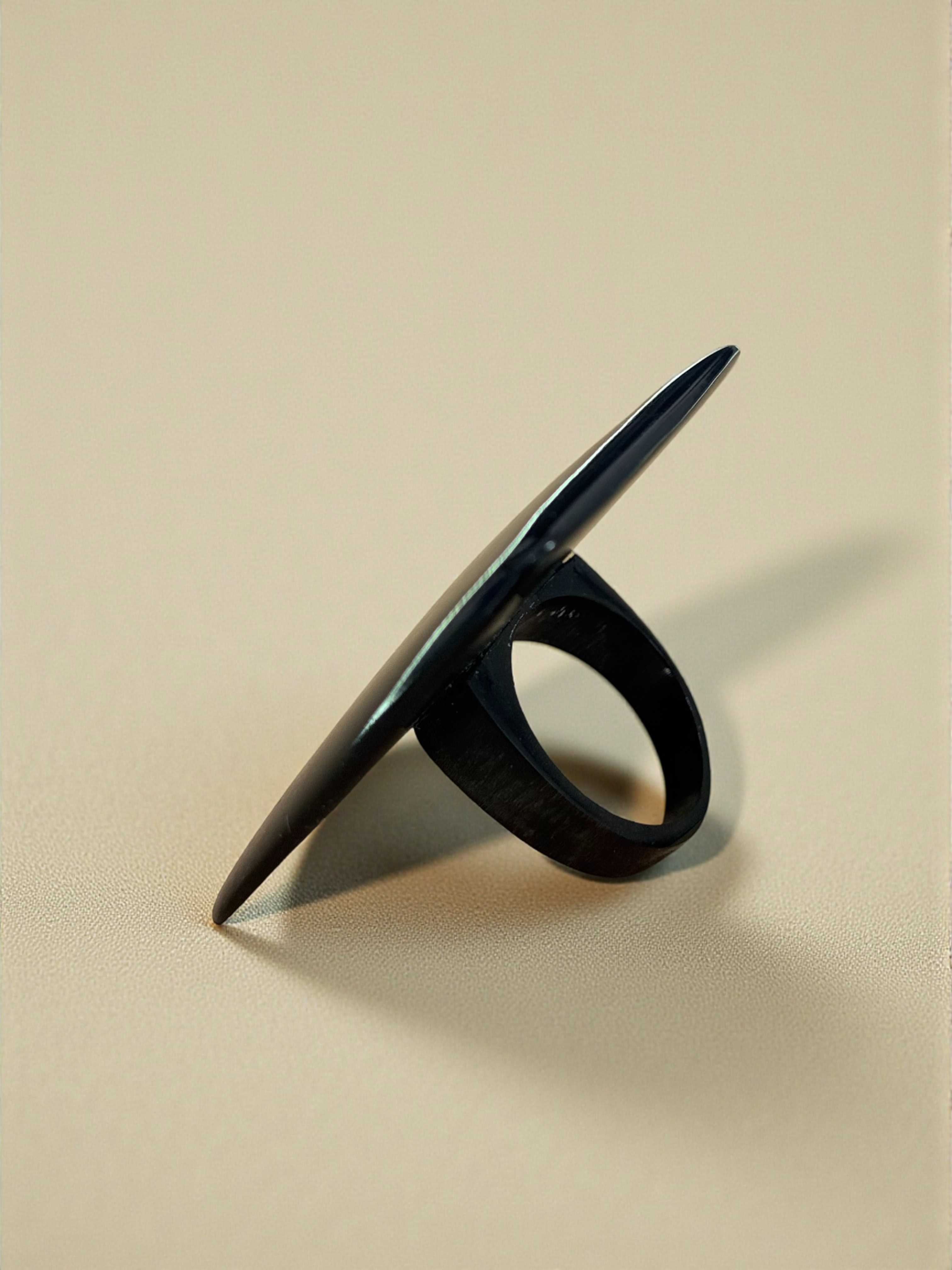 Anillo hecho a mano en cacho de toro reciclado. La belleza del material y el trabajo fino artesanal dan como resultado una pieza única y sostenible.