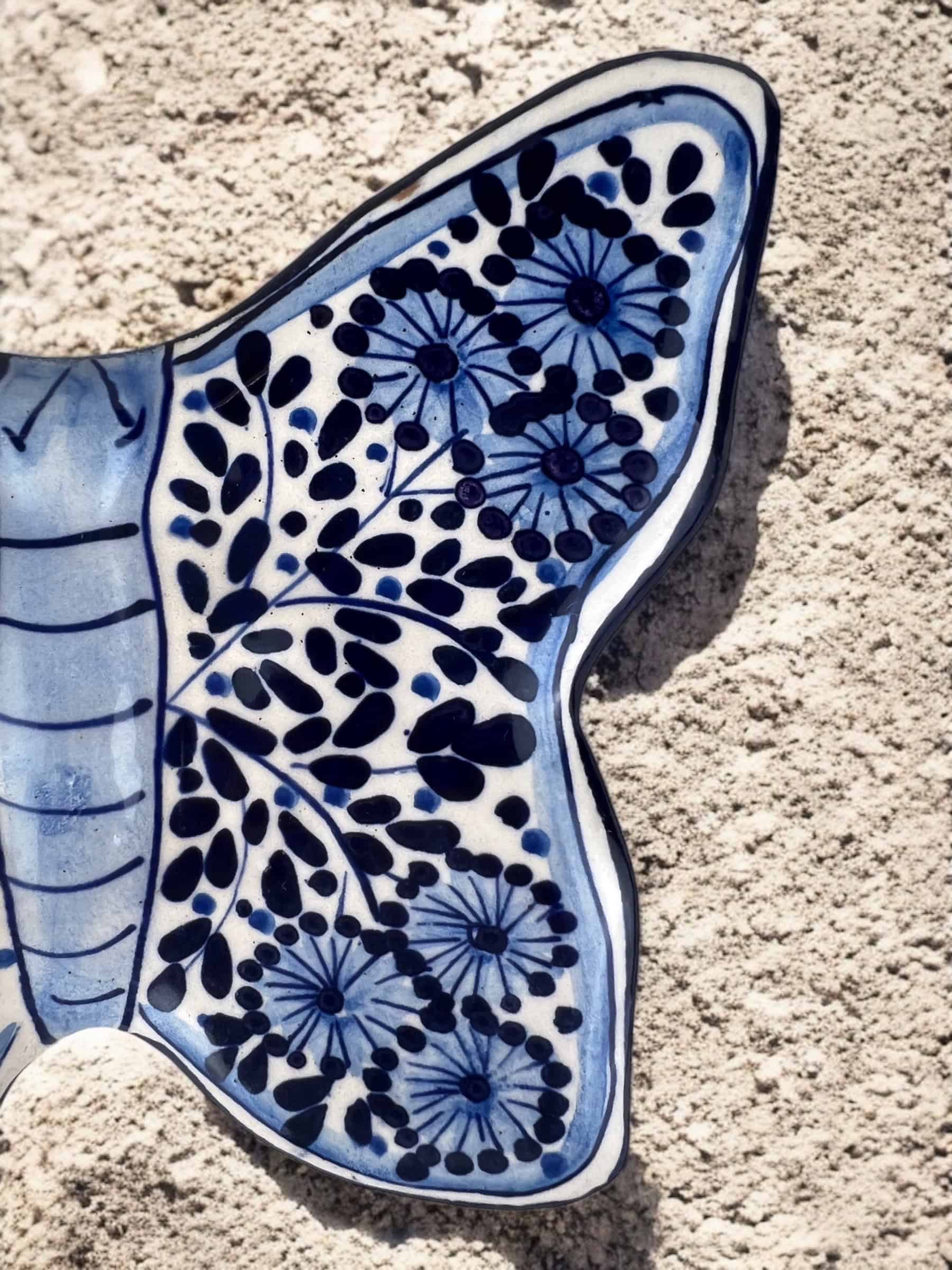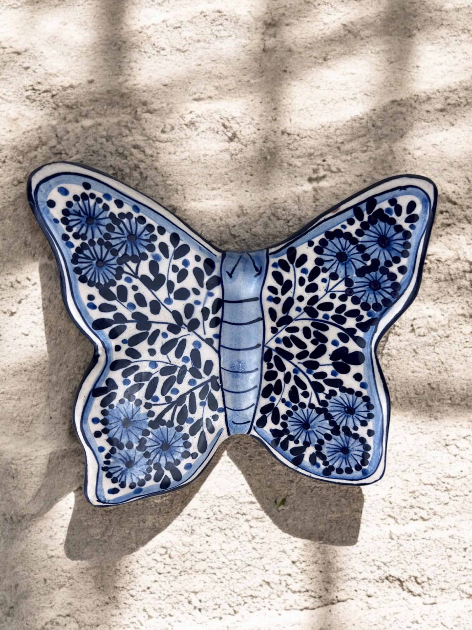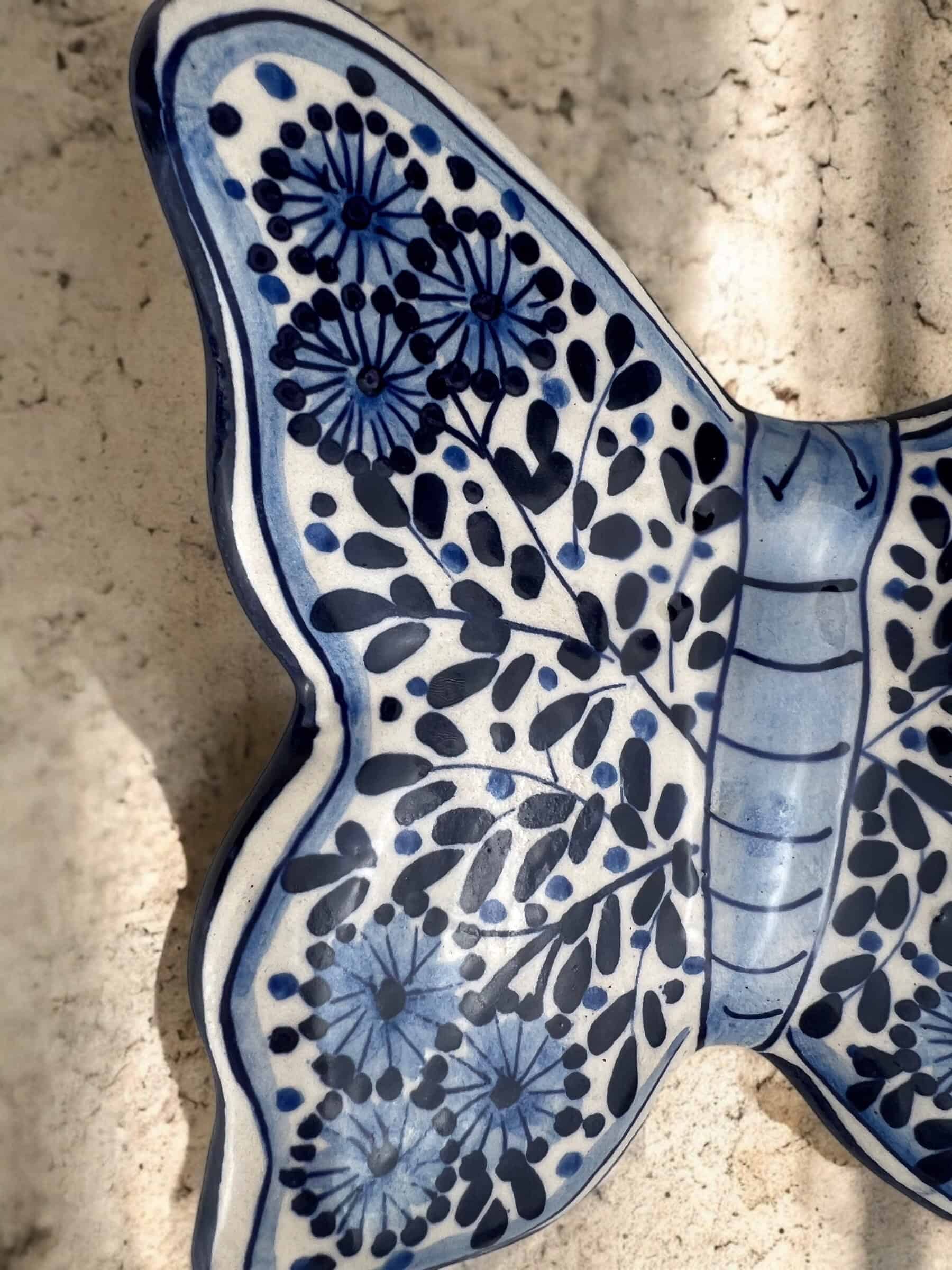 Mariposa colgante de cerámica hecha y pintada a mano por artesanos limeños. Cada pieza es única por su elaboración artesanal.