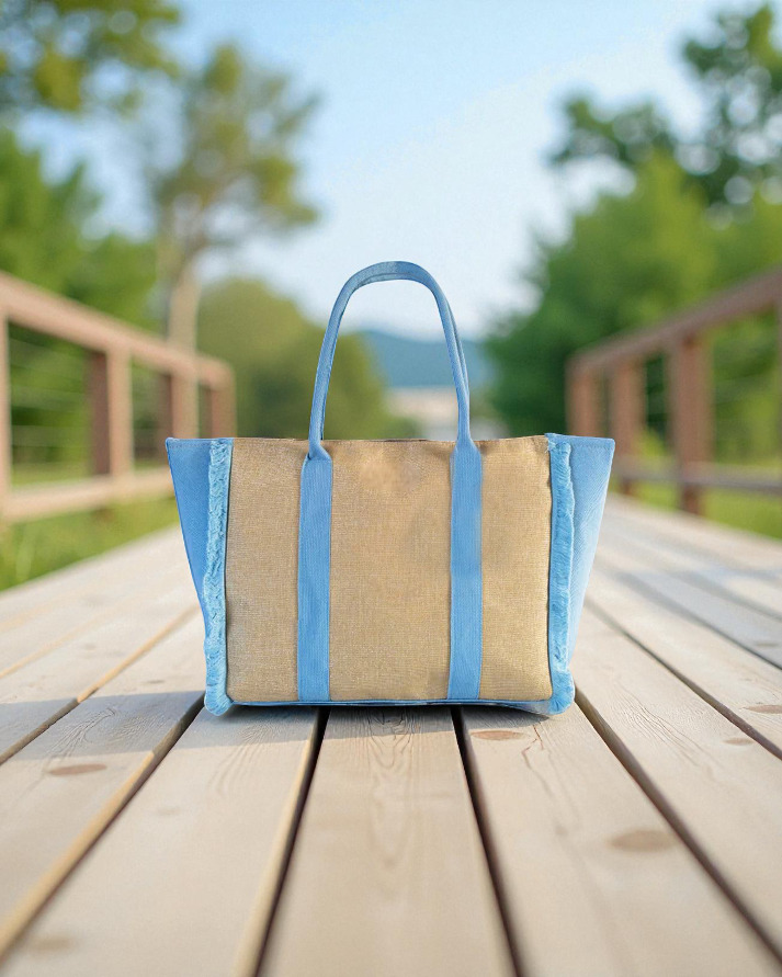Diseño, confección y tela italiana. Bolso tipo shopper elaborado en tela resistente con diseño estampado. Cuenta con asas de mano firmes y detalles en los bordes con acabado deshilachado que le aportan un toque artesanal. Amplio y ligero, ideal para el uso diario o para llevar a la playa o de paseo.