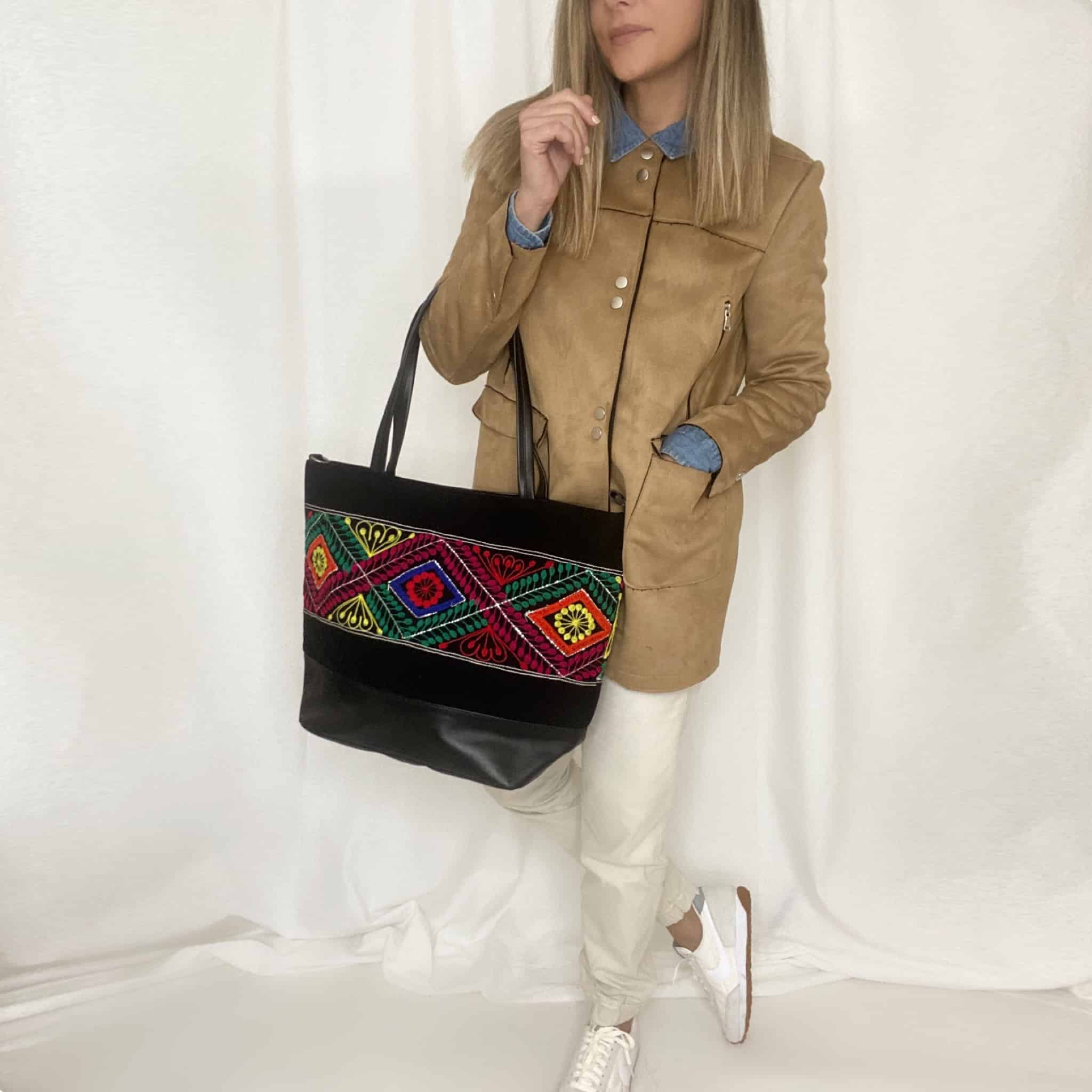 Cartera Tote Bag, bordada a mano de manera artesanal en el lugar de orígen, manteniendo las técnicas tradicionales de tejeduría de las culturas indígenas en los andes peruanos.