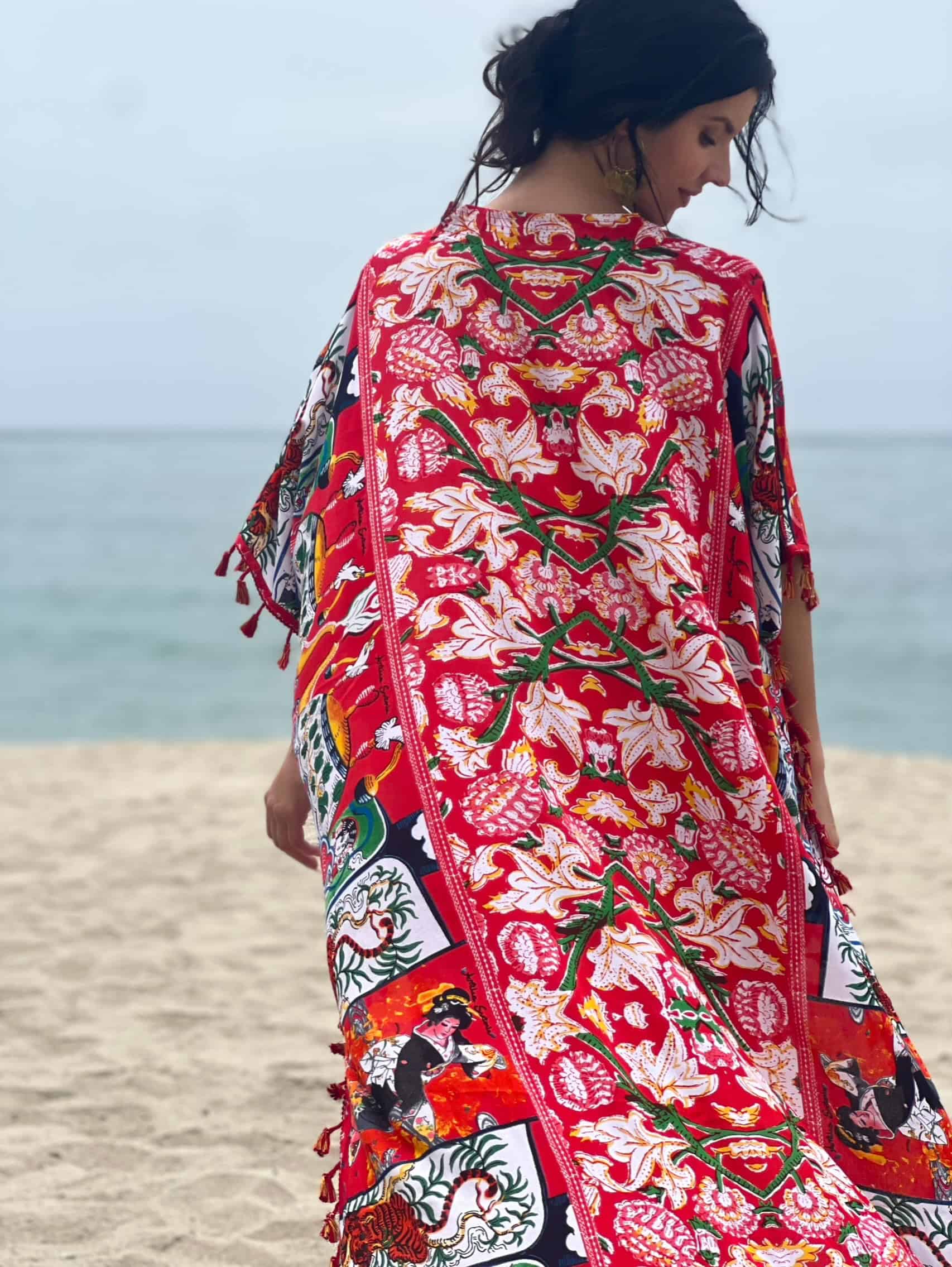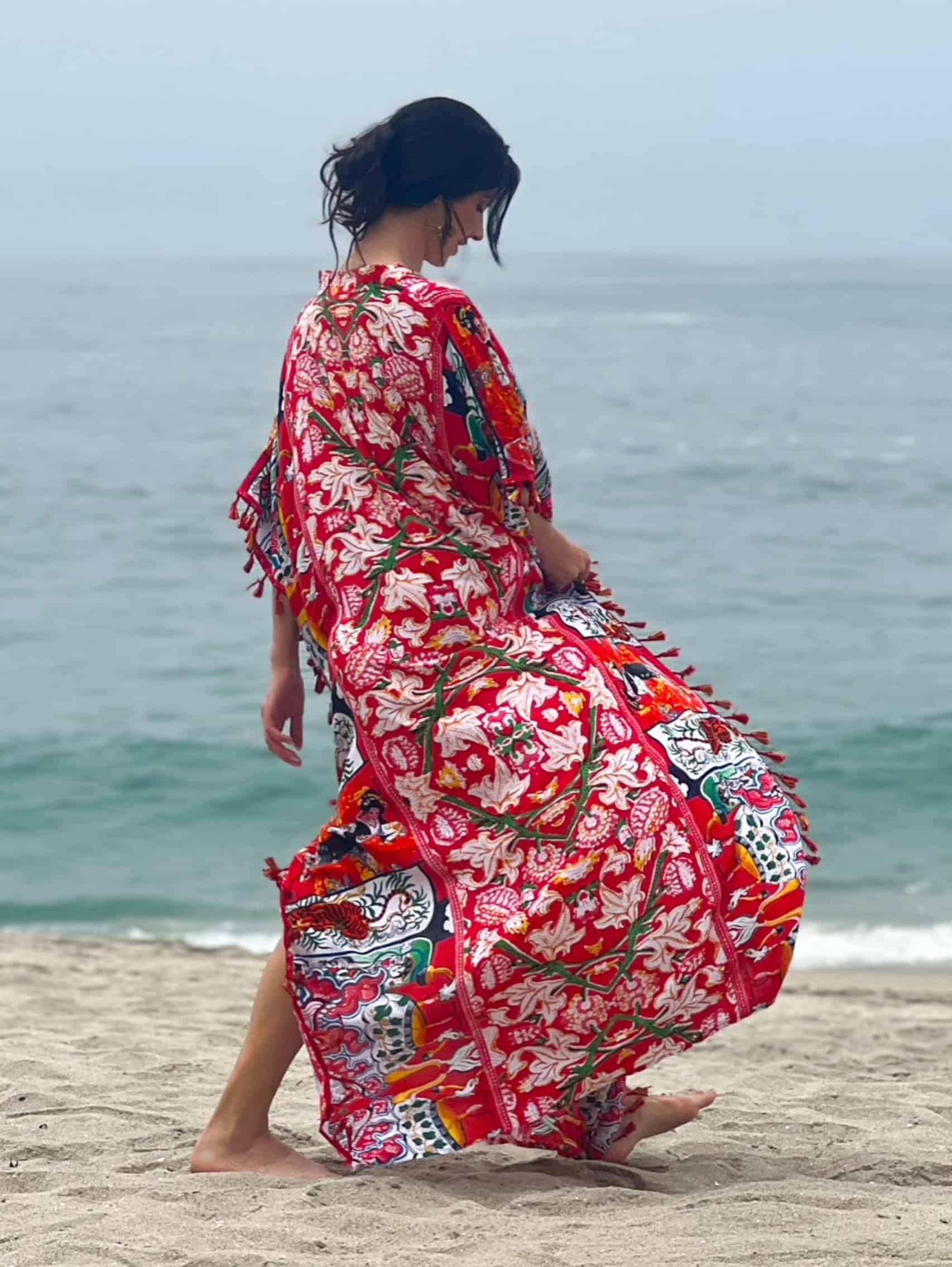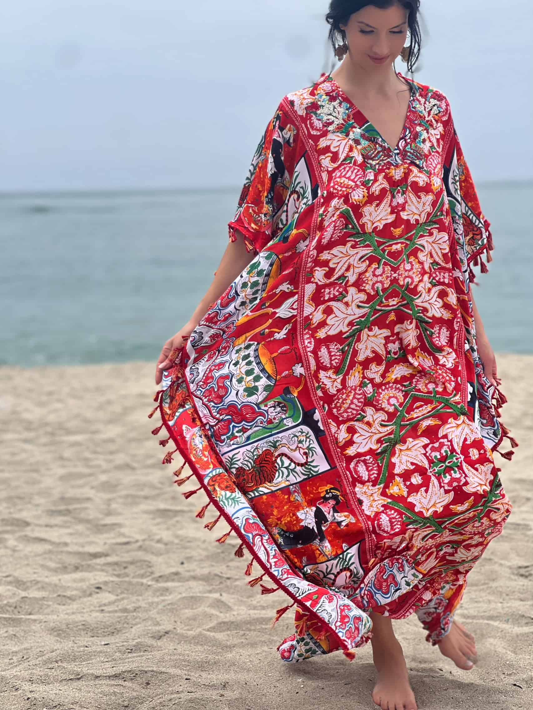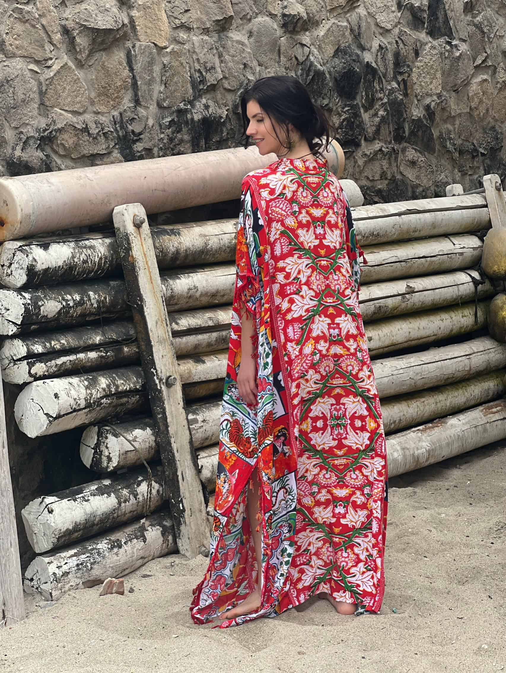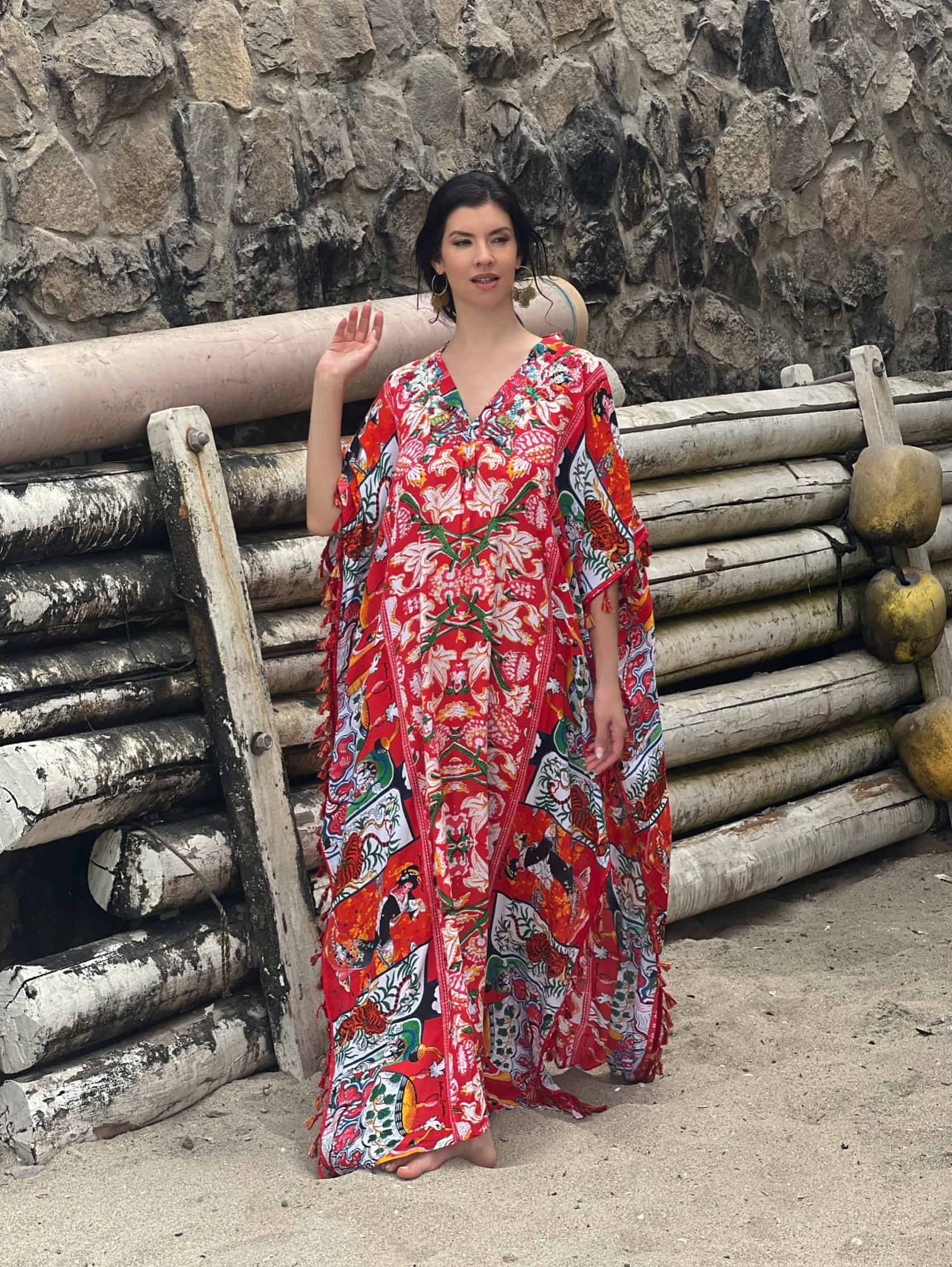 Kaftán largo con estampado y cuello en V. Su silueta amplia y fluida brinda frescura y comodidad, ideal para días de playa o para un look relajado y veraniego. Detalles decorativos en el borde añaden un toque artesanal y distintivo.