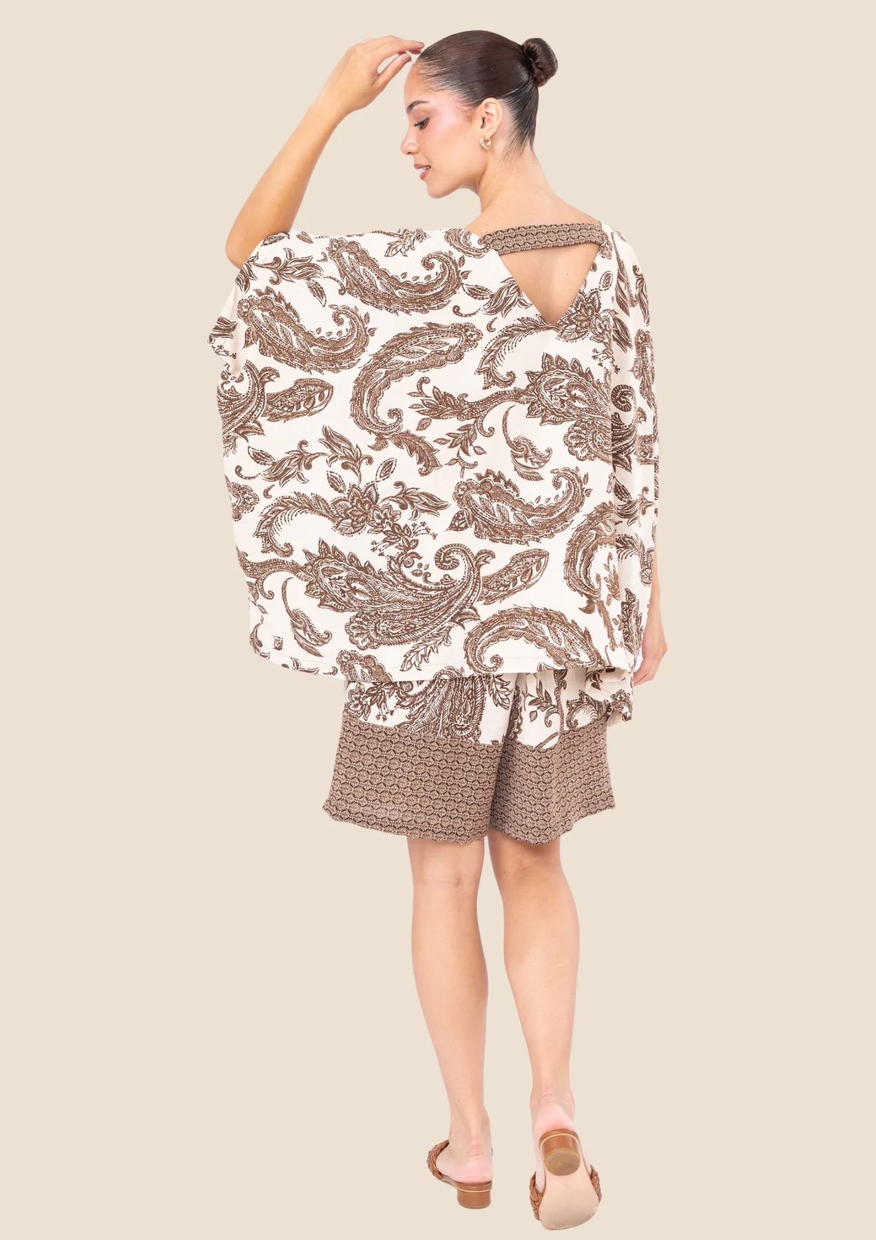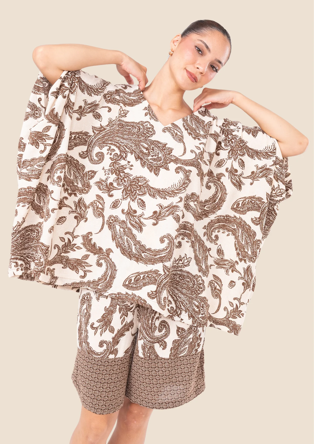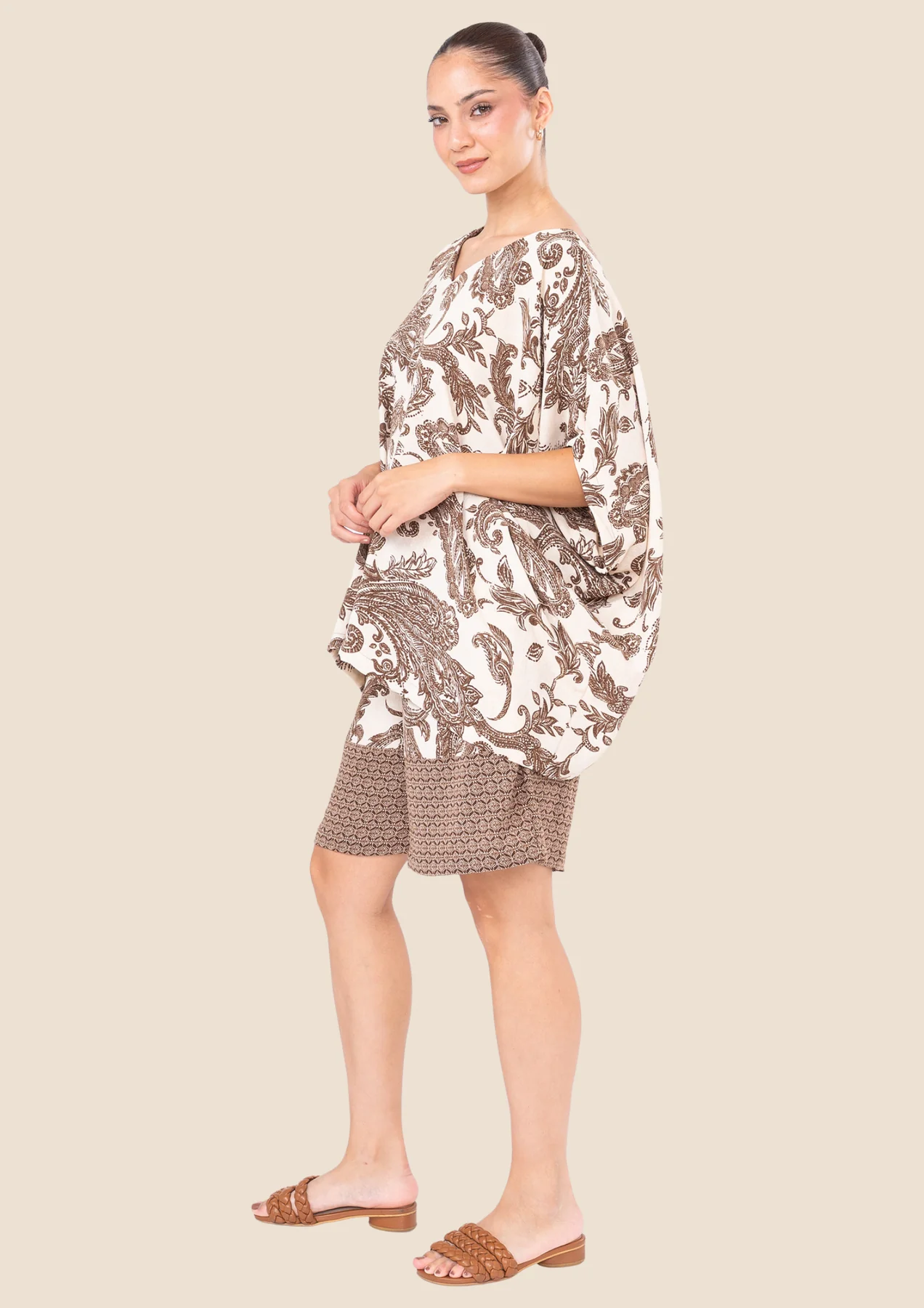 Conjunto de maxiblusa oversize y short. La Maxiblusa es cerrada con cuello en V y detalle de abertura discreta en V en la espalda; y el short es con elástico en todo el contorno de cintura. Caída suave y tela fresca, ideal para el verano.