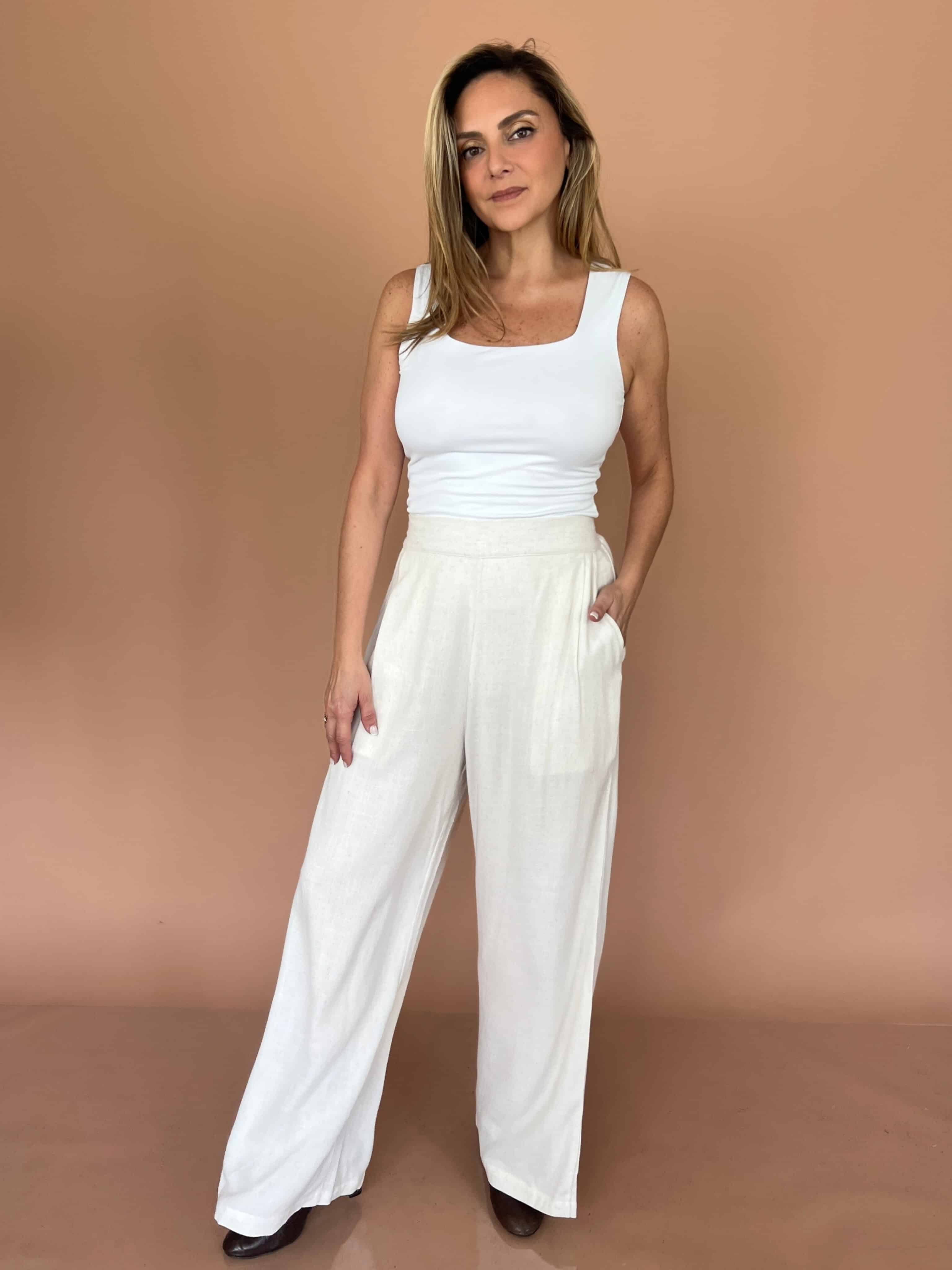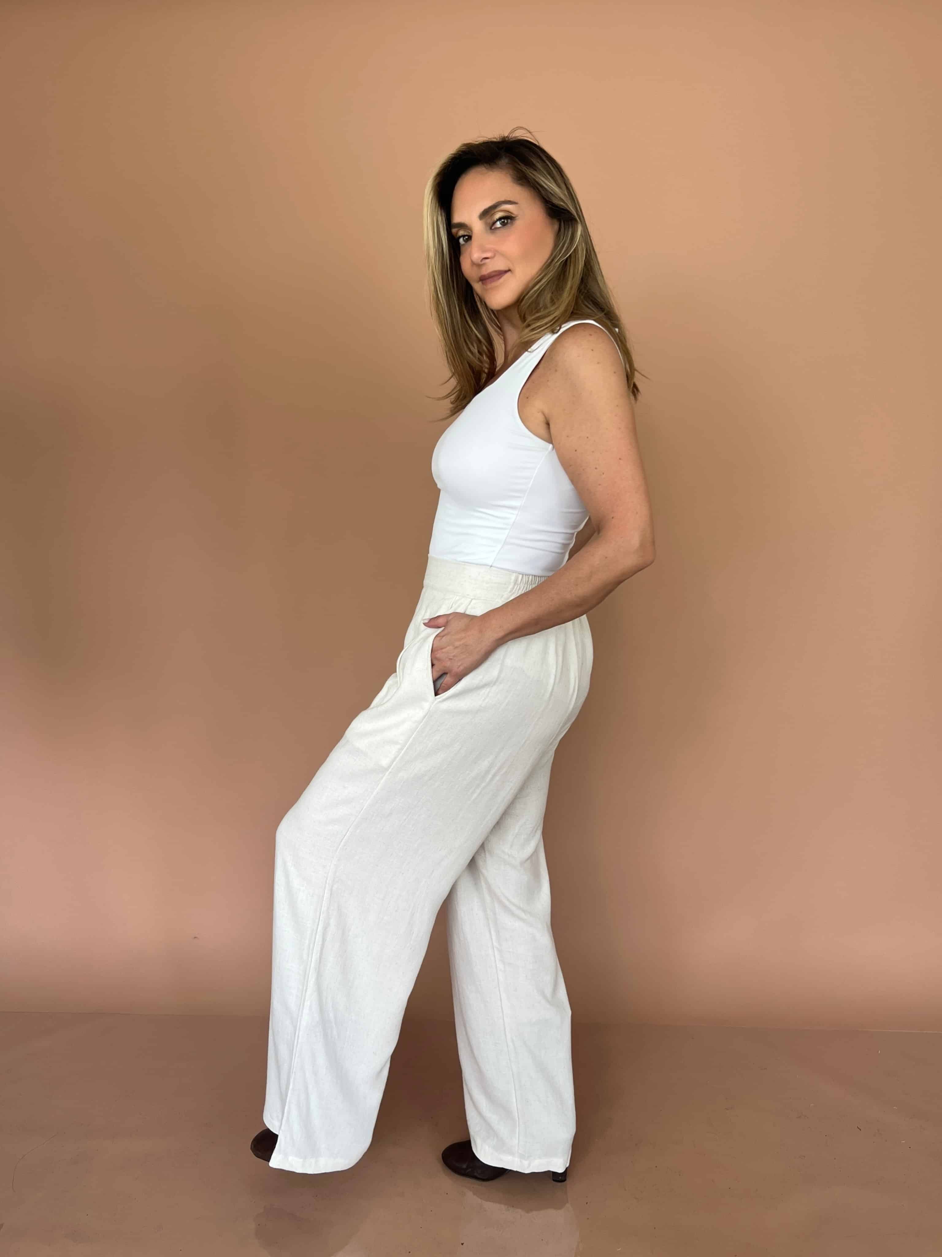 Pantalón de lino estilo palazzo, de corte amplio y caída ligera que aporta frescura y movimiento. Cuenta con bolsillos laterales y pretina posterior con elástico para mayor comodidad y ajuste. Una prenda versátil y elegante, ideal para looks relajados con un toque sofisticado.