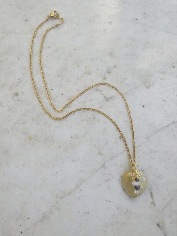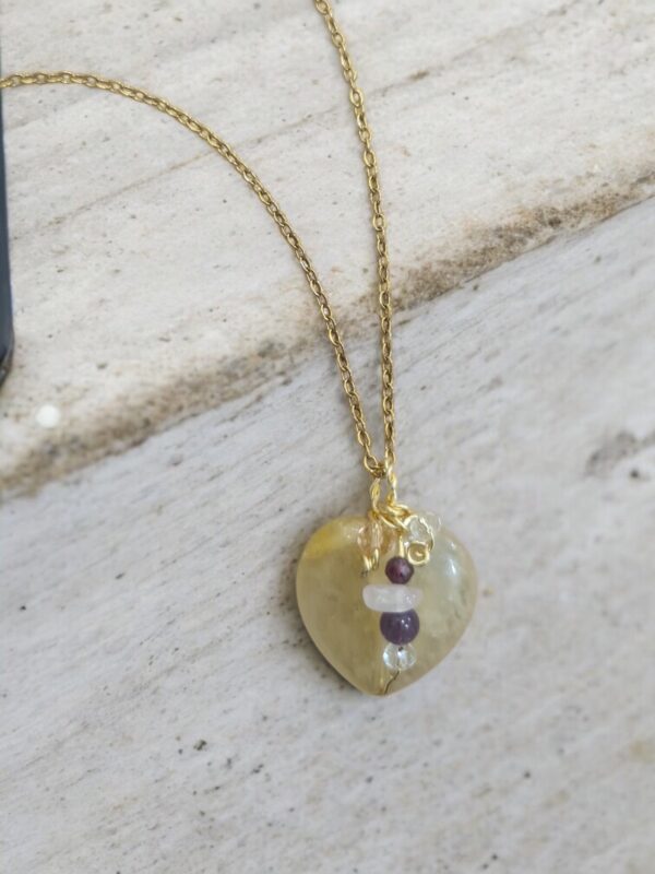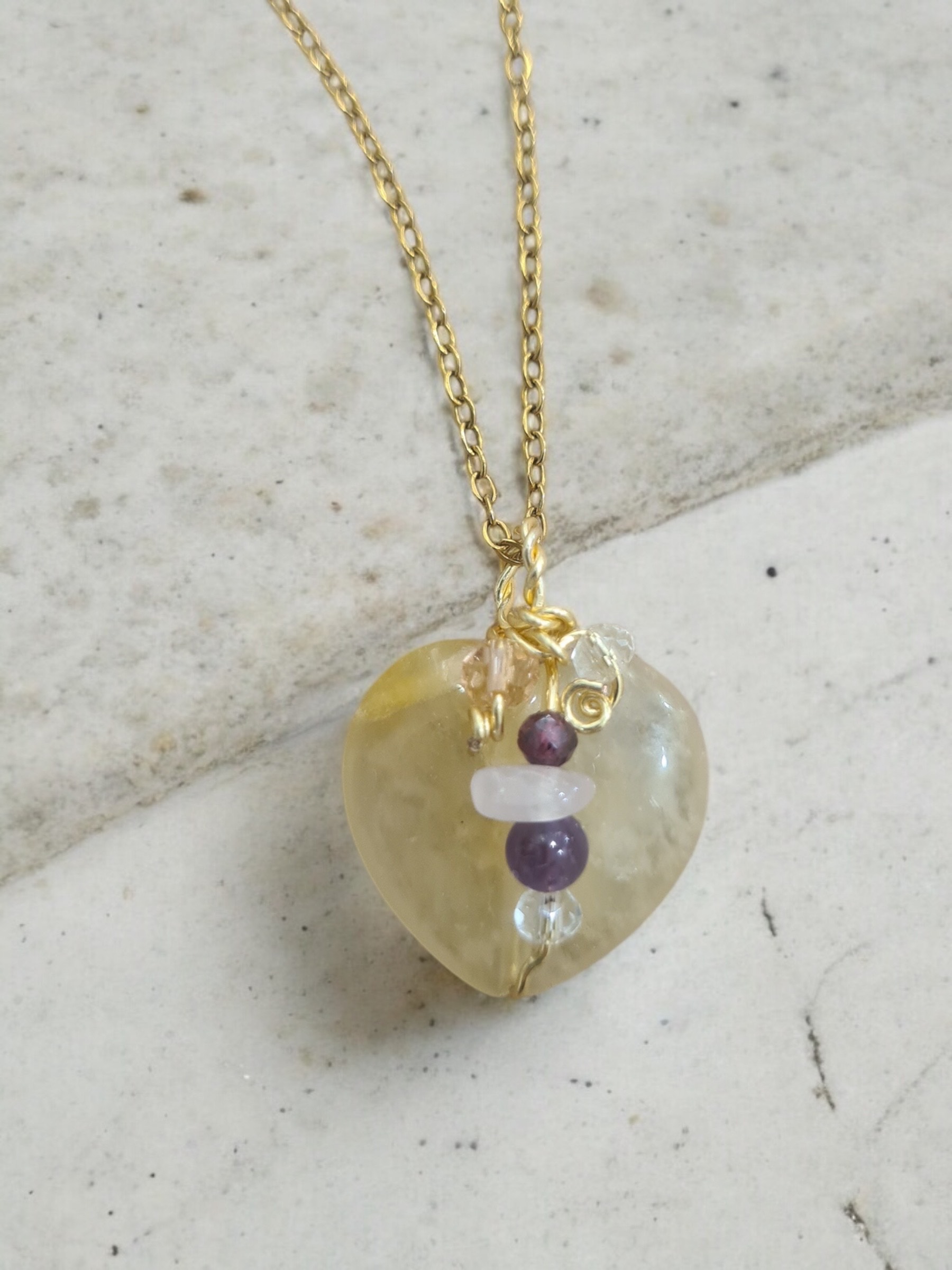 Collar corazón de citrino en cobre. Hecho a mano con diseño en forma de corazón. Acompañado de granate almandino (vitalidad), cuarzo rosa (sanación emocional), amatista (calma e intuición) y cuarzo cristal (claridad y equilibrio).