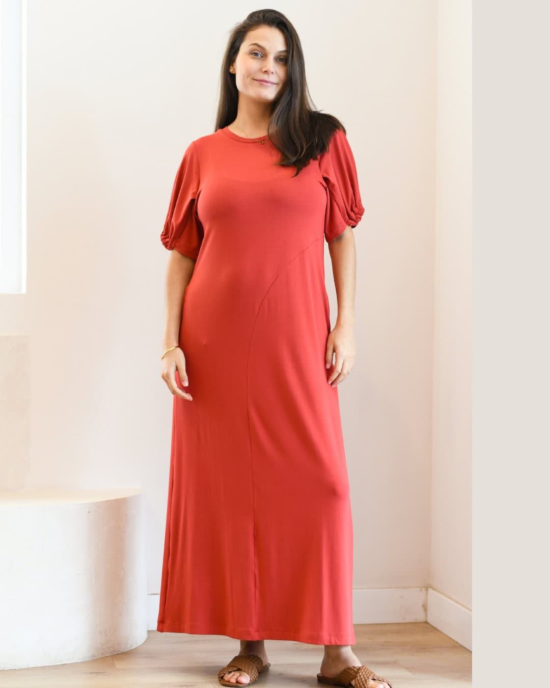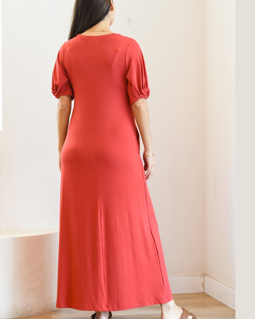 Vestido largo en algodón viscosa, de textura suave y fresca. Cuenta con cuello redondo, delicados detalles en las mangas de madera que aportan un toque femenino y bolsillos funcionales que suman comodidad y practicidad. Ideal para un look relajado, cómodo y elegante.