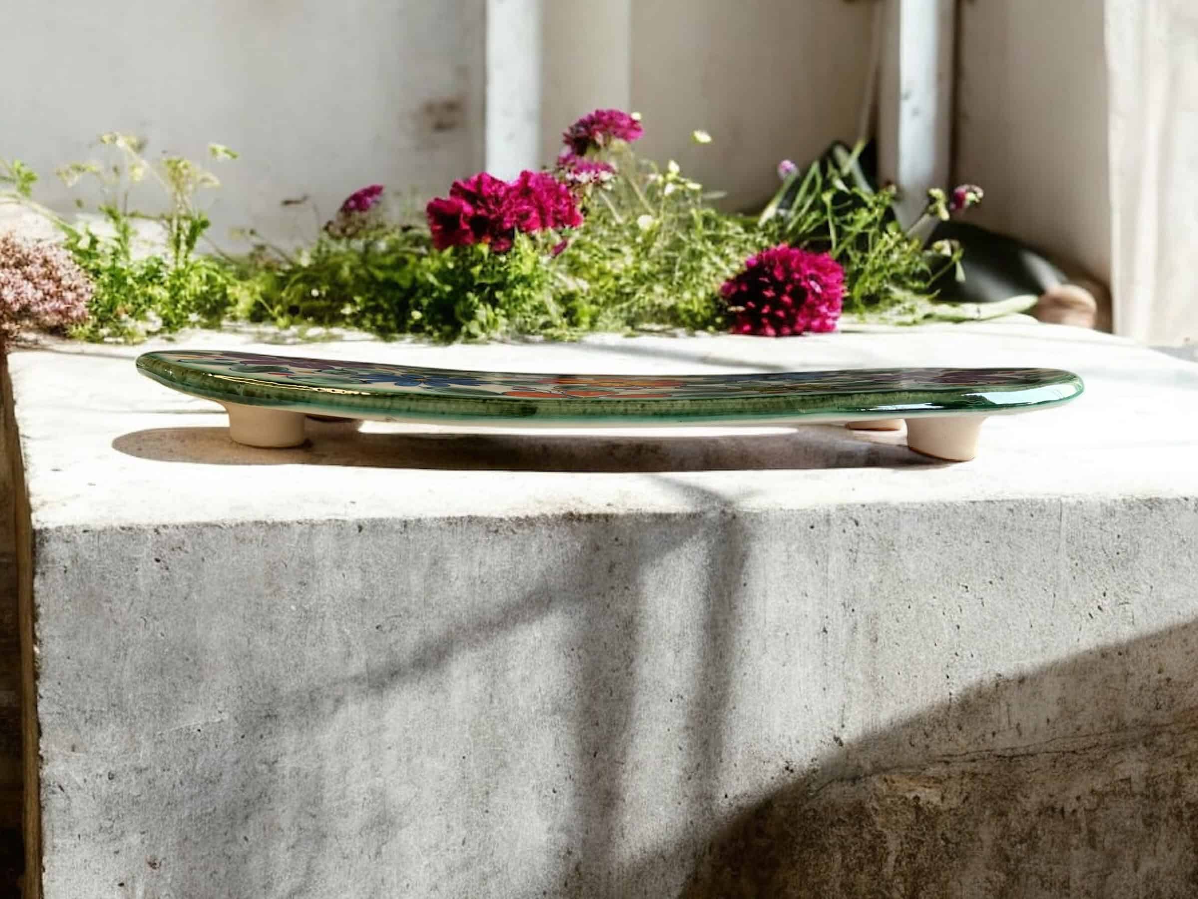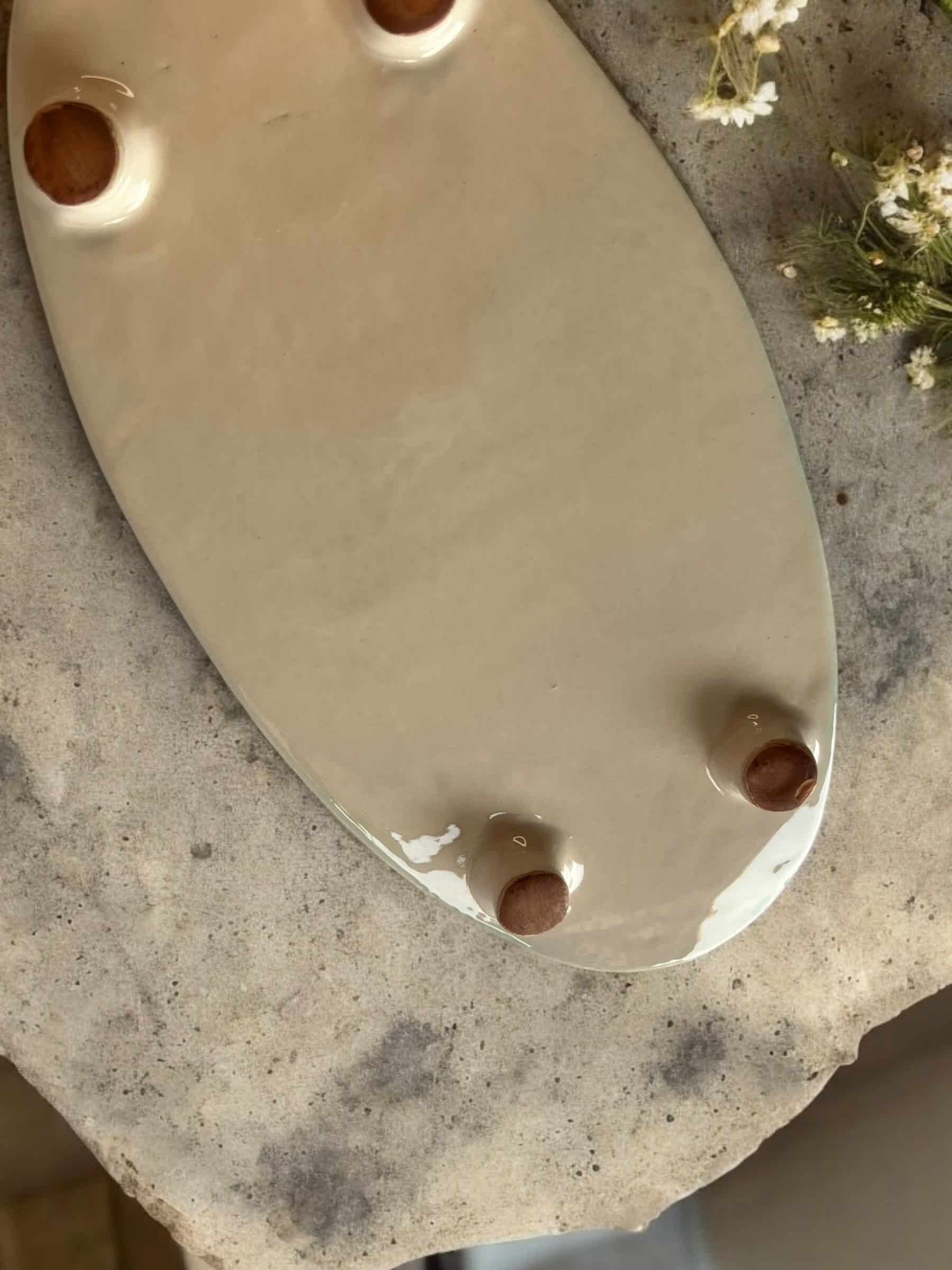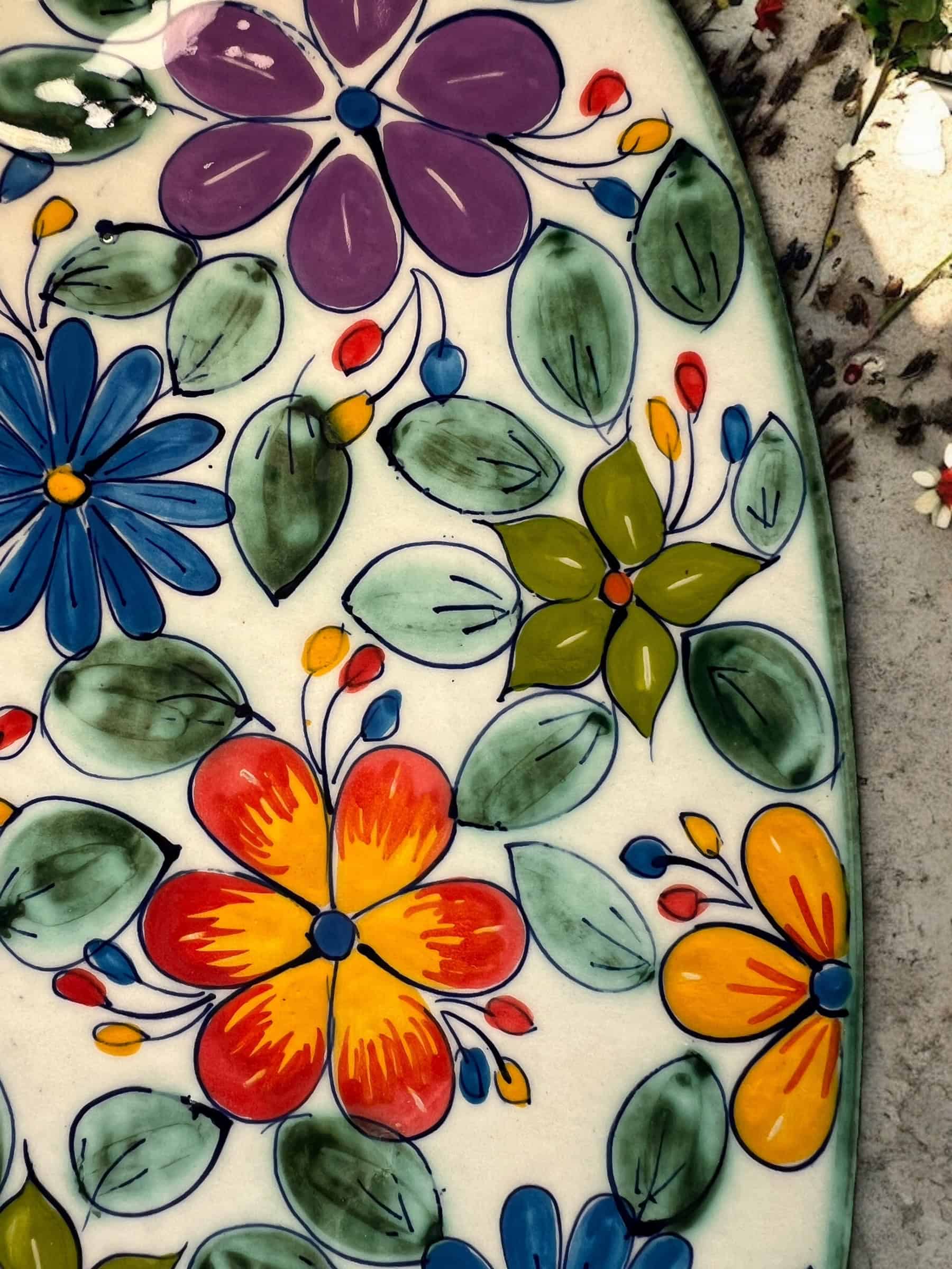 Fuente de cerámica con patitas, hecha y pintada a mano por artesanos limeños. Cada pieza es única por su elaboración artesanal. Perfecta para servir los acompañamientos que desees.