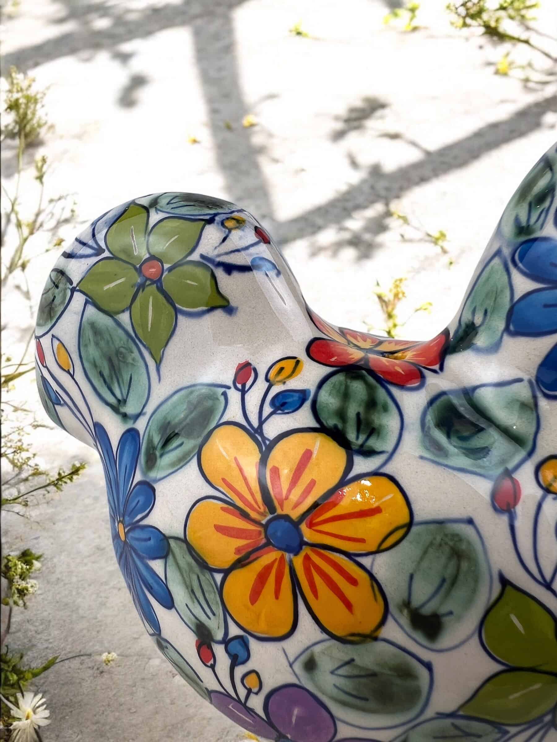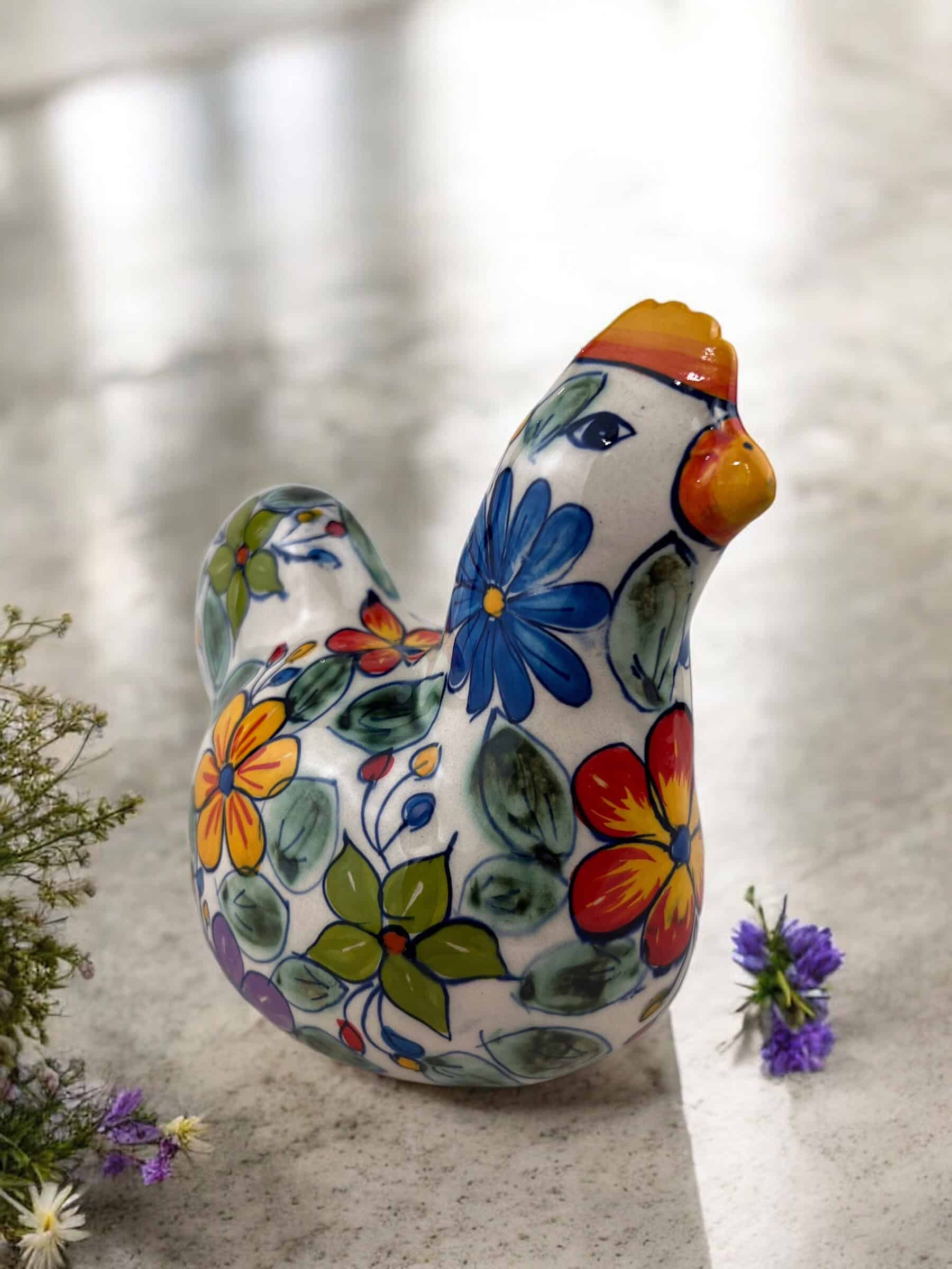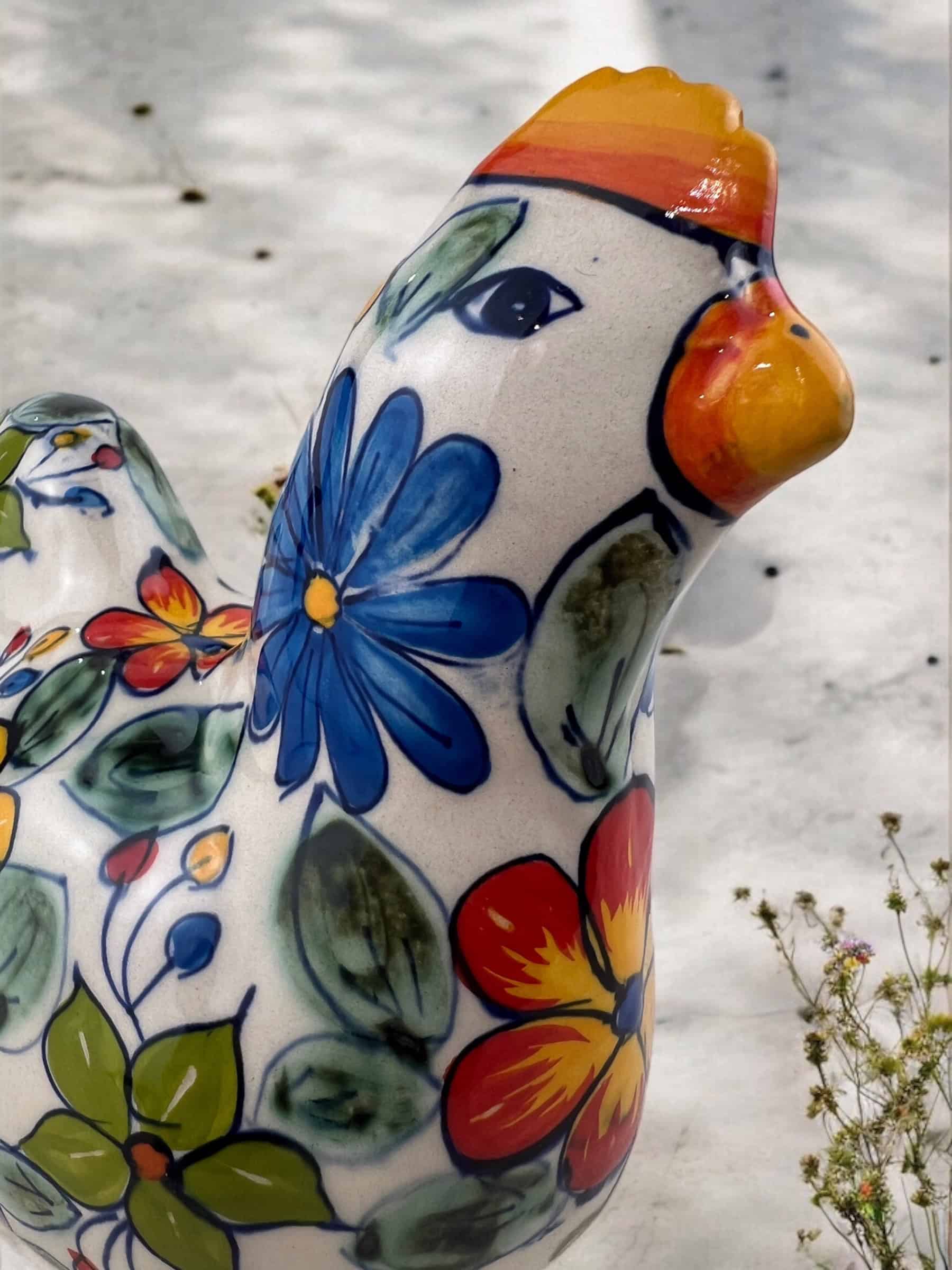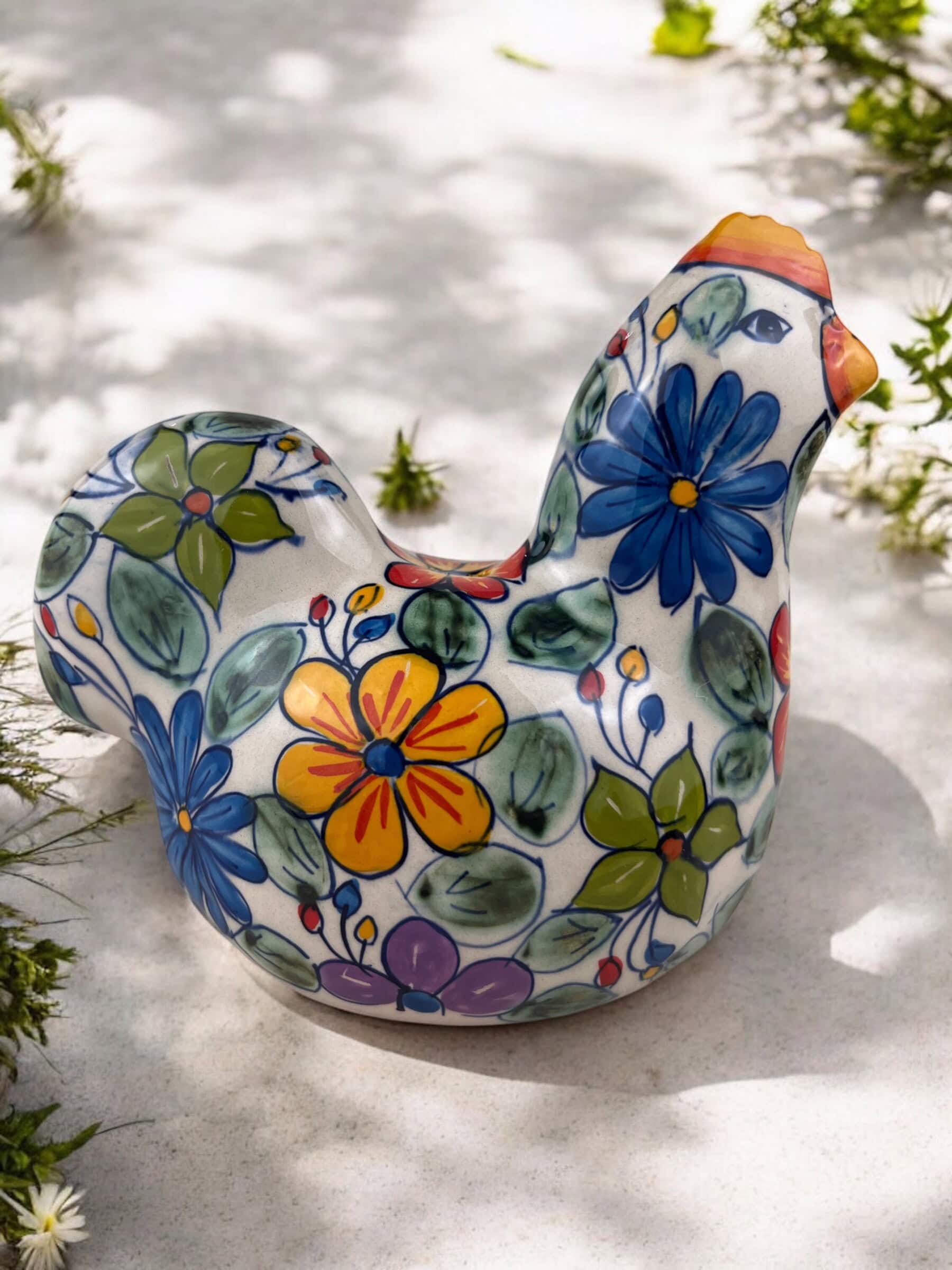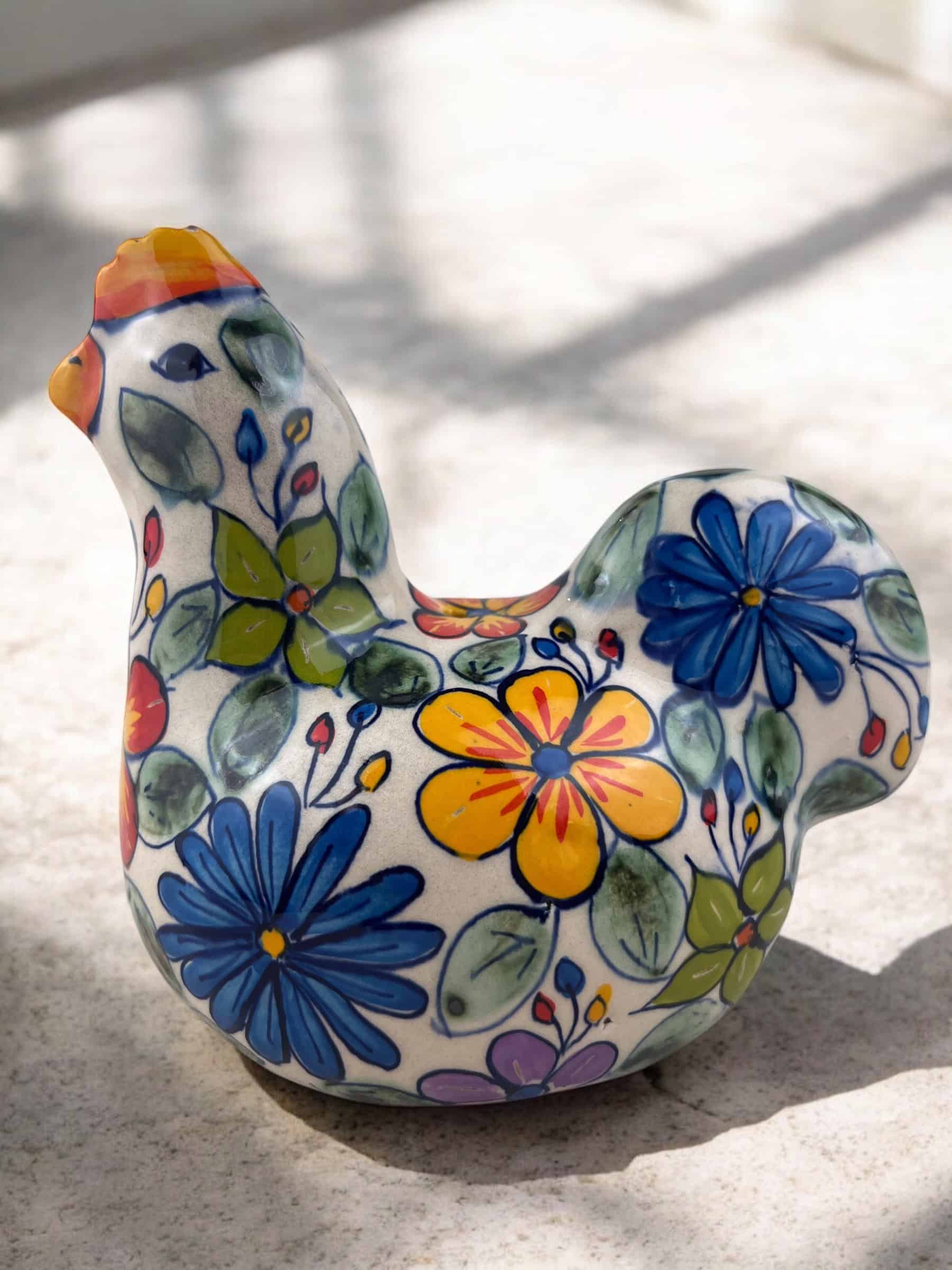 Gallinita de cerámica hecha y pintada a mano por artesanos limeños. Cada pieza es única por su elaboración artesanal.