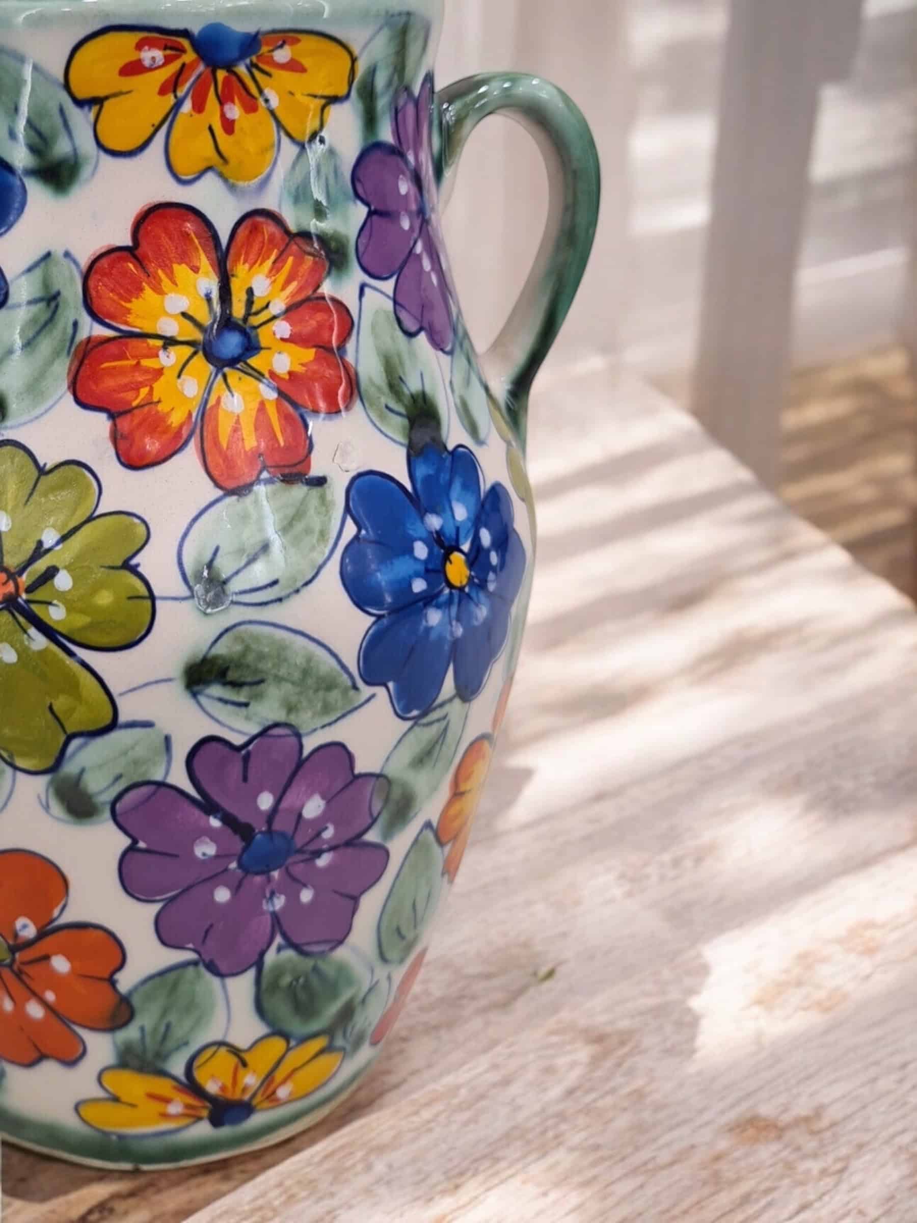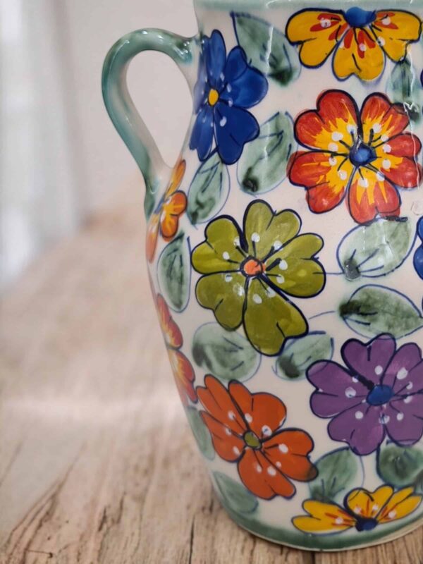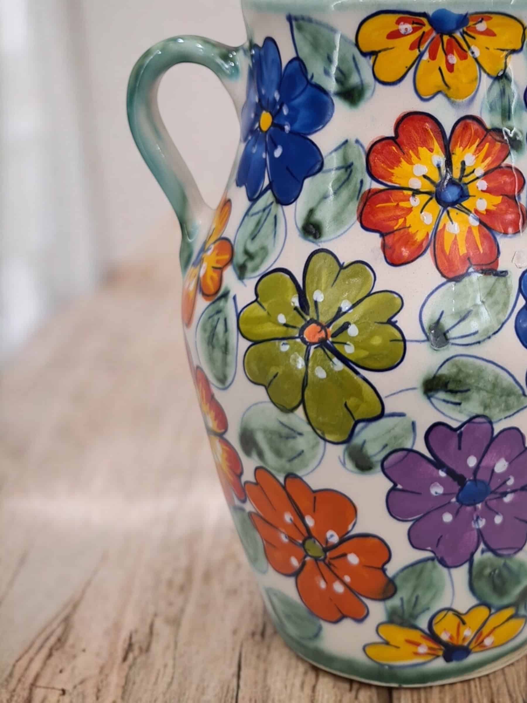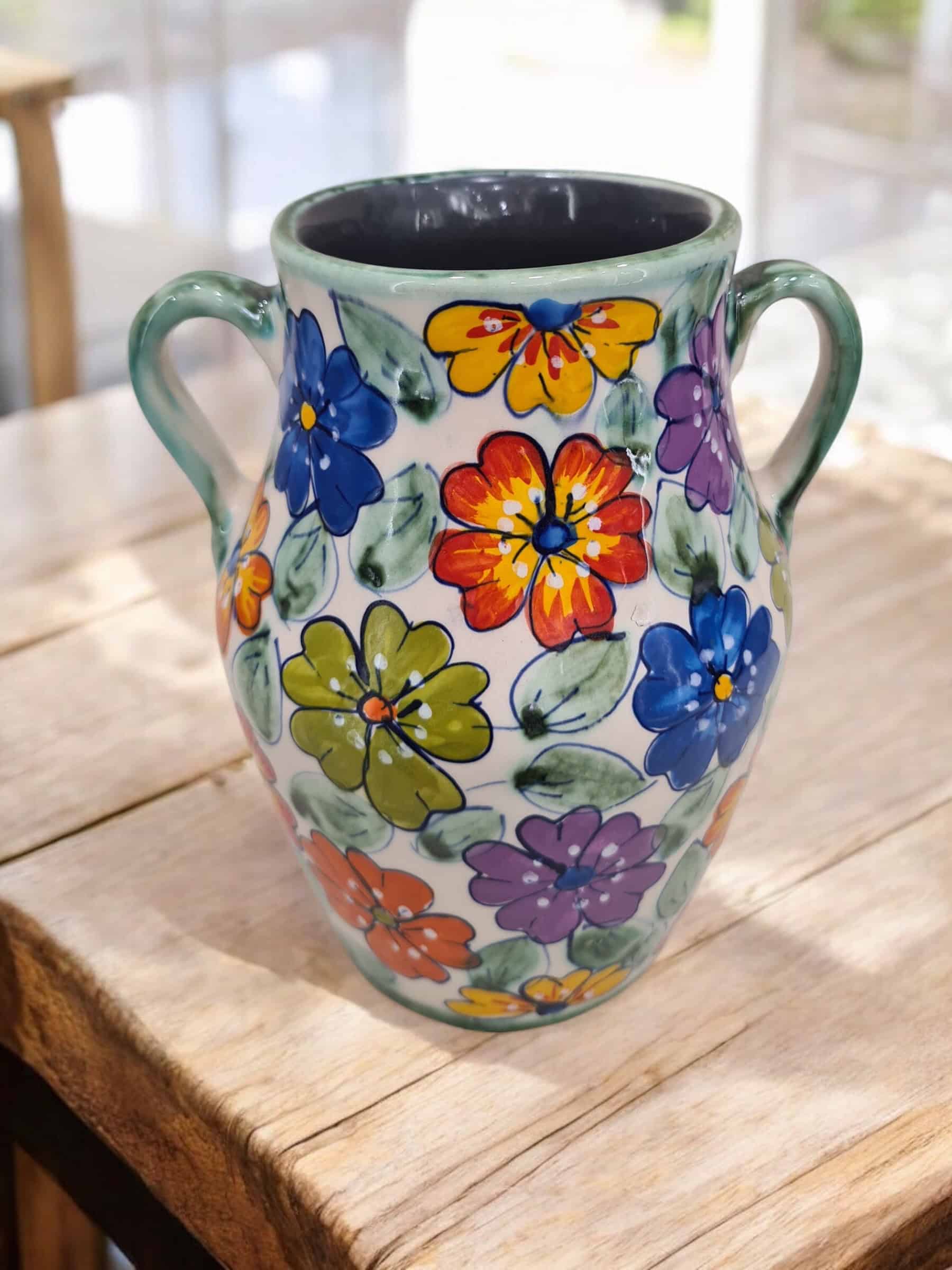 Florero de cerámica con dos asas hecha y pintada a mano por artesanos limeños. Ideales para tulipanes, rosas, girasoles, etc.