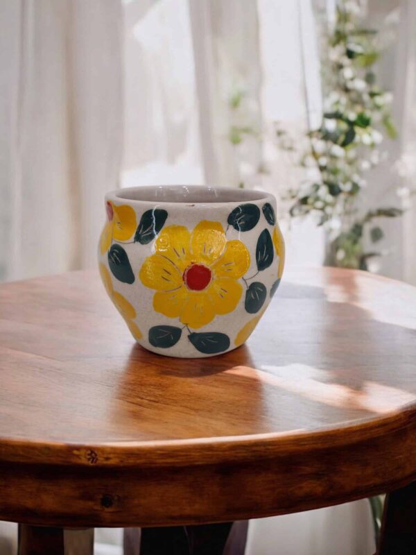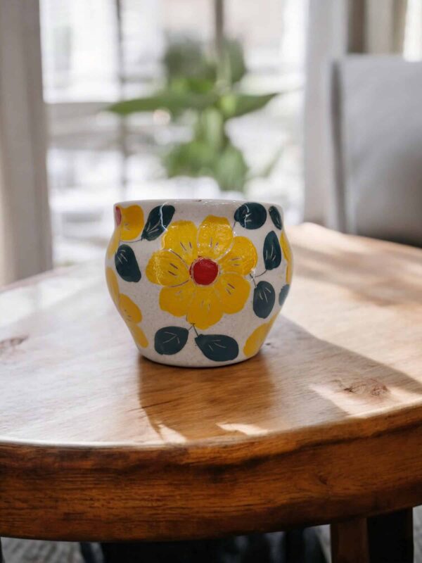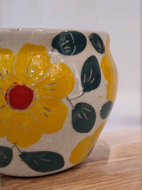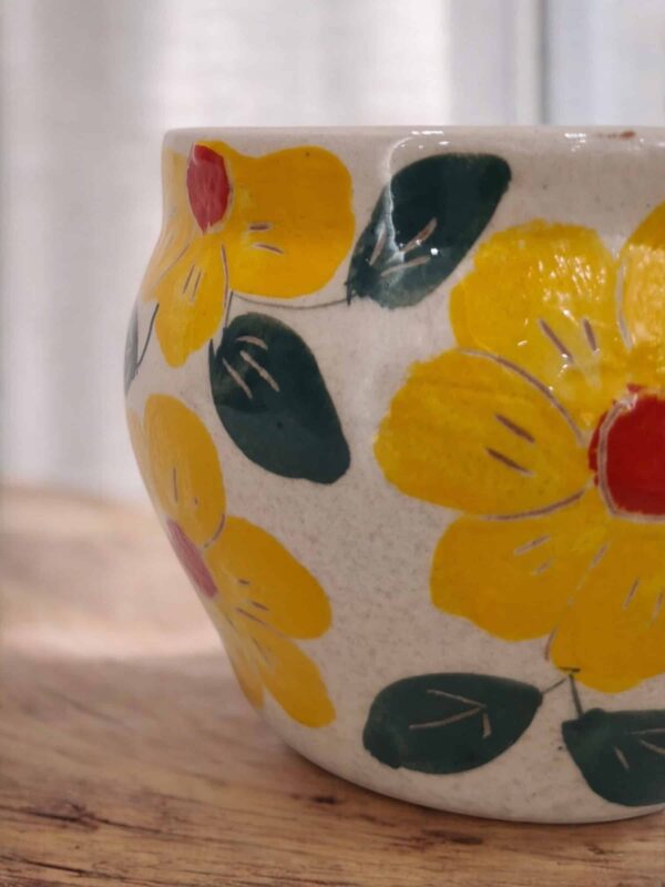 Macetin gordita de cerámica hecha y pintada a mano por artesanos limeños. Ideales para orquídeas, plantas aromáticas, plantas de temporada, etc.