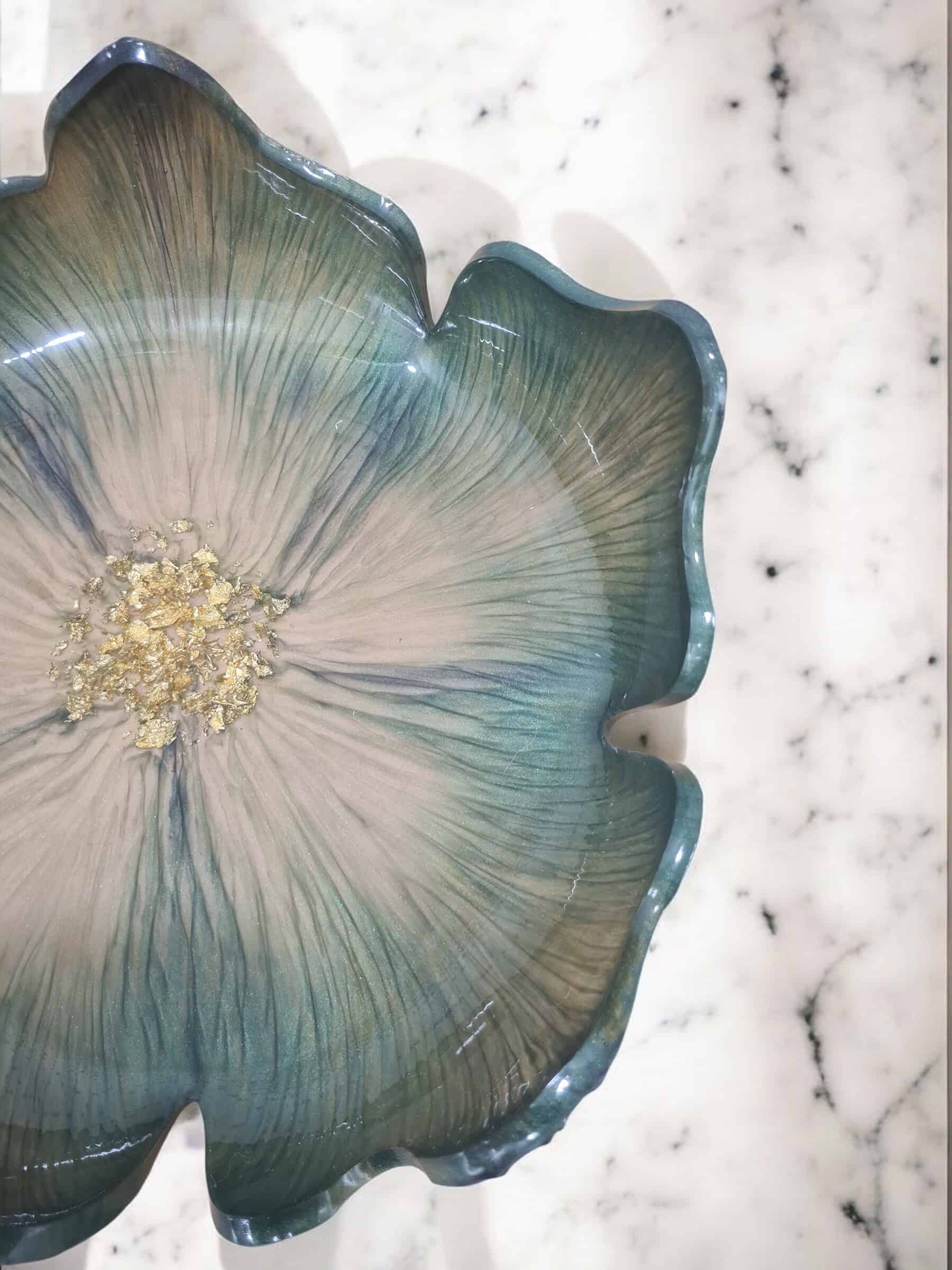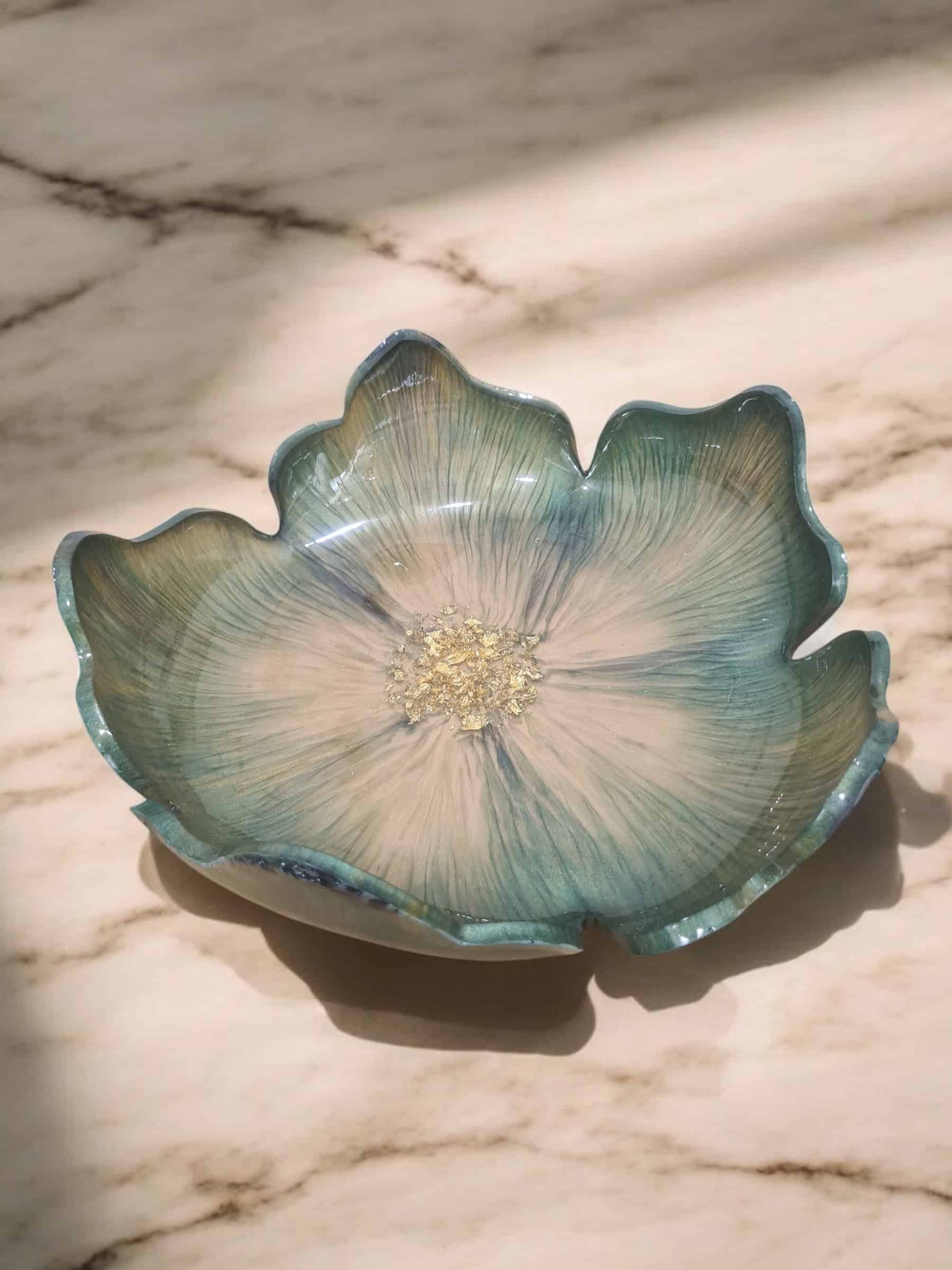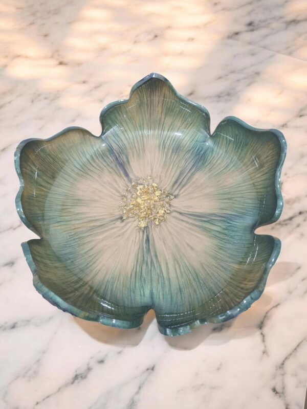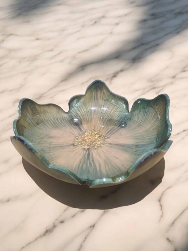 Bowl en forma de flor elaborado a mano en resina con acabado brillante. Su diseño combina elegancia y funcionalidad, ideal como pieza decorativa para el centro de mesa o para servir snacks. Ligero, resistente y fácil de limpiar.