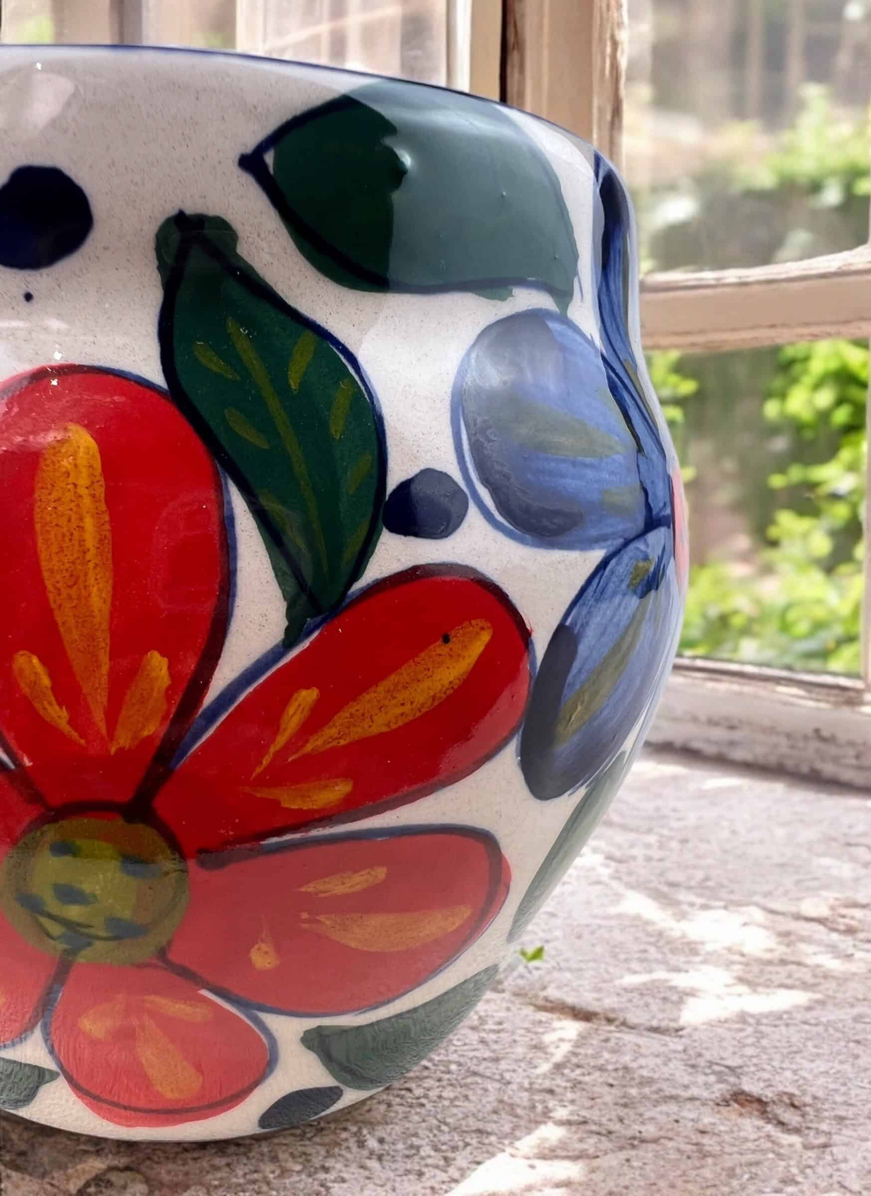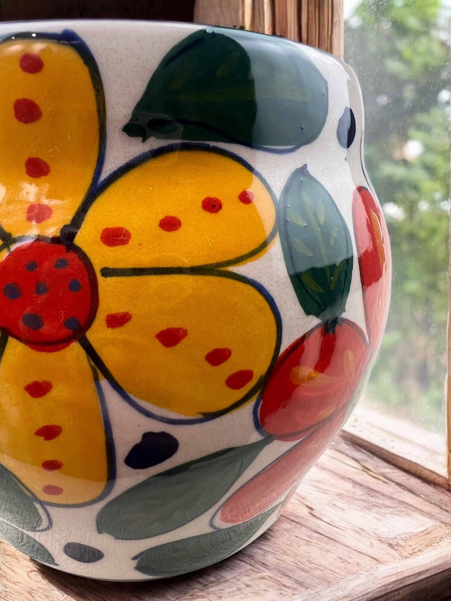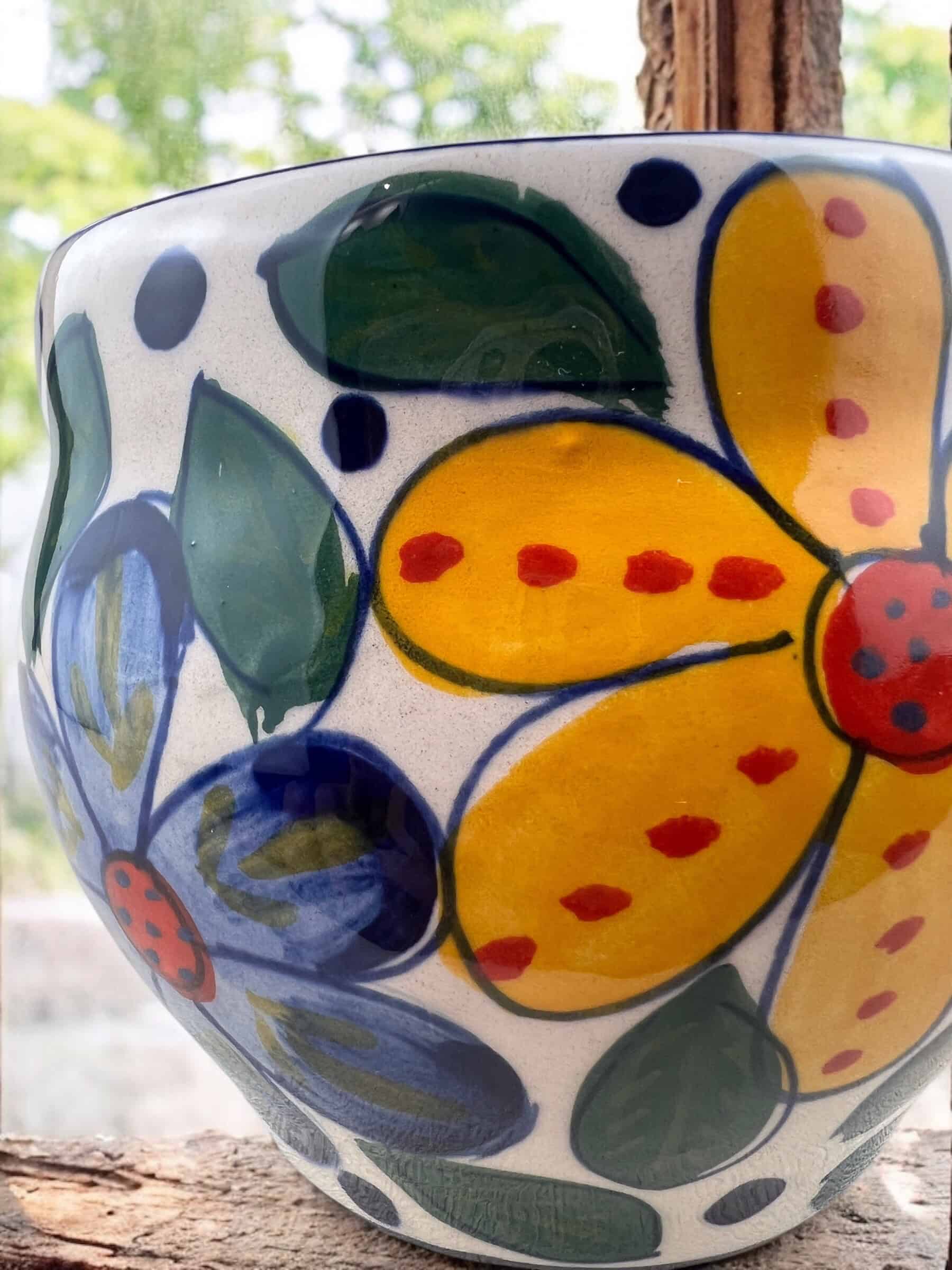Macetin gordita de cerámica hecha y pintada a mano por artesanos limeños. Ideales para orquídeas, plantas aromáticas, plantas de temporada, etc.