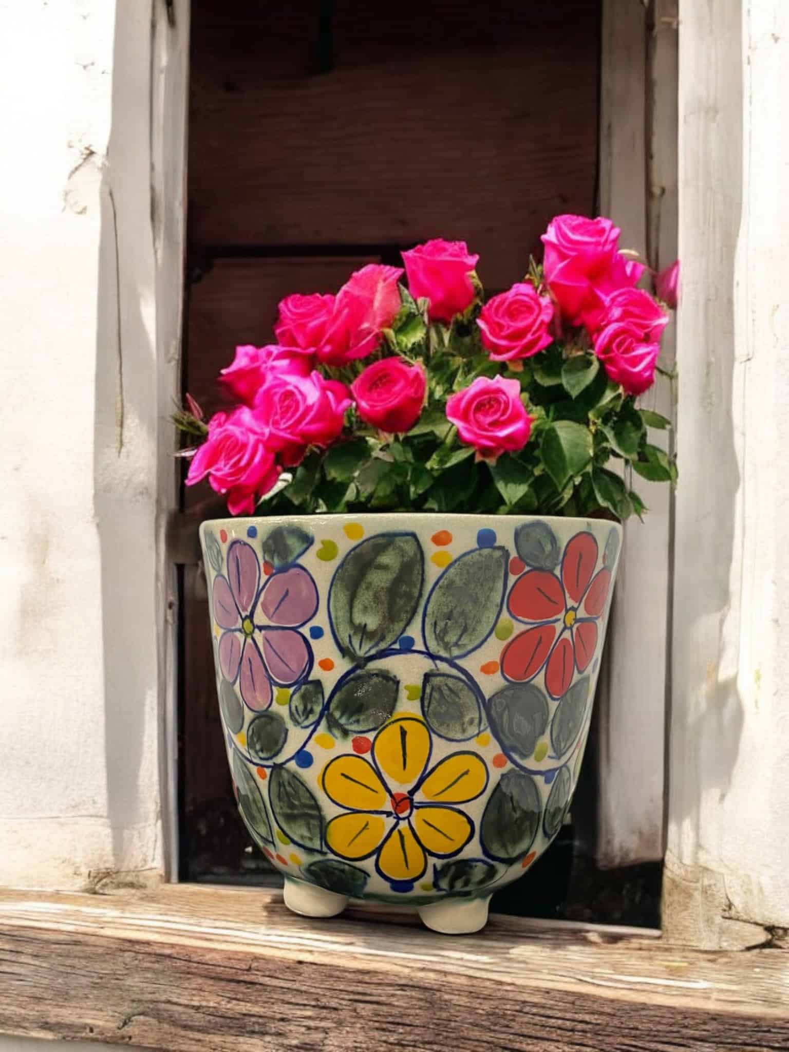 Maceta de cerámica hecha y pintada a mano por artesanos limeños. Ideal para orquídeas, plantas aromáticas, plantas de temporada, etc.