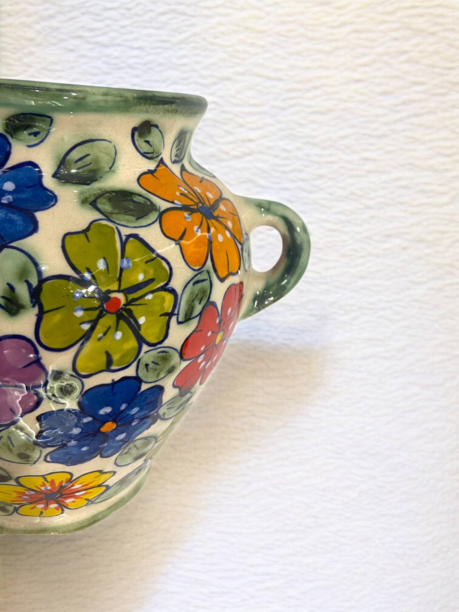Media maceta colgante de cerámica hecha y pintada a mano por artesanos limeños. Ideales para orquídeas, plantas aromáticas, plantas de temporada, etc.