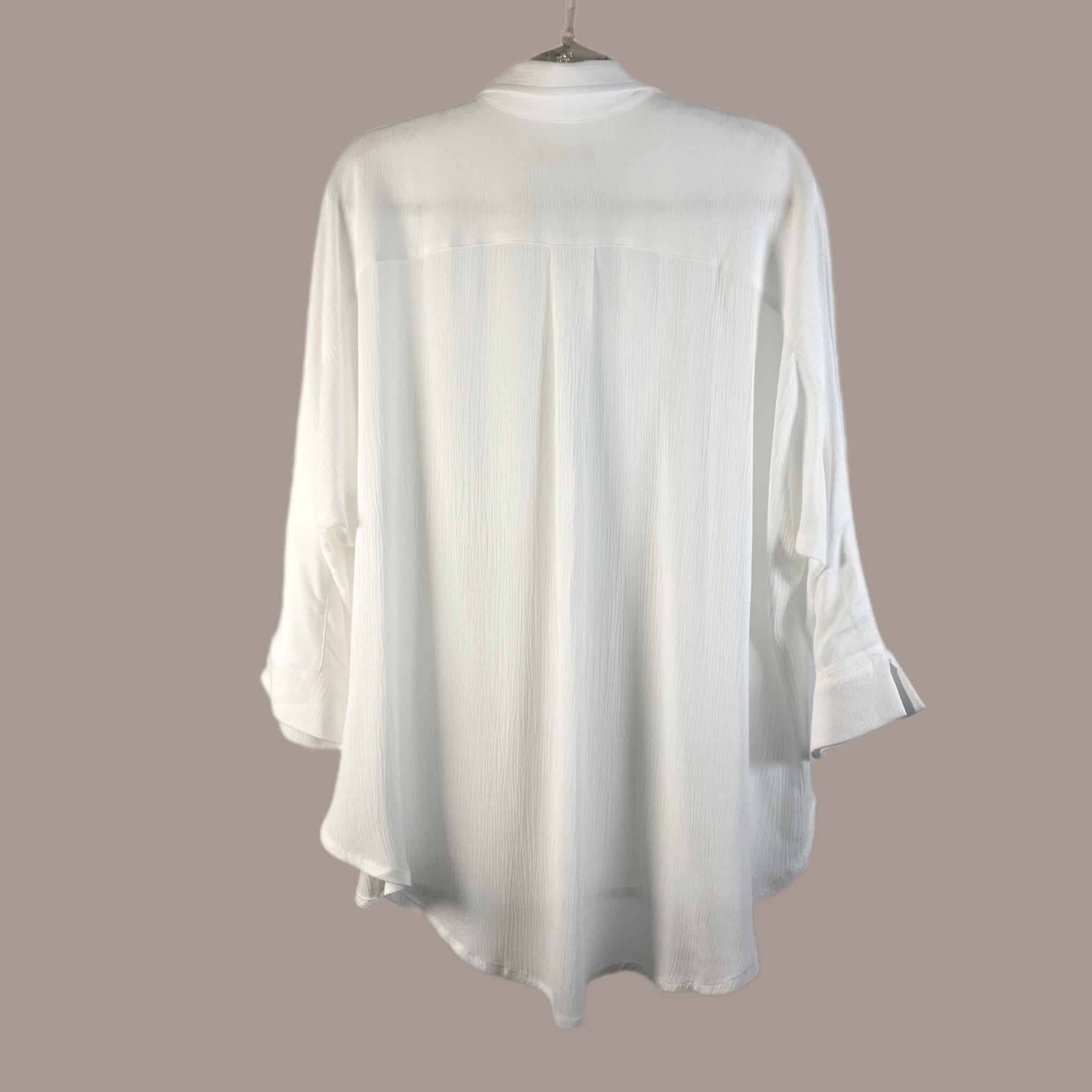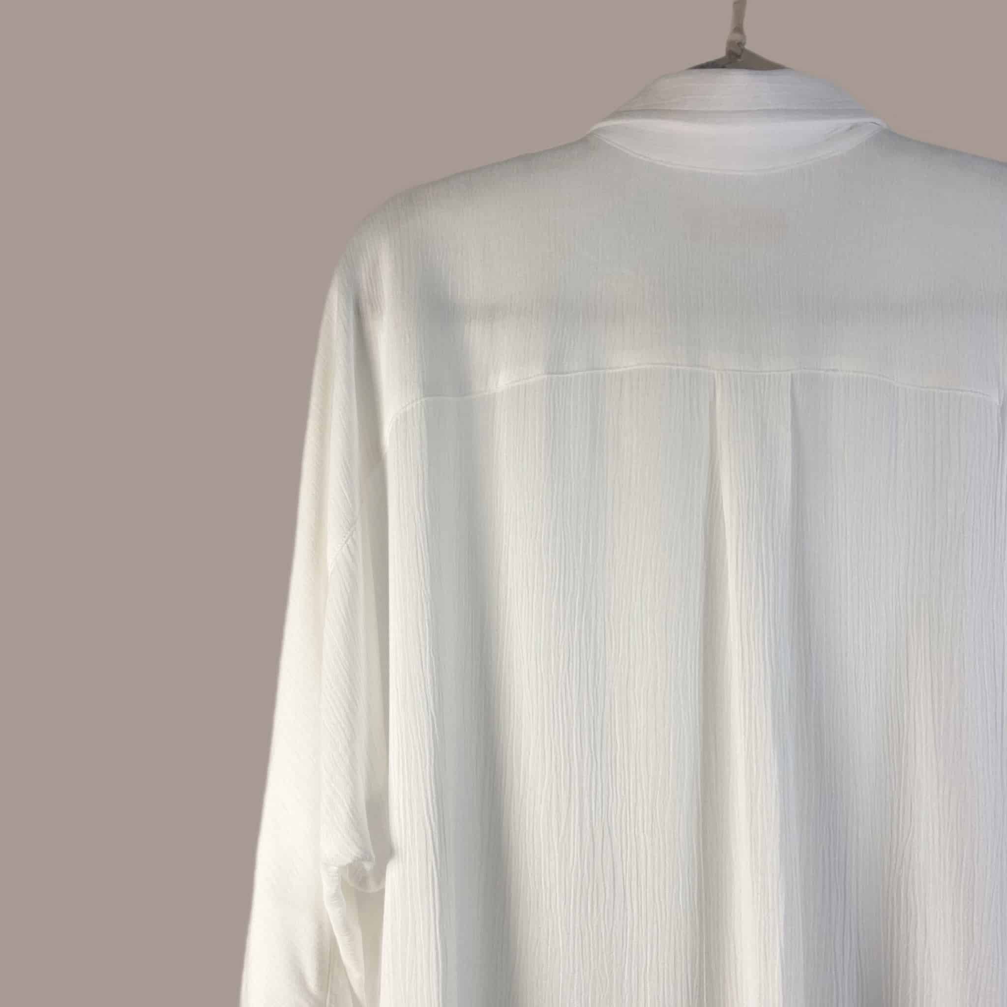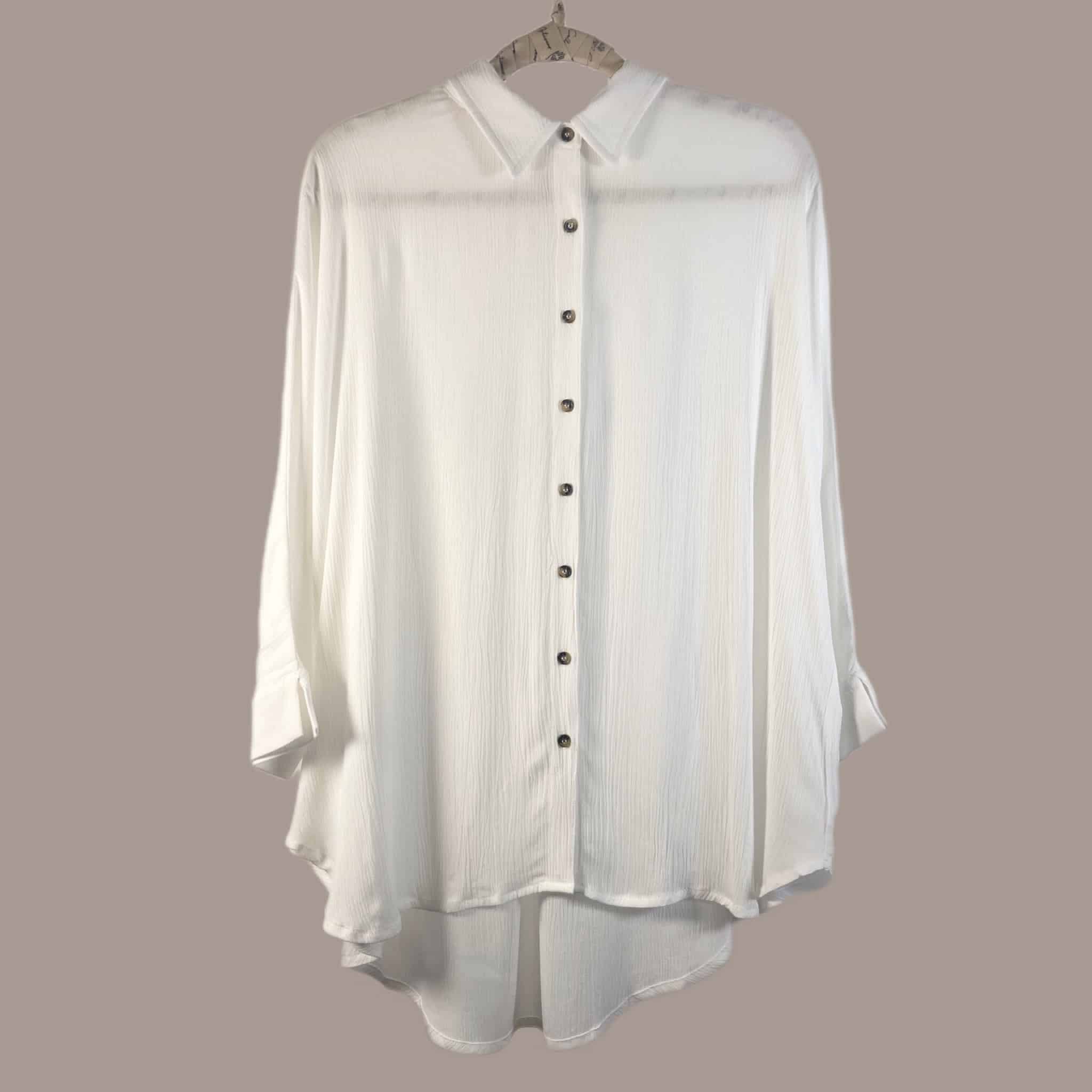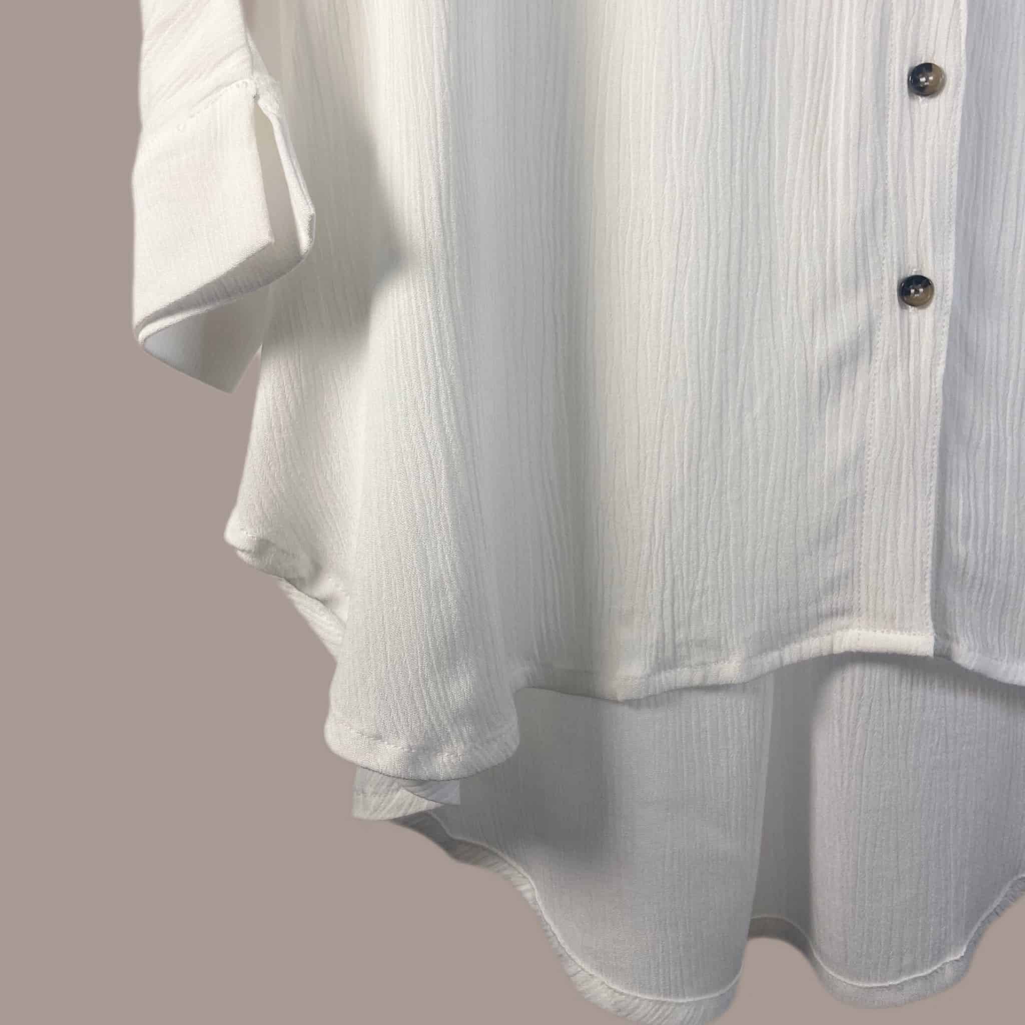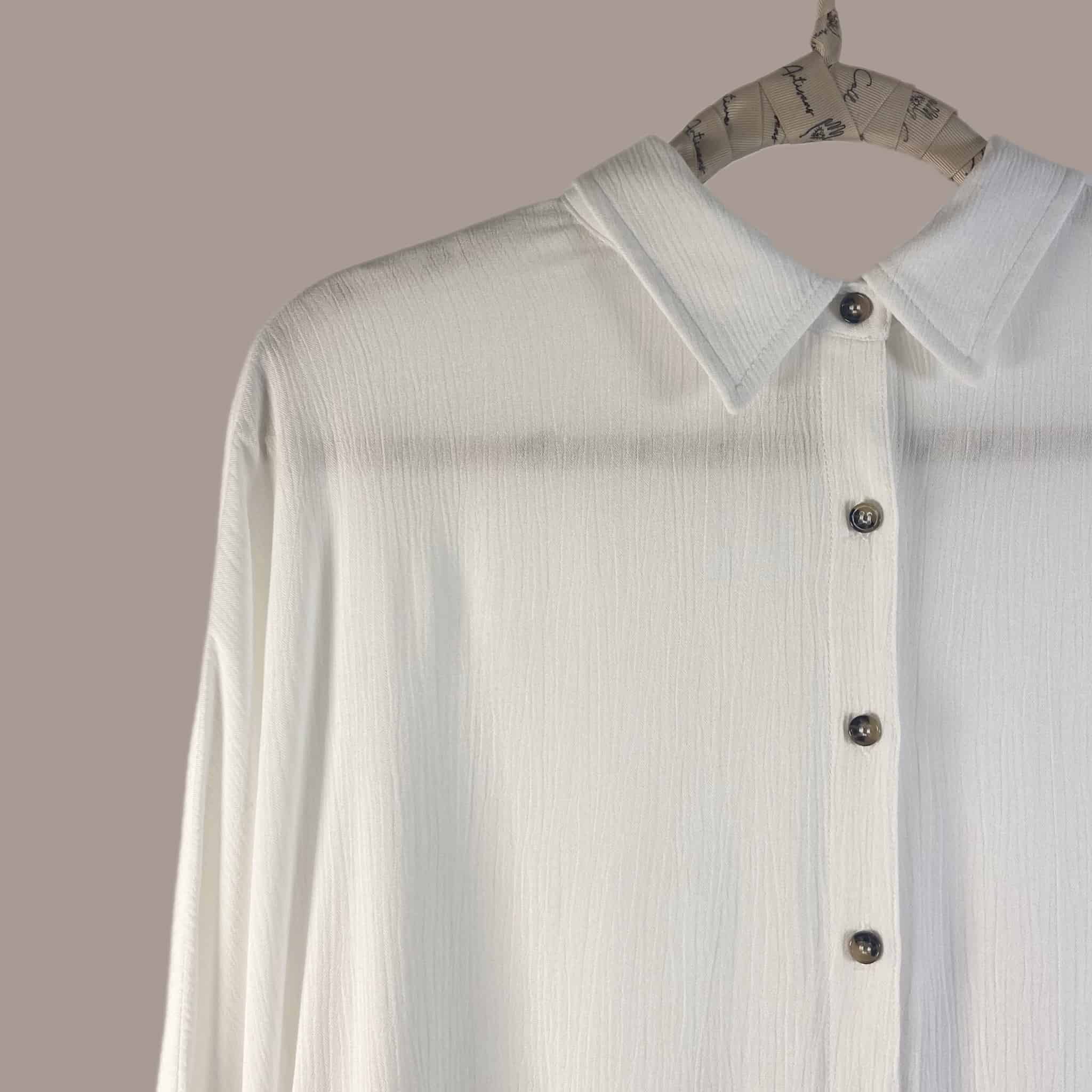 Blusa de rayón con efecto corrugado. Es una prenda súper fresca y liviana. Es de corte oversized, las mangas son de largo medio con una abertura en los puños, las cuales pueden doblarse y tiene botones marmoleados que hacen contraste.
