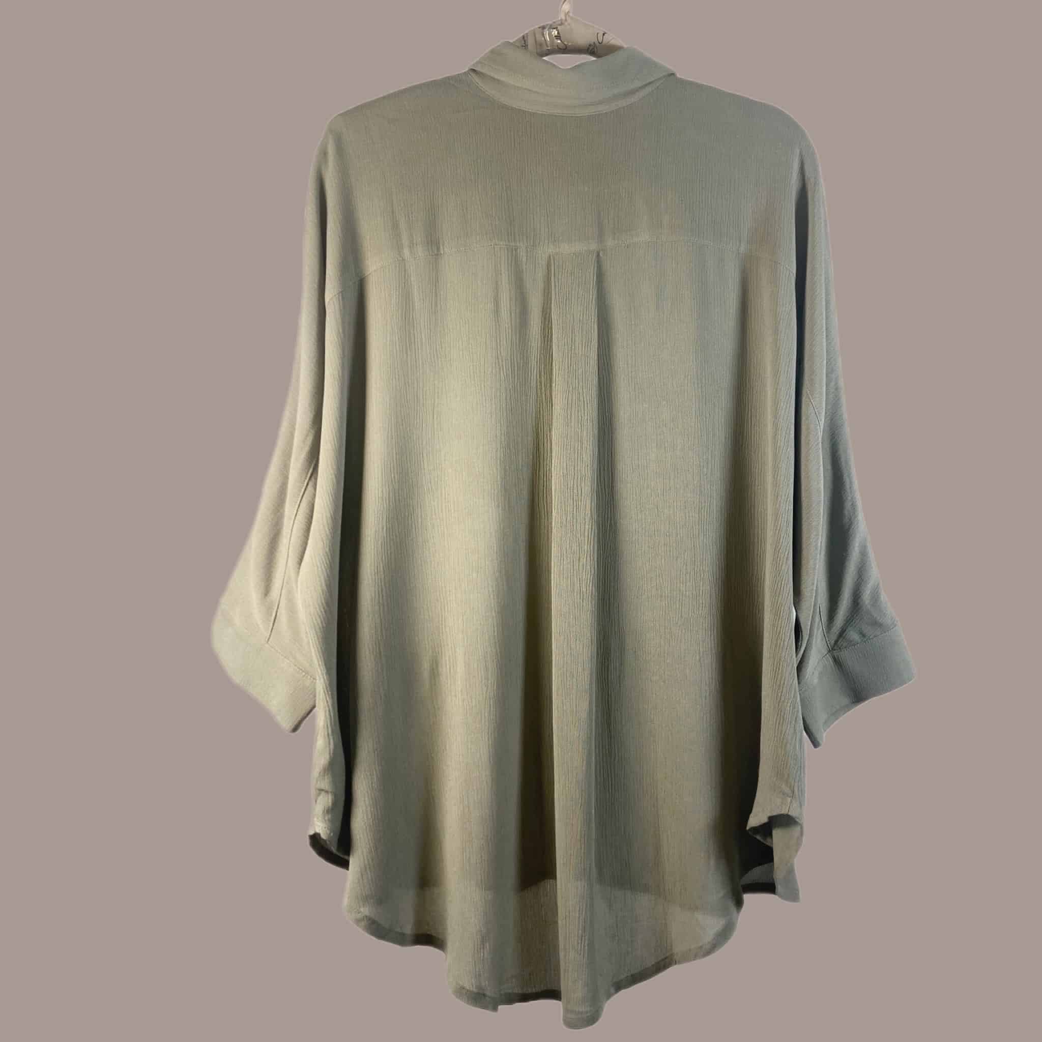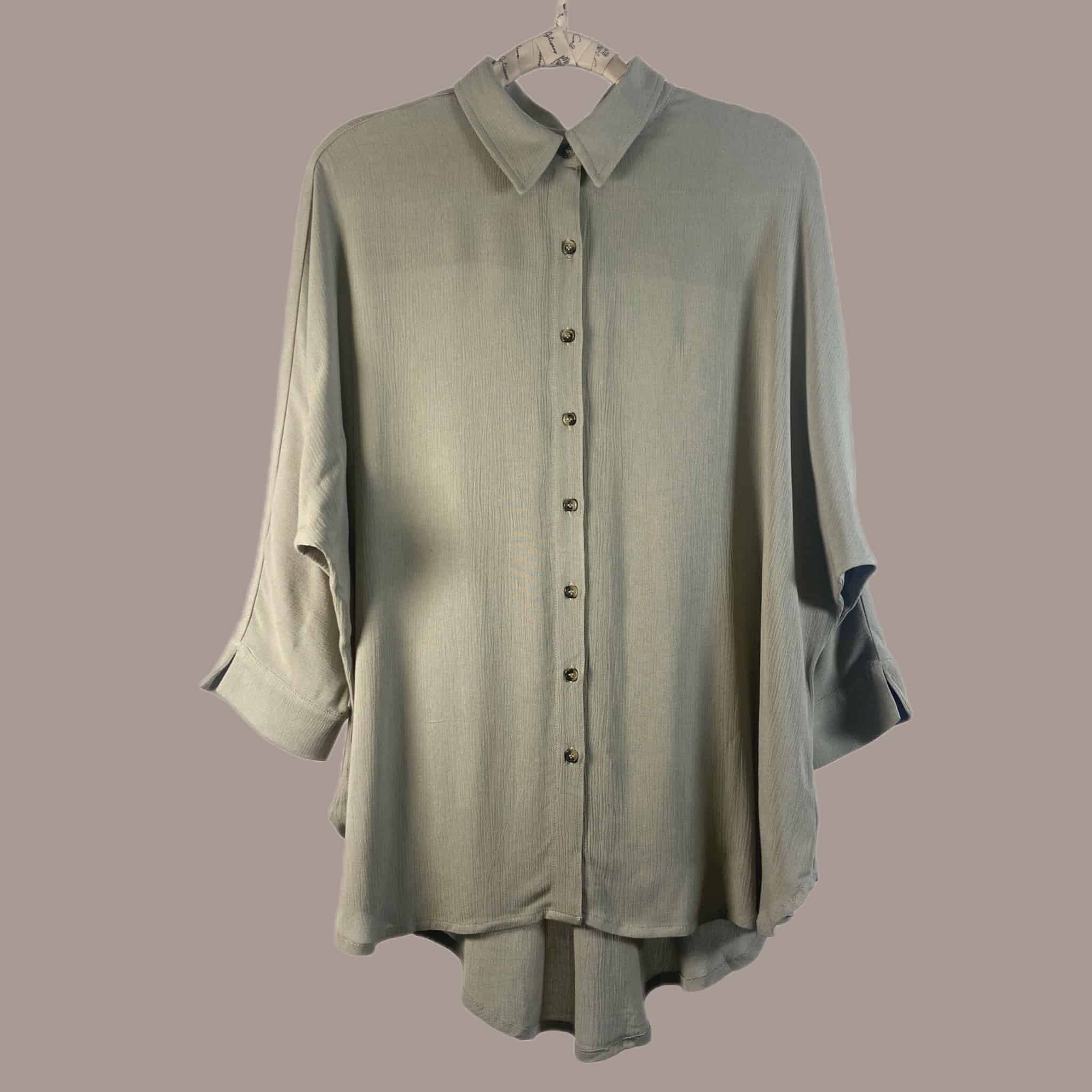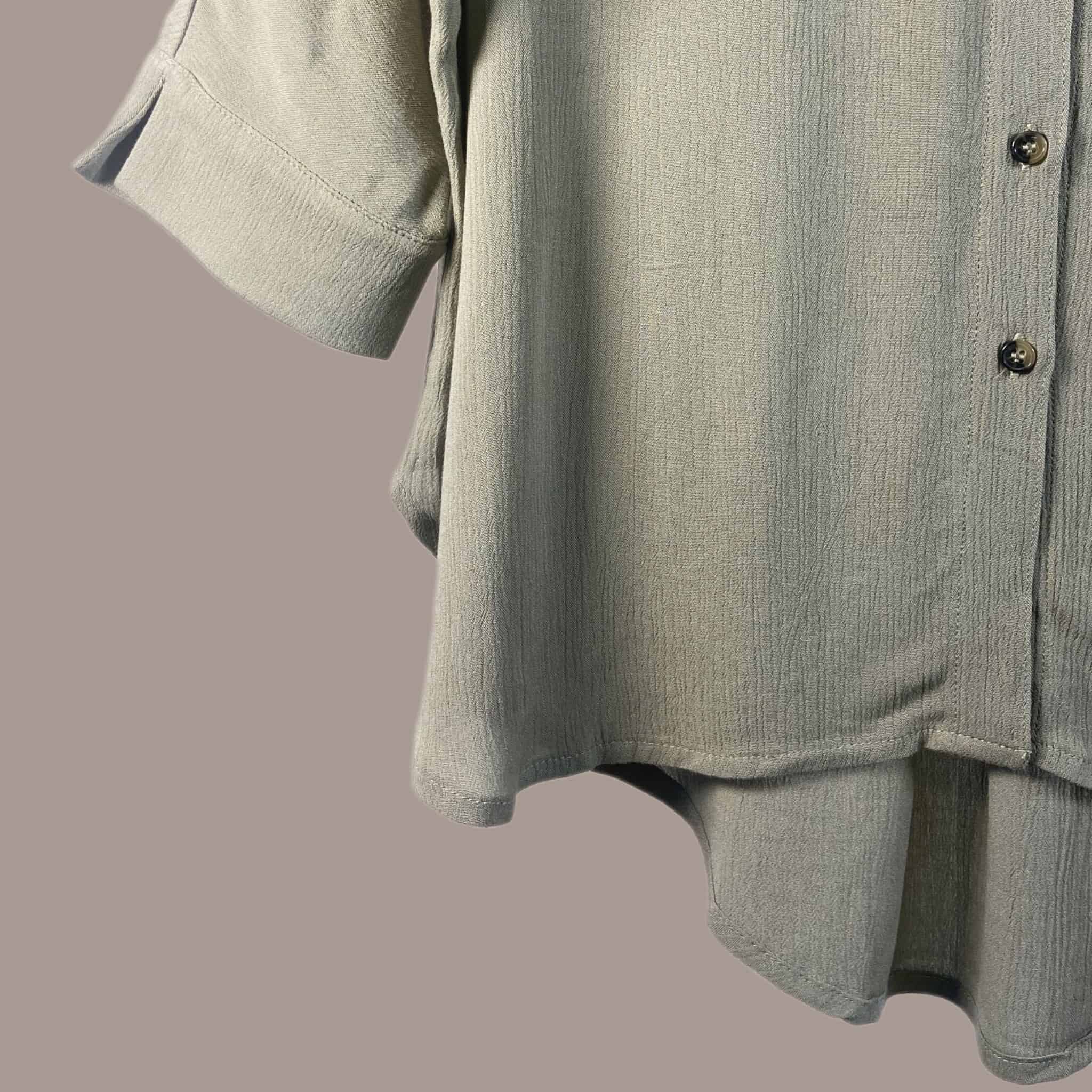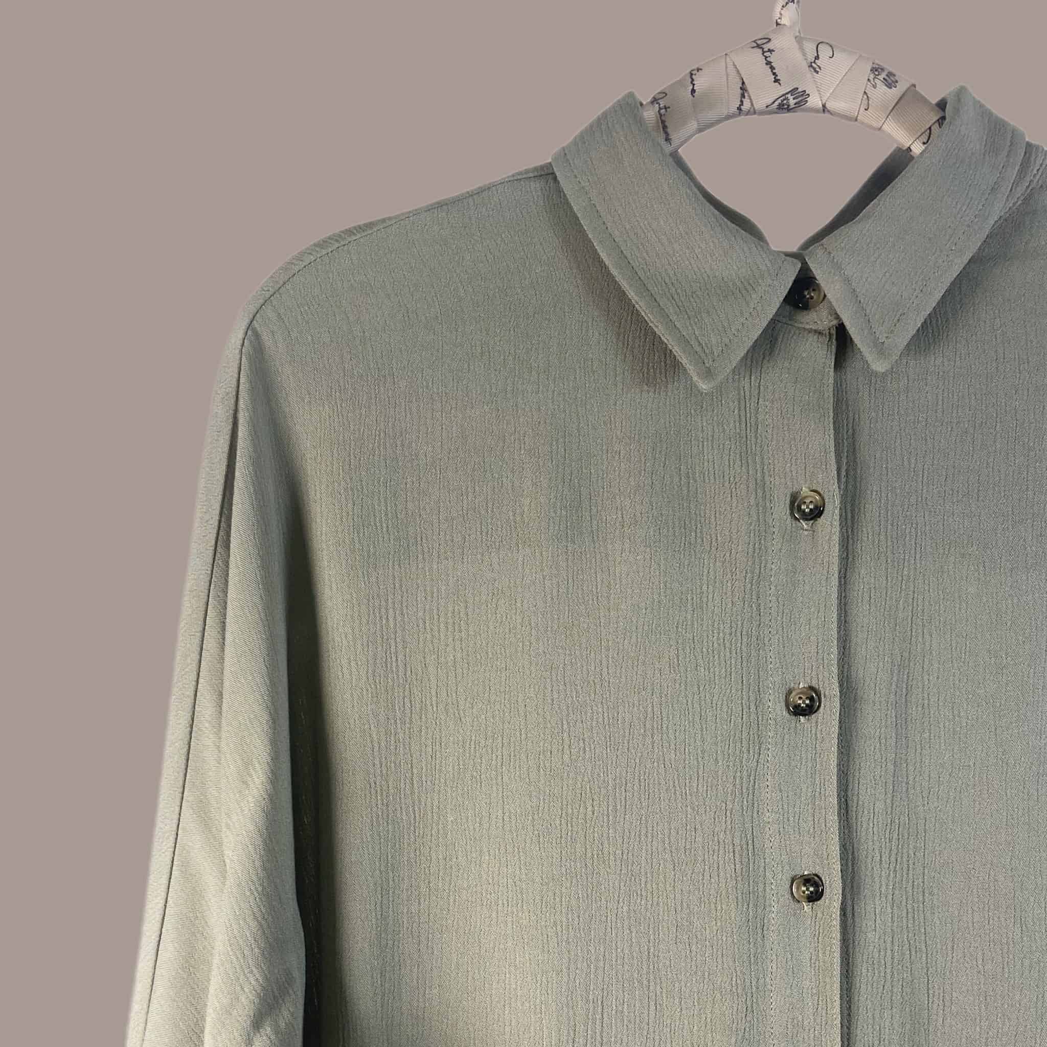 Blusa de rayón con efecto corrugado. Es una prenda súper fresca y liviana. Es de corte oversized, las mangas son de largo medio con una abertura en los puños, las cuales pueden doblarse y tiene botones marmoleados que hacen contraste.