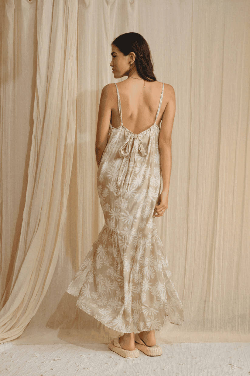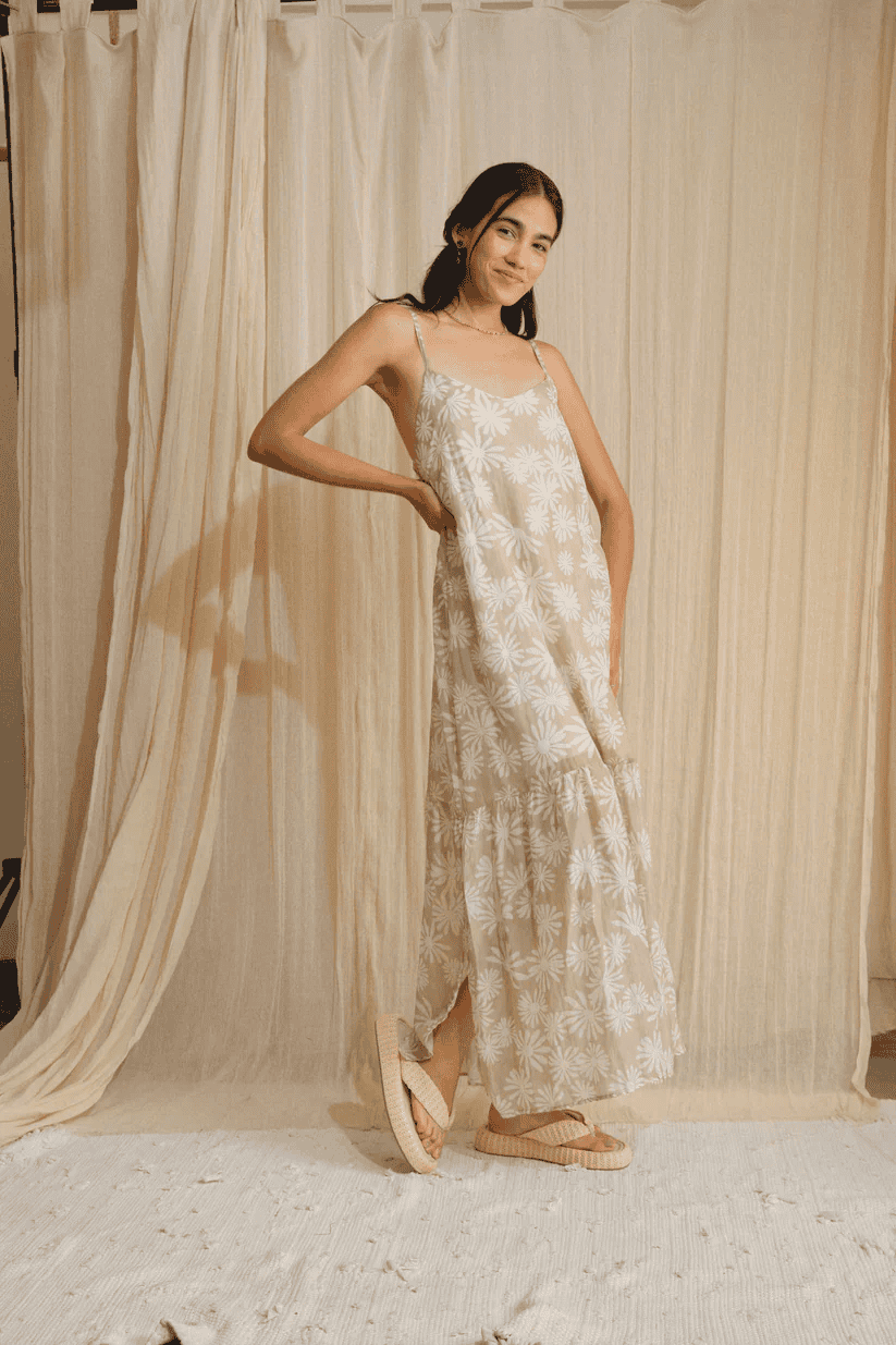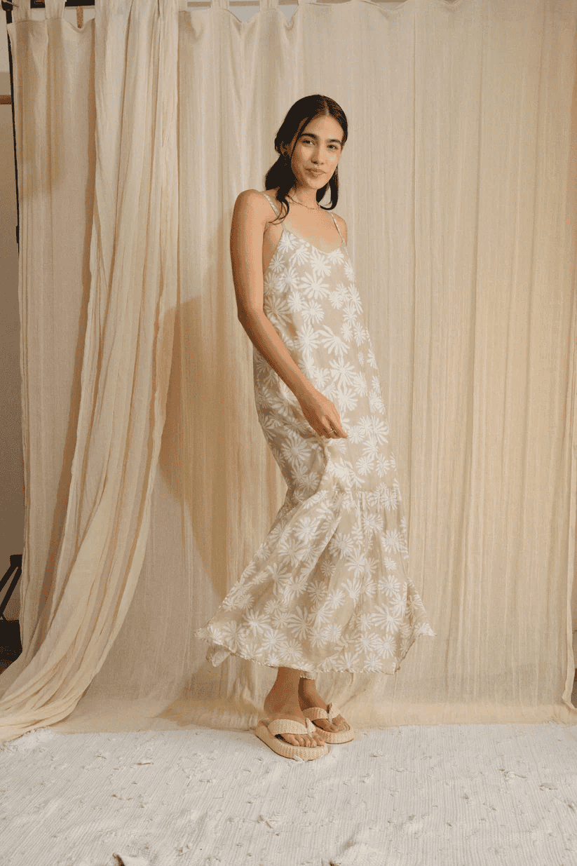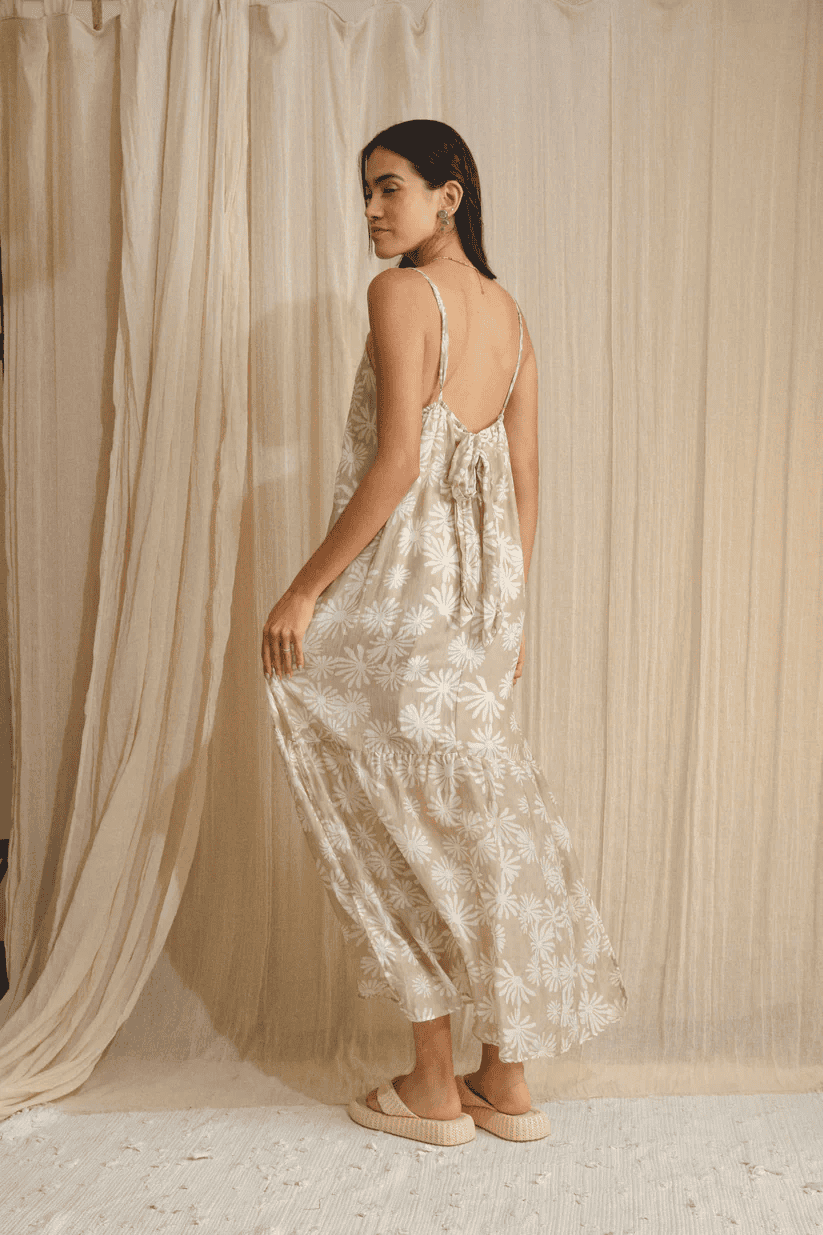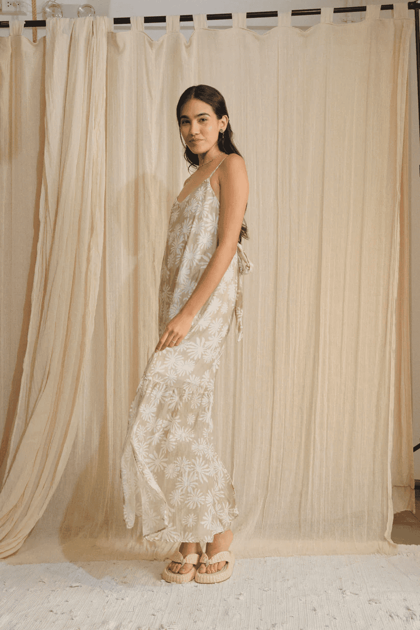 Vestido largo de chalis con tirantes ajustables. La parte trasera cuenta con elástico formando un elegante escote abierto con un toque relajado. Su diseño fluido y ligero permite libertad de movimiento. Perfecto para días soleados o eventos casuales con estilo.