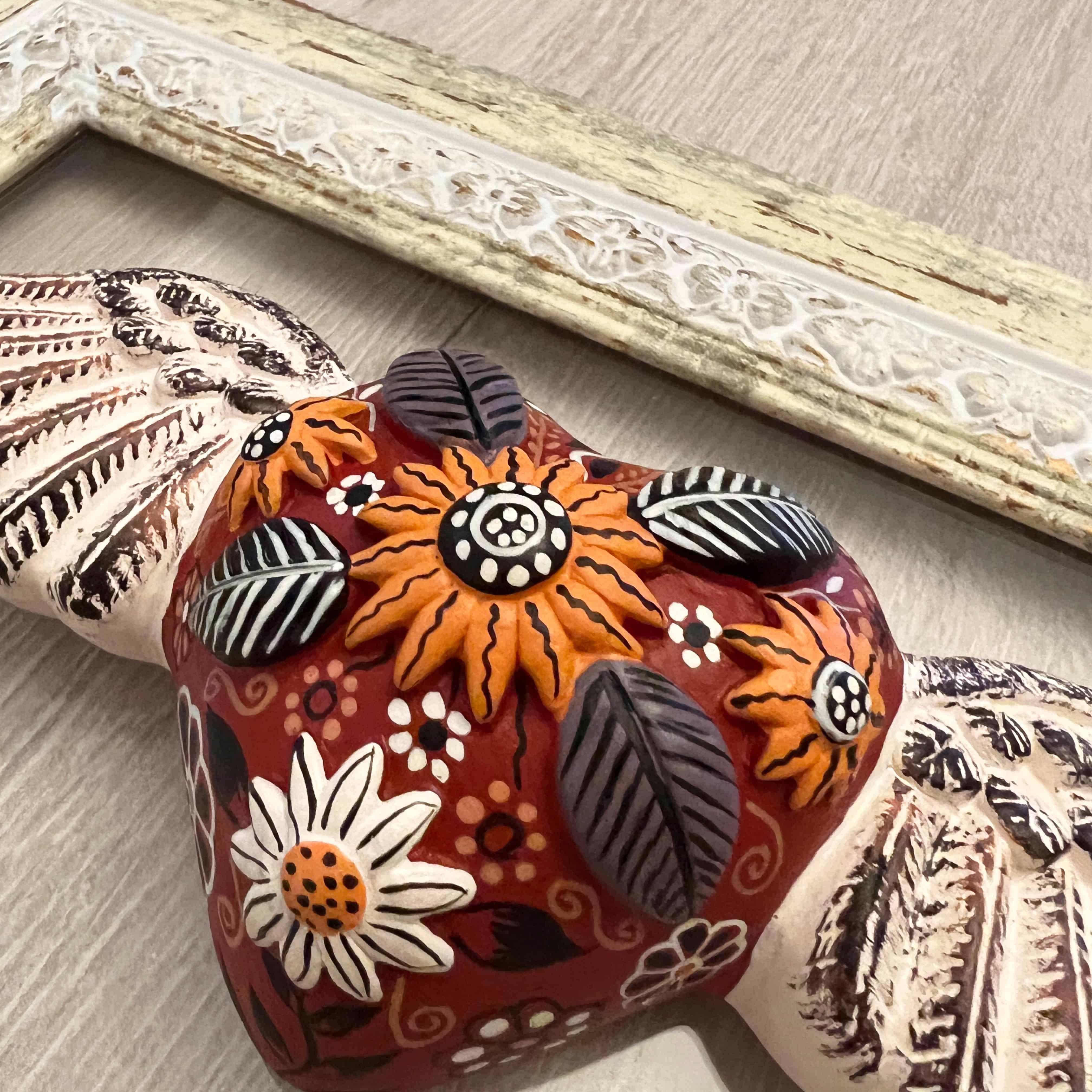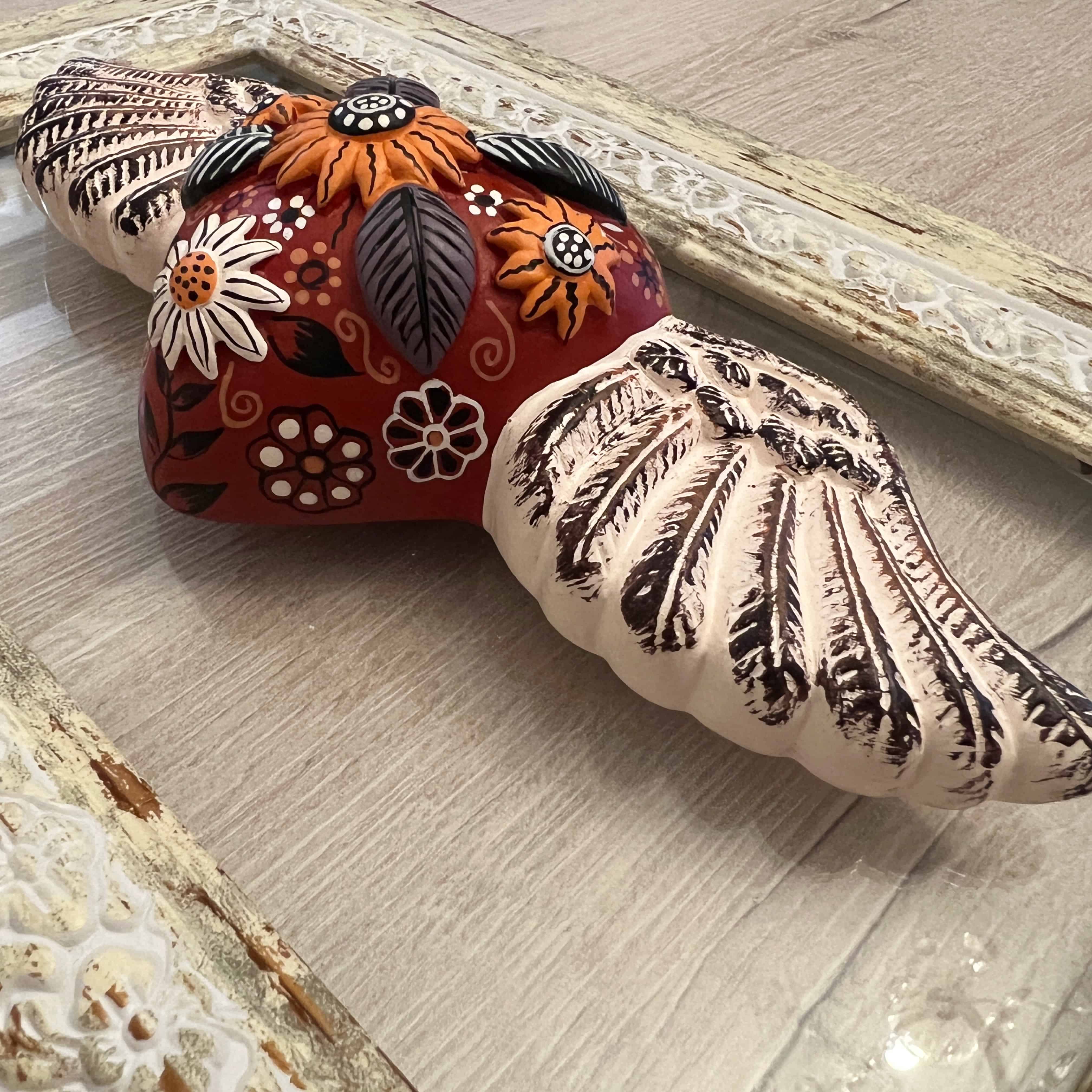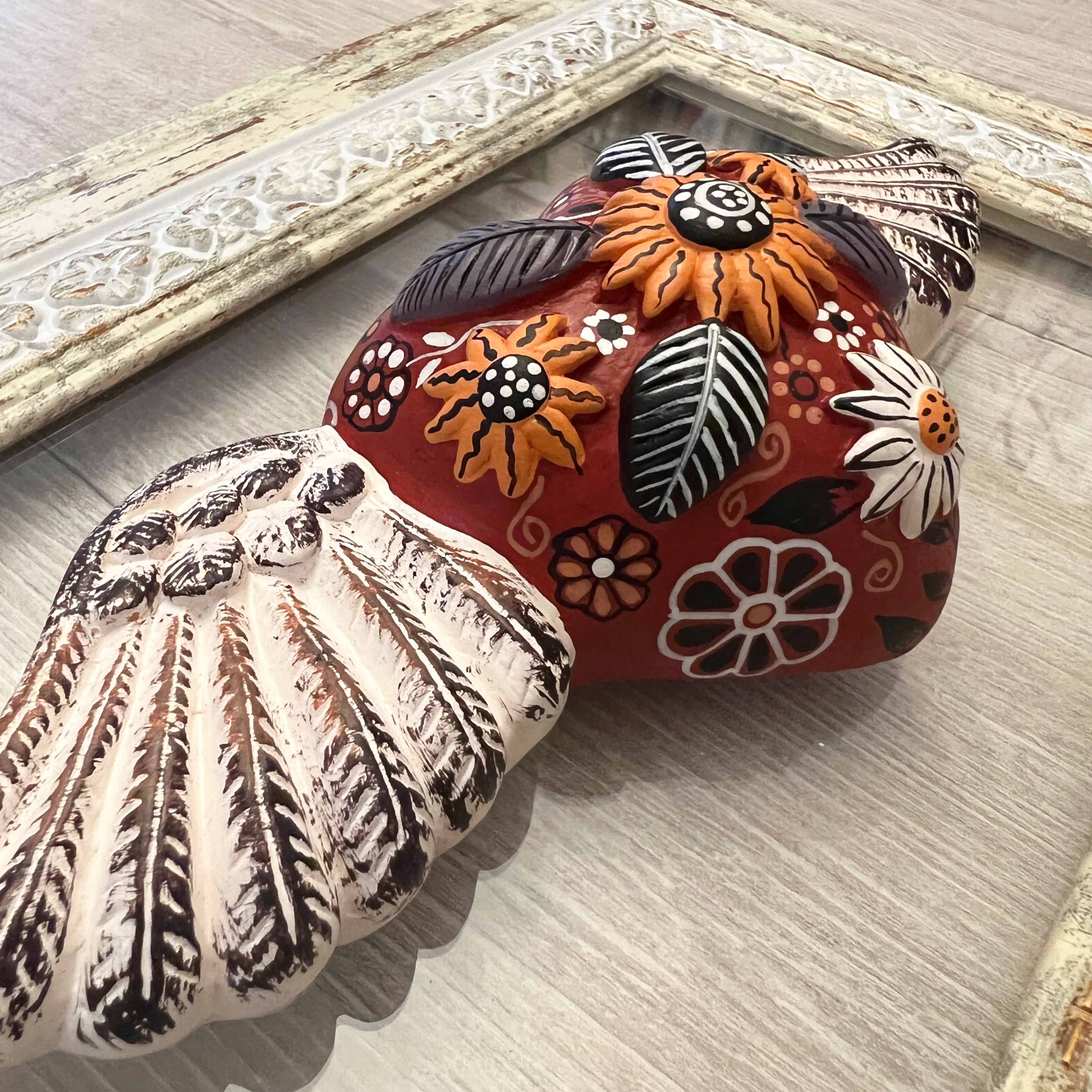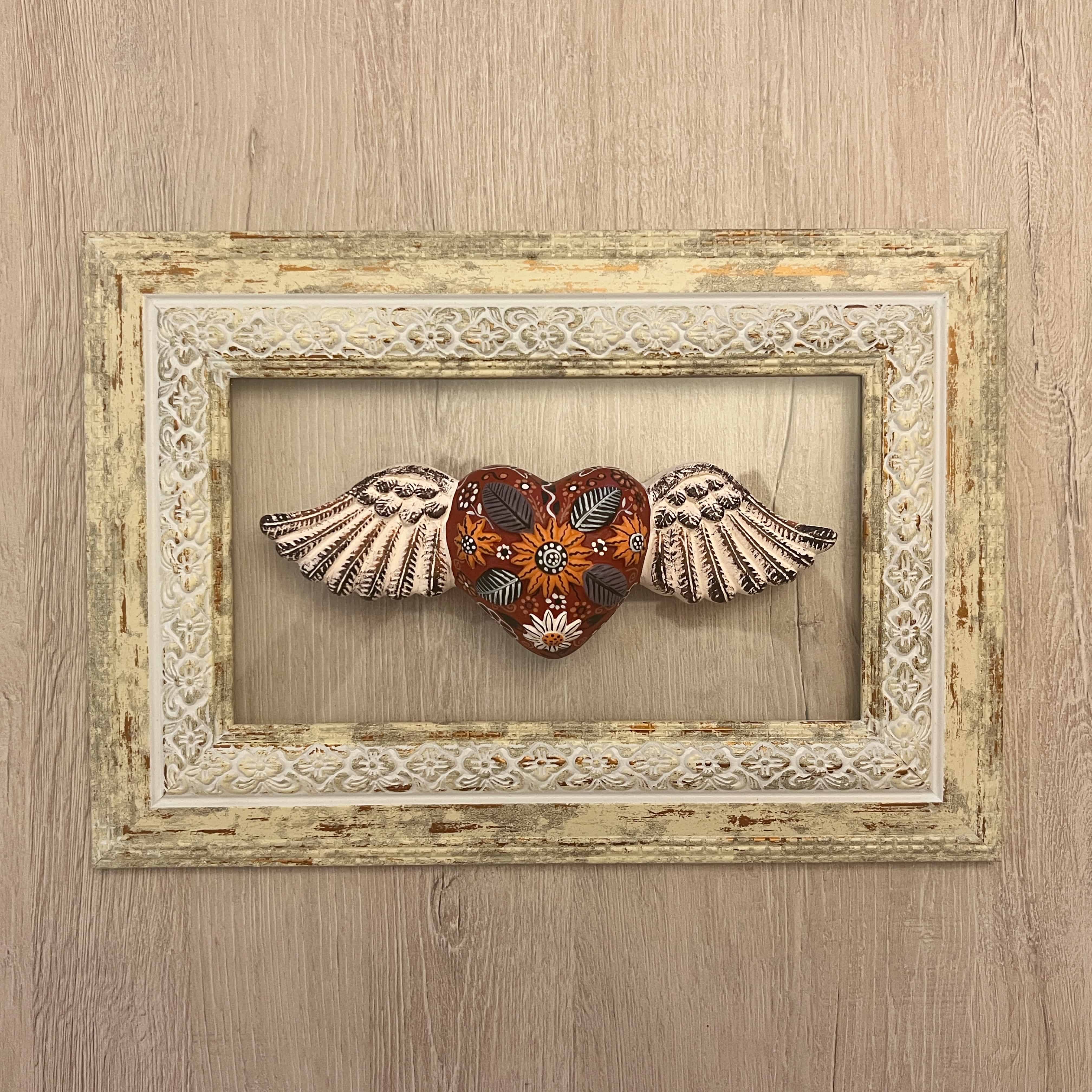 Cuadro corazón con alitas pintadas a mano por artesanos ayacuchanos, en marco italiano de cartela, pintado vintage a mano.